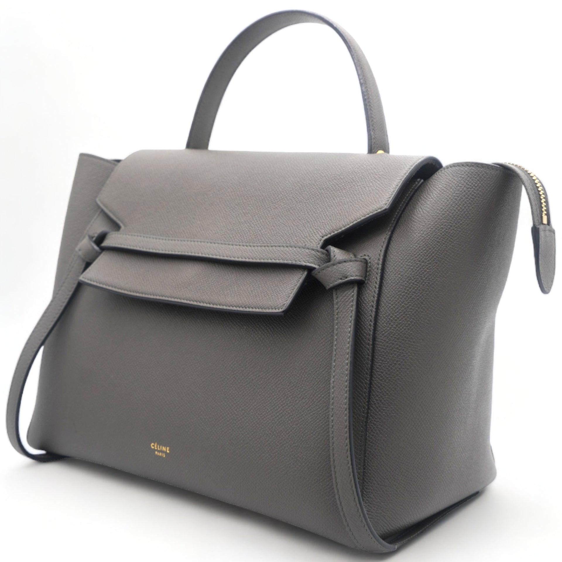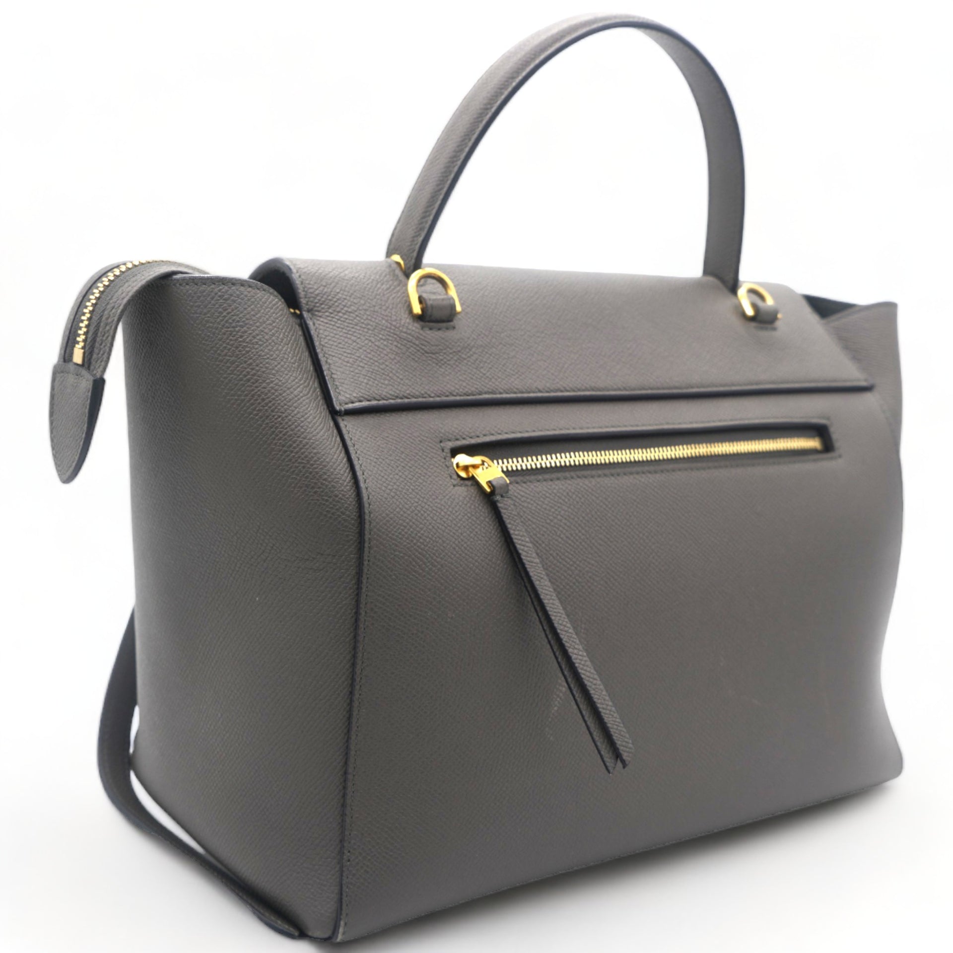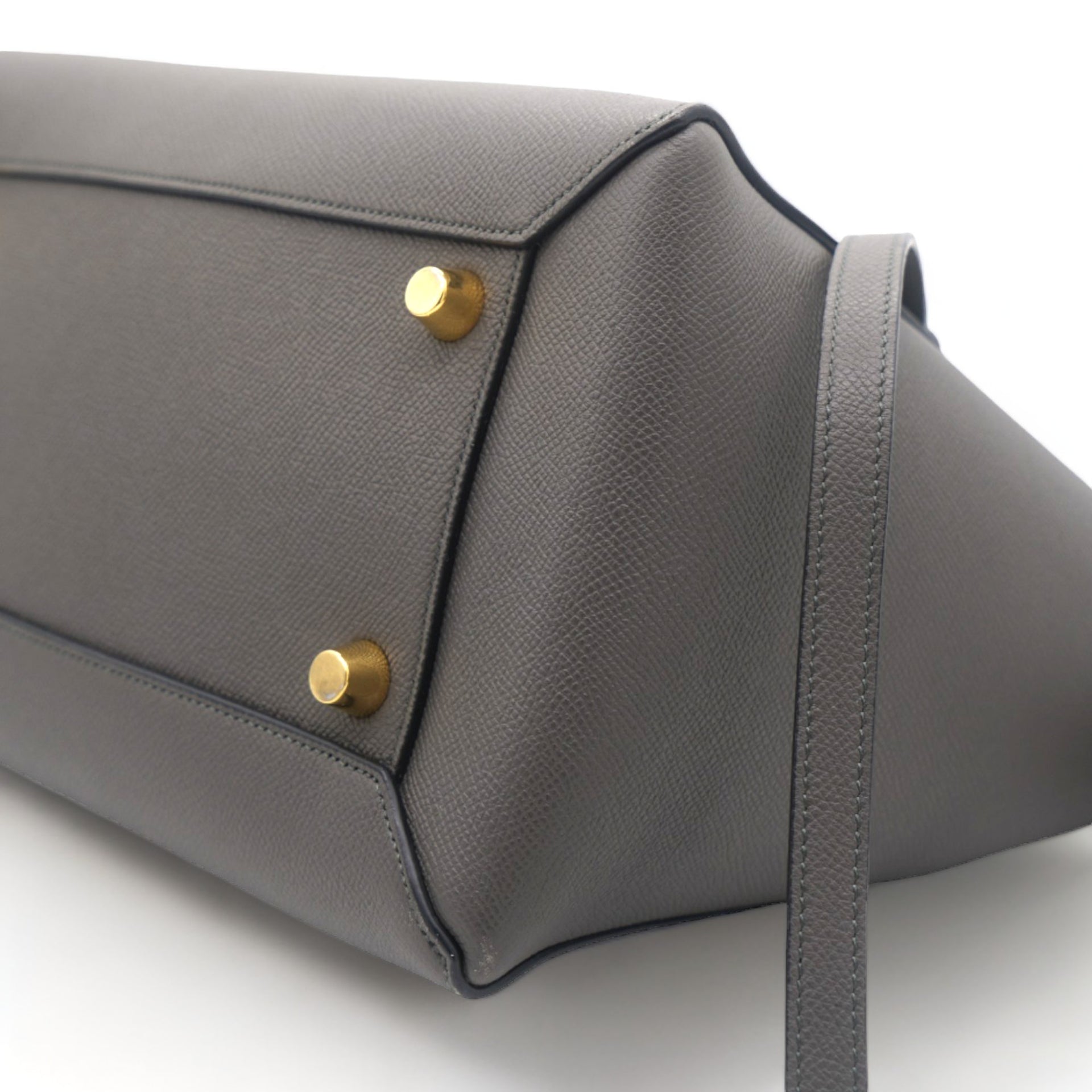 | This chic tote is crafted of richly textured calfskin leather with a structured and spacious silhouette in grey. The bag features a leather strap top handle, an optional shoulder strap, and a facing flap secured by a strap and brass button. This stunning handbag opens to a grey suede leather interior with a hanging patch pocket. detail of this |