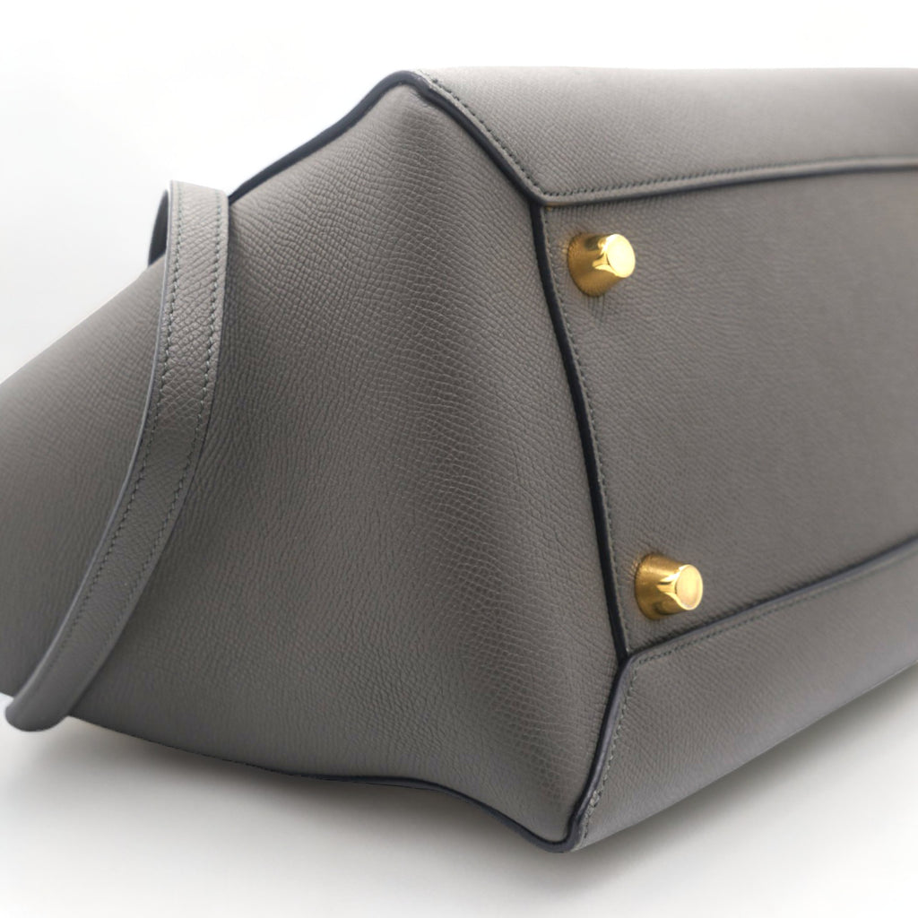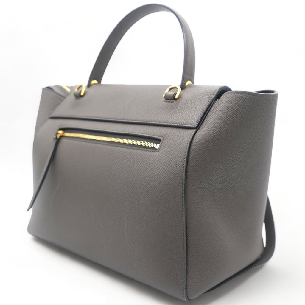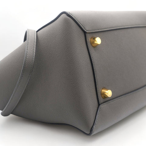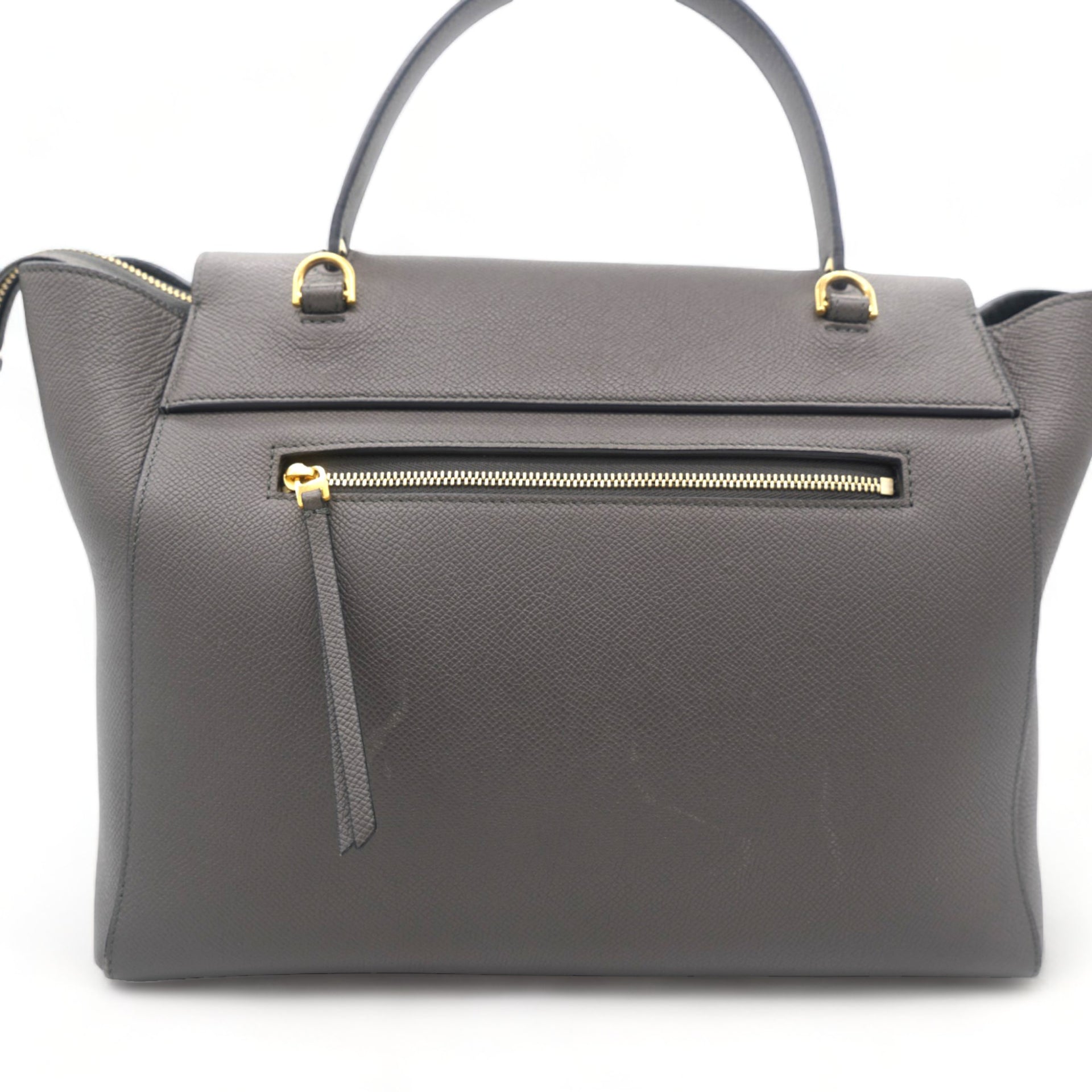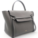 | This chic tote is crafted of richly textured calfskin leather with a structured and spacious silhouette in grey. The bag features a leather strap top handle, an optional shoulder strap, and a facing flap secured by a strap and brass button. This stunning handbag opens to a grey suede leather interior with a hanging patch pocket. detail of this |