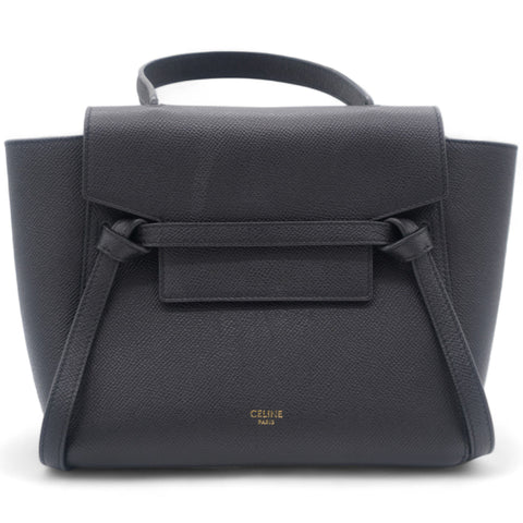 | This is an authentic CELINE Grained Calfskin Nano Belt Bag in Black. This chic tote is crafted of richly textured calfskin leather with a structured and spacious silhouette in grey. The bag features a leather strap top handle, an optional shoulder strap, and a facing flap secured by a strap and brass button. |