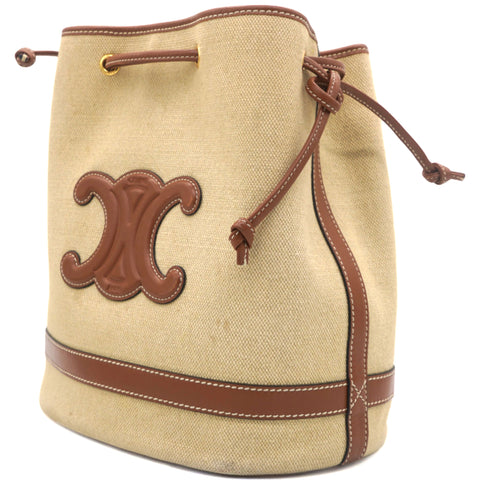 | This practical bucket bag crafted from beige textile and tan leather with the signature triomphe logo in tan leather. Opens up to beige textile lining with ample of space and zip pocket on the side. Drawstring closure and adjustable shoulder strap. |