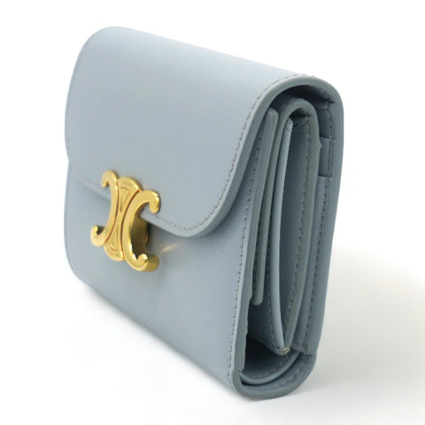 | The compact wallet in blue calfskin combines femininity and functionality. It opens out to reveal many practical features, including one folded coin pocket, five card slots, one flat pocket and one note pocket. Its envelope-style flap is sealed with a triomphe metallic snap button closure. |