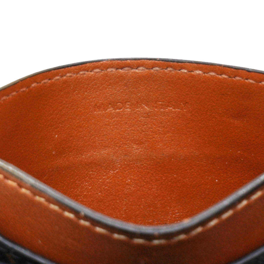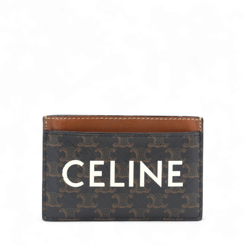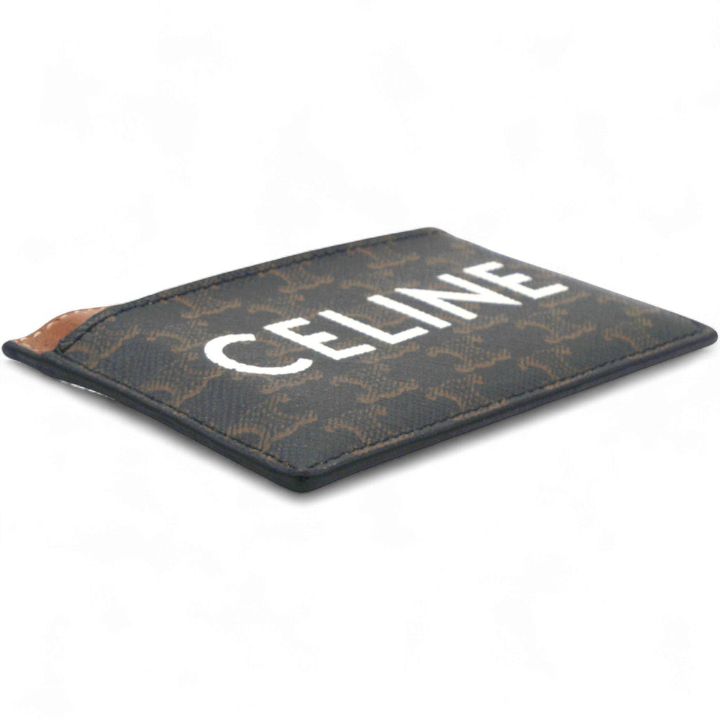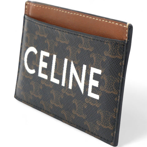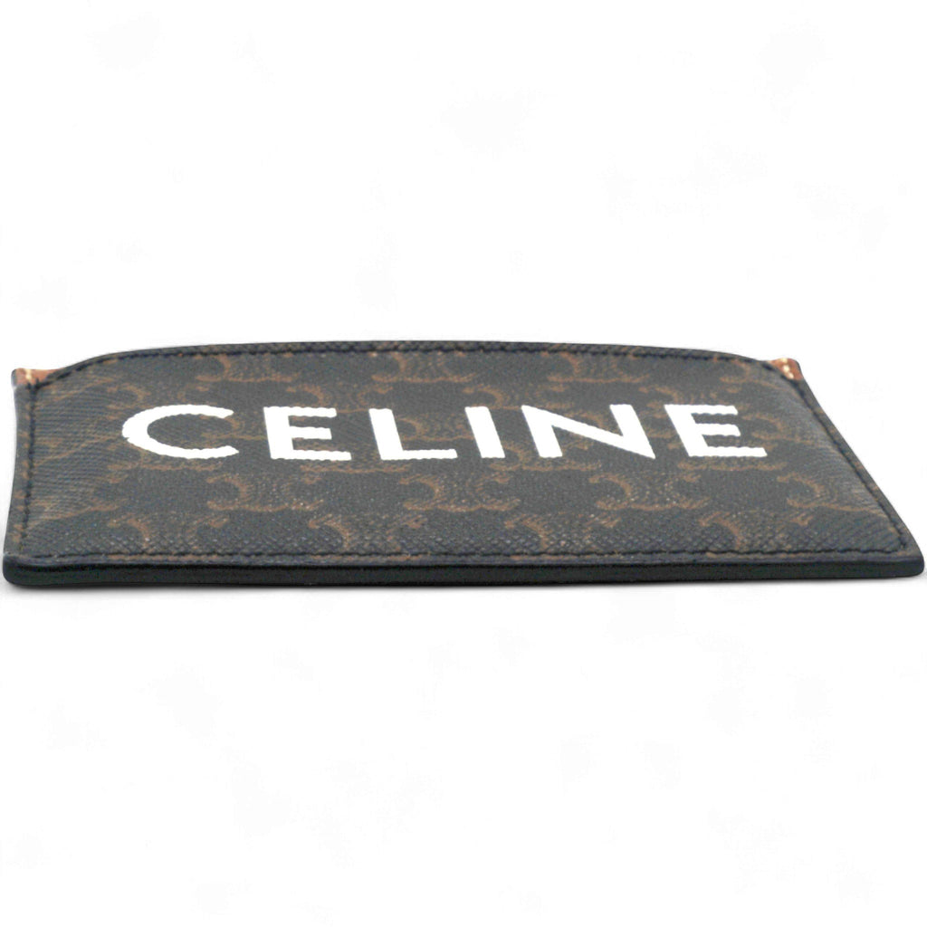 | This chic, compact card holder is crafted of monogram coated canvas with a smooth brown lambskin leather accent and the Celine logo in white. The holder has a card slot on either side of the main compartment. |
