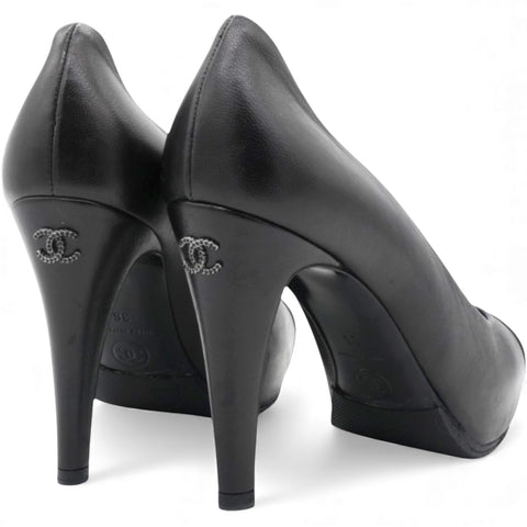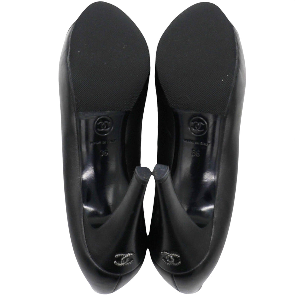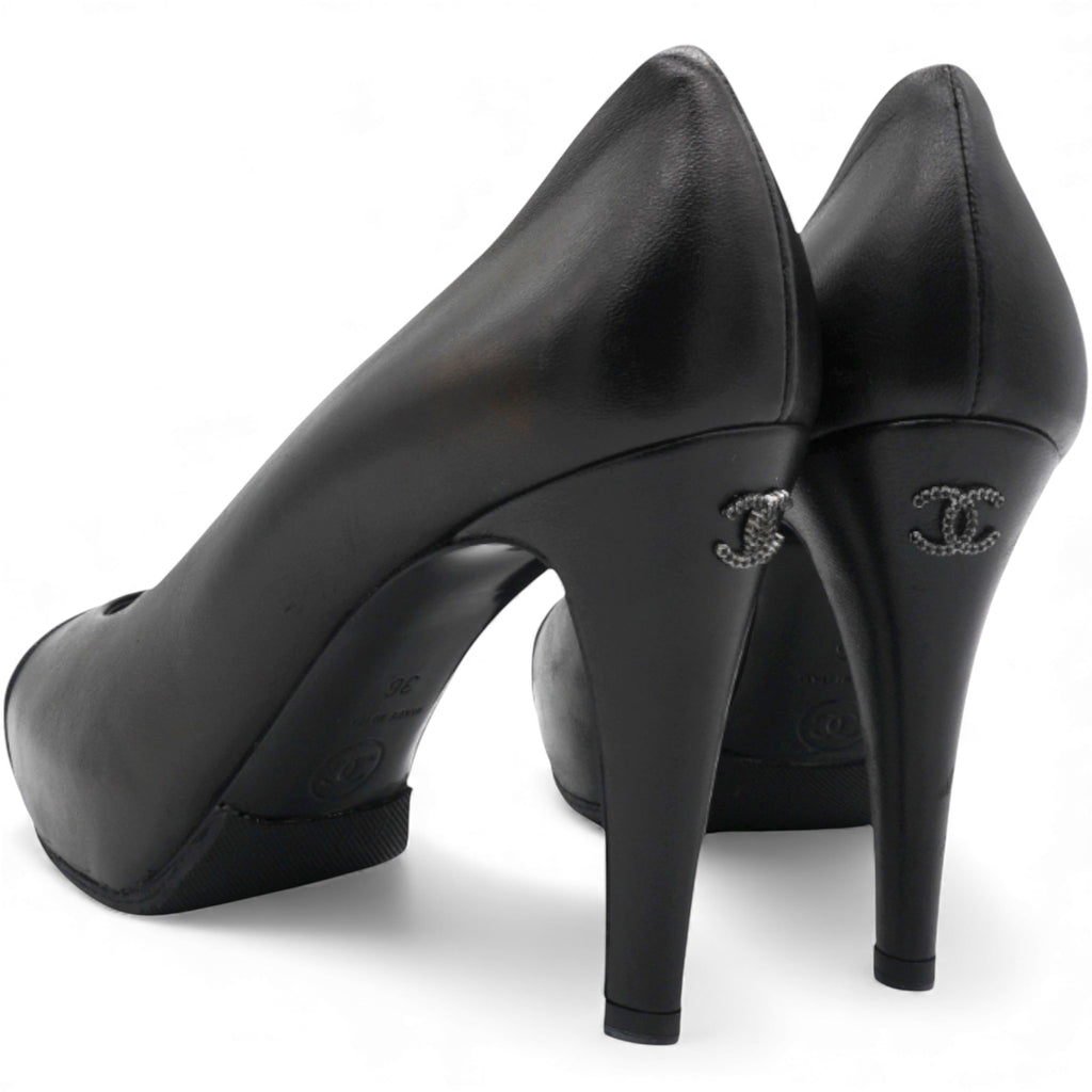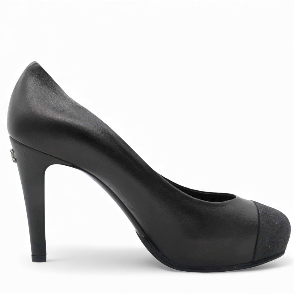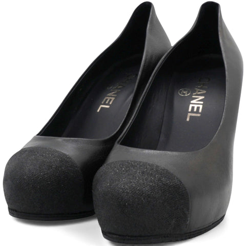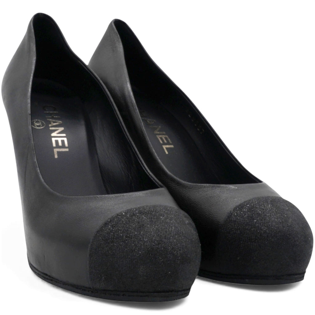 These Chanel pumps are crafted from black leather. They feature almond toes, glitter leather cap toes, CC logo on the sides, Leather insoles, and stiletto heel.