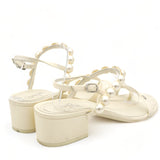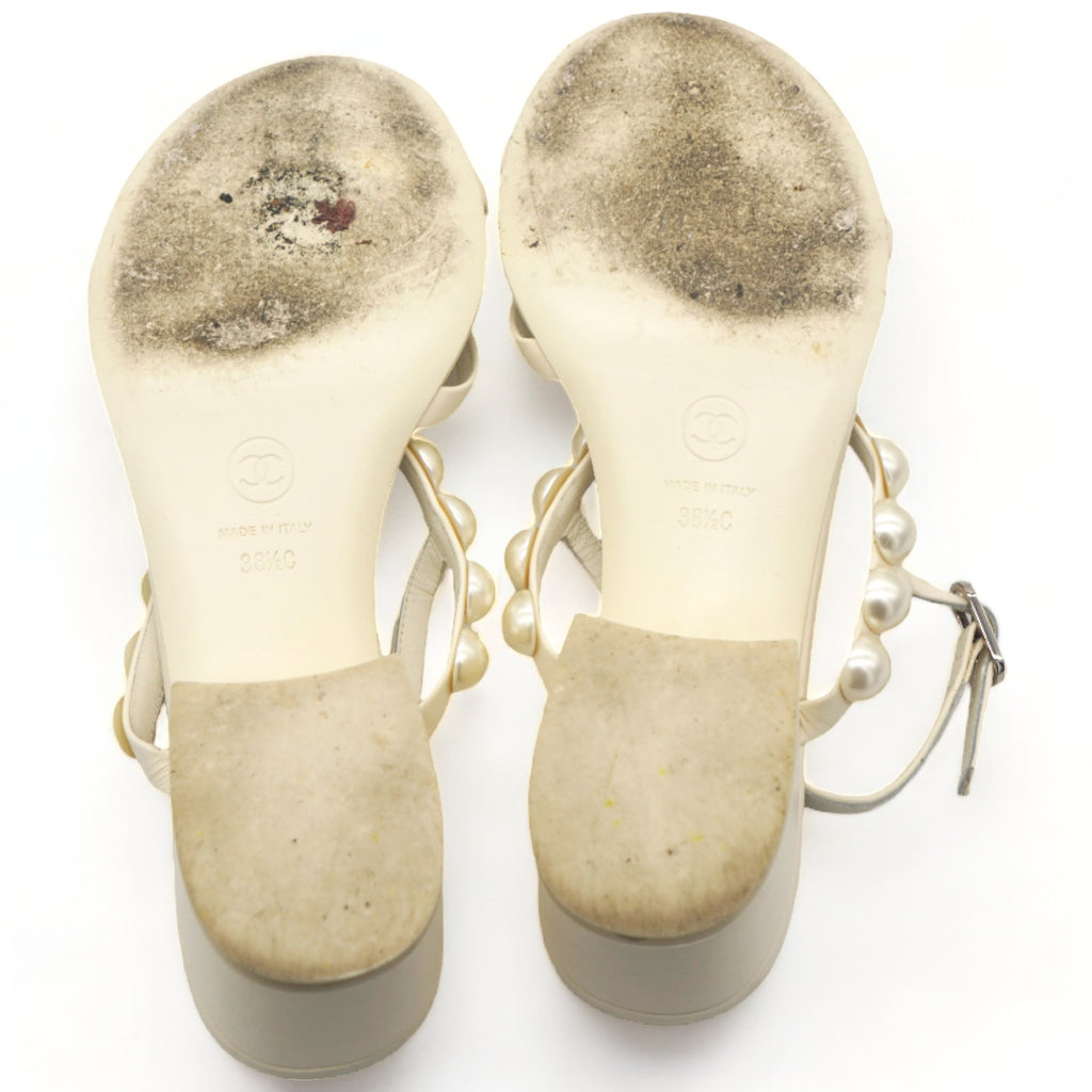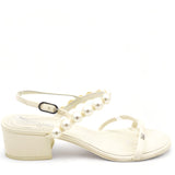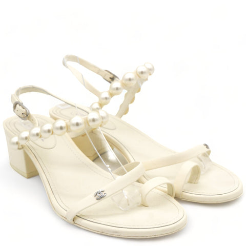 | These stunning Sling-back sandals are crafted of smooth cream leather uppers with adjustable ankle straps and feature a row of white pearls on each shoe, trimmed with a small clival pearl encrusted CC logo and 4.5 cm heels. |