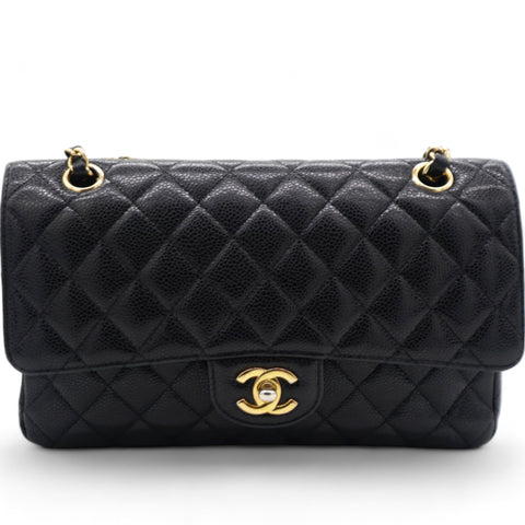 | This chic shoulder bag is crafted of diamond quilted caviar leather in black. The bag features a gold chain link leather threaded shoulder strap and front flap with a gold Chanel CC turn lock. The flap opens to an inner flap and a burgundy leather interior with patch pockets. |