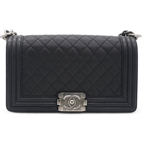 | This stylish shoulder bag is crafted of luxuriously soft diamond quilted lambskin leather with linear quilted borders in black. The bag features a ruthenium chain link shoulder strap with a leather shoulder pad and ruthenium Chanel boy CC push lock. This opens the full flap to a black fabric interior with zipper and flat pockets. |