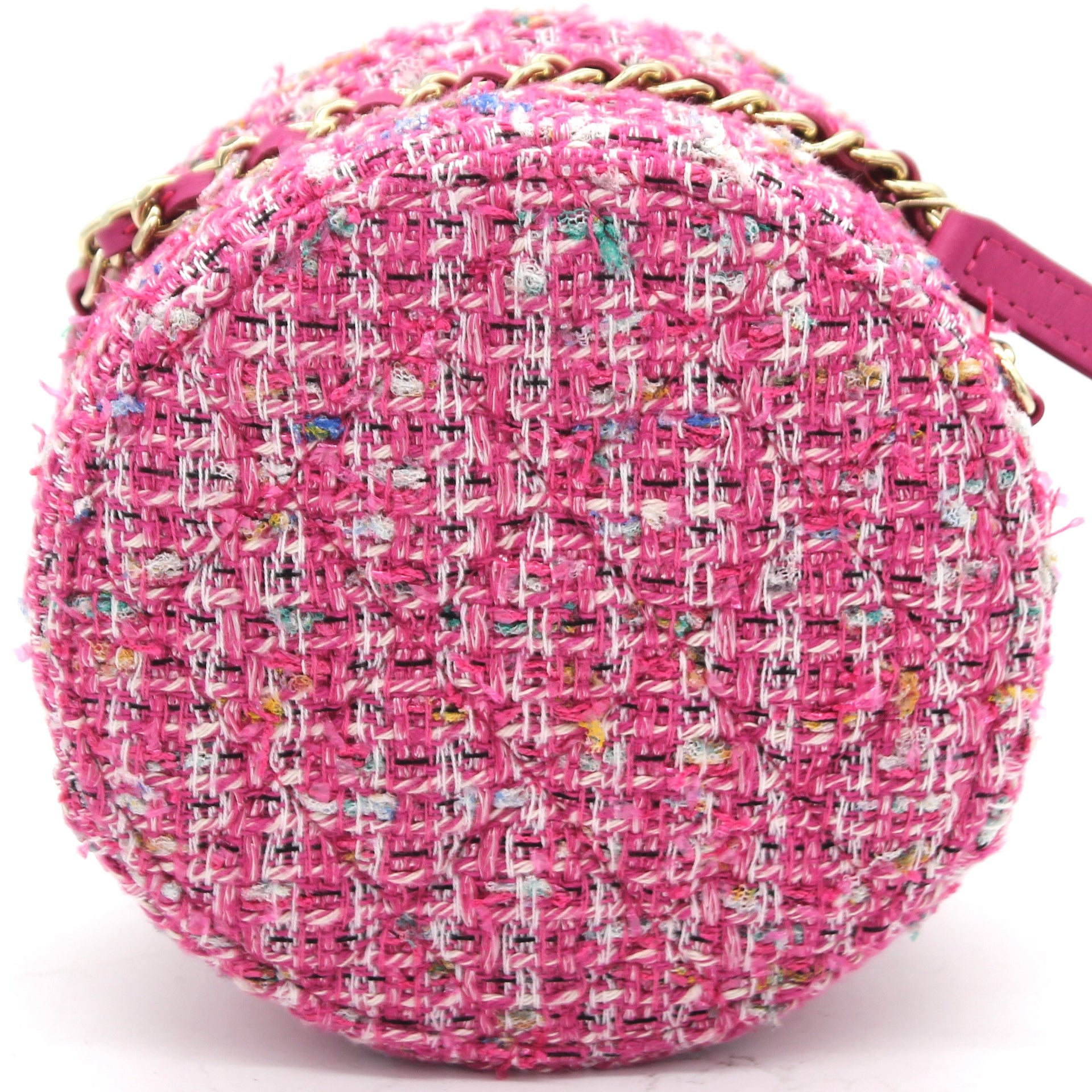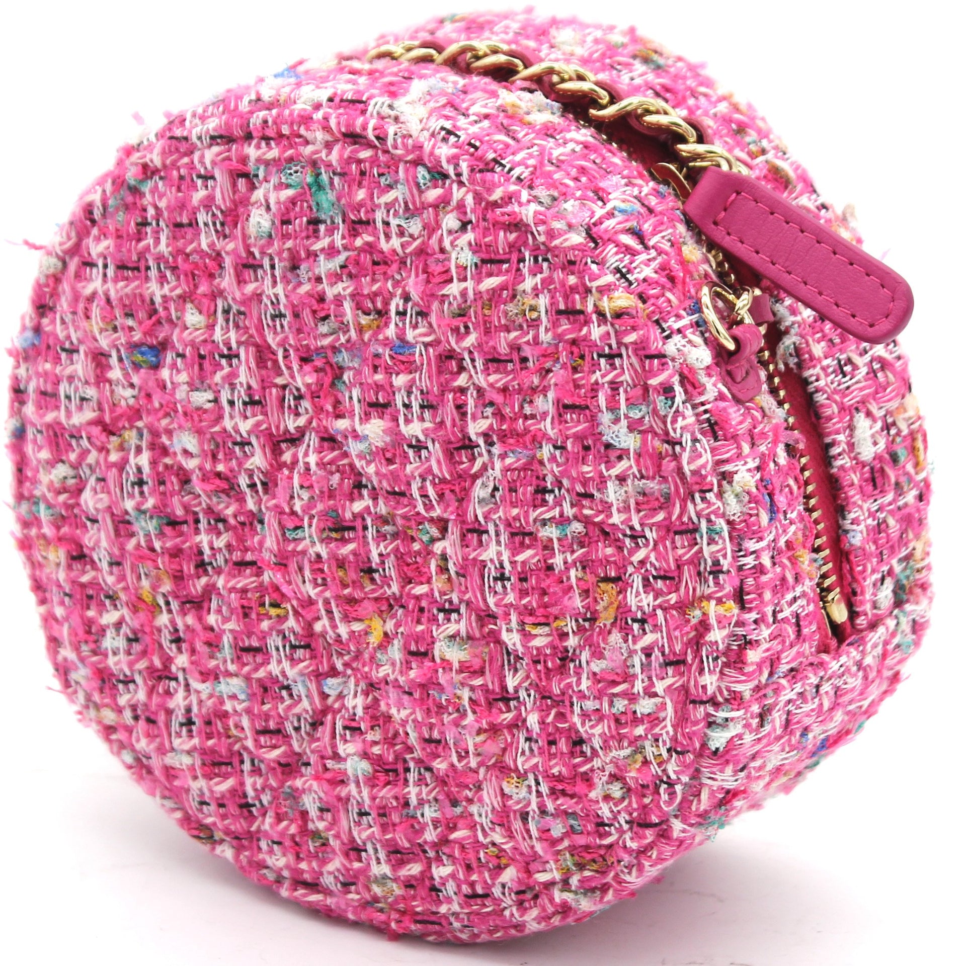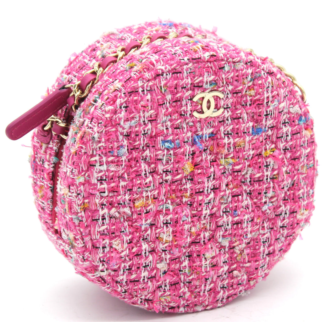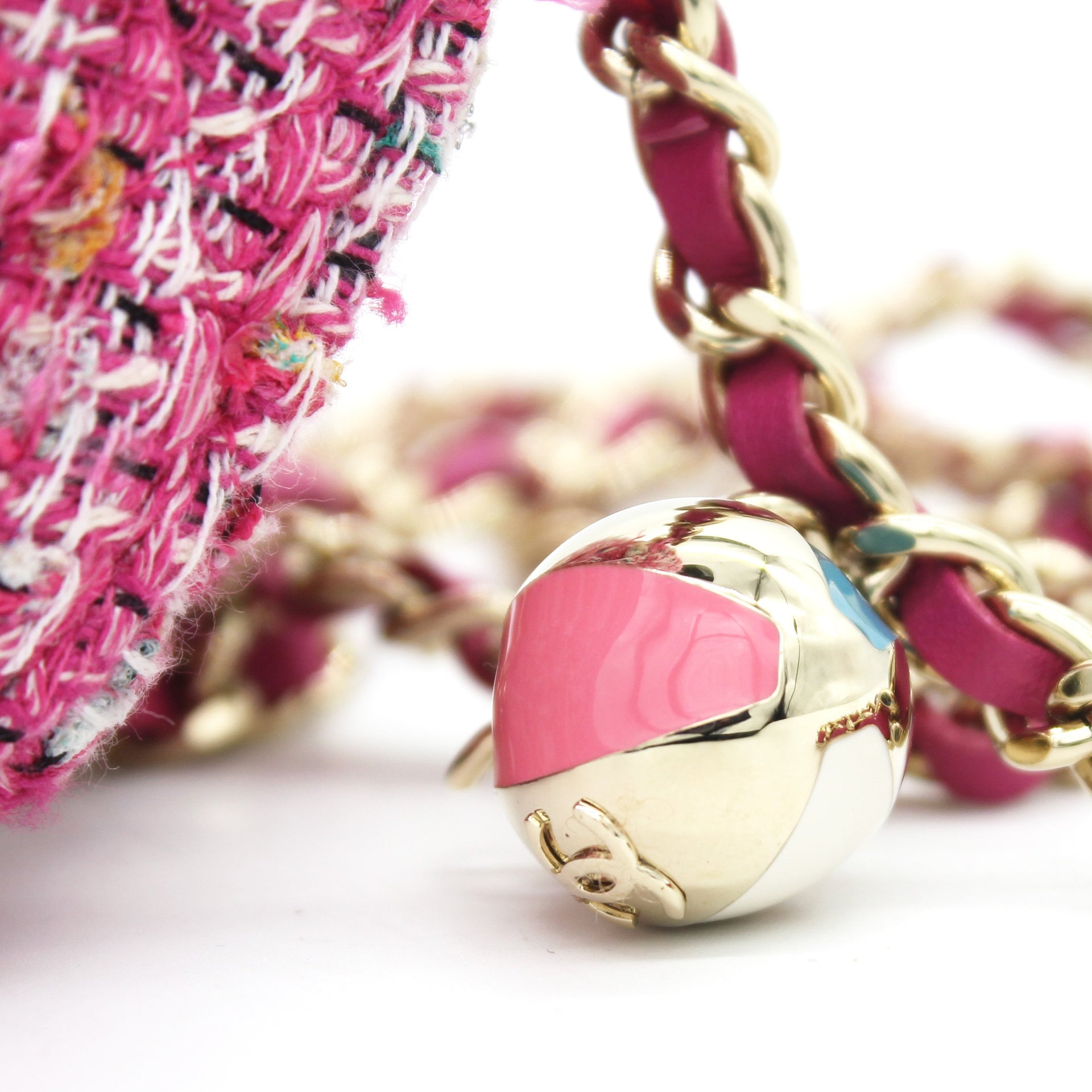 | This stylish crossbody bag is crafted of luxurious tweed in multicolors. The bag features a polished light gold chain link leather threaded shoulder strap, a hanging ball embellishment and a gold-tone CC logo on the front. This shoulder bag opens with a top zipper to a pink fabric interior with a patch pocket. |