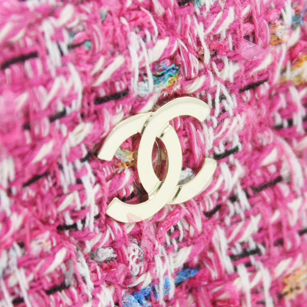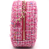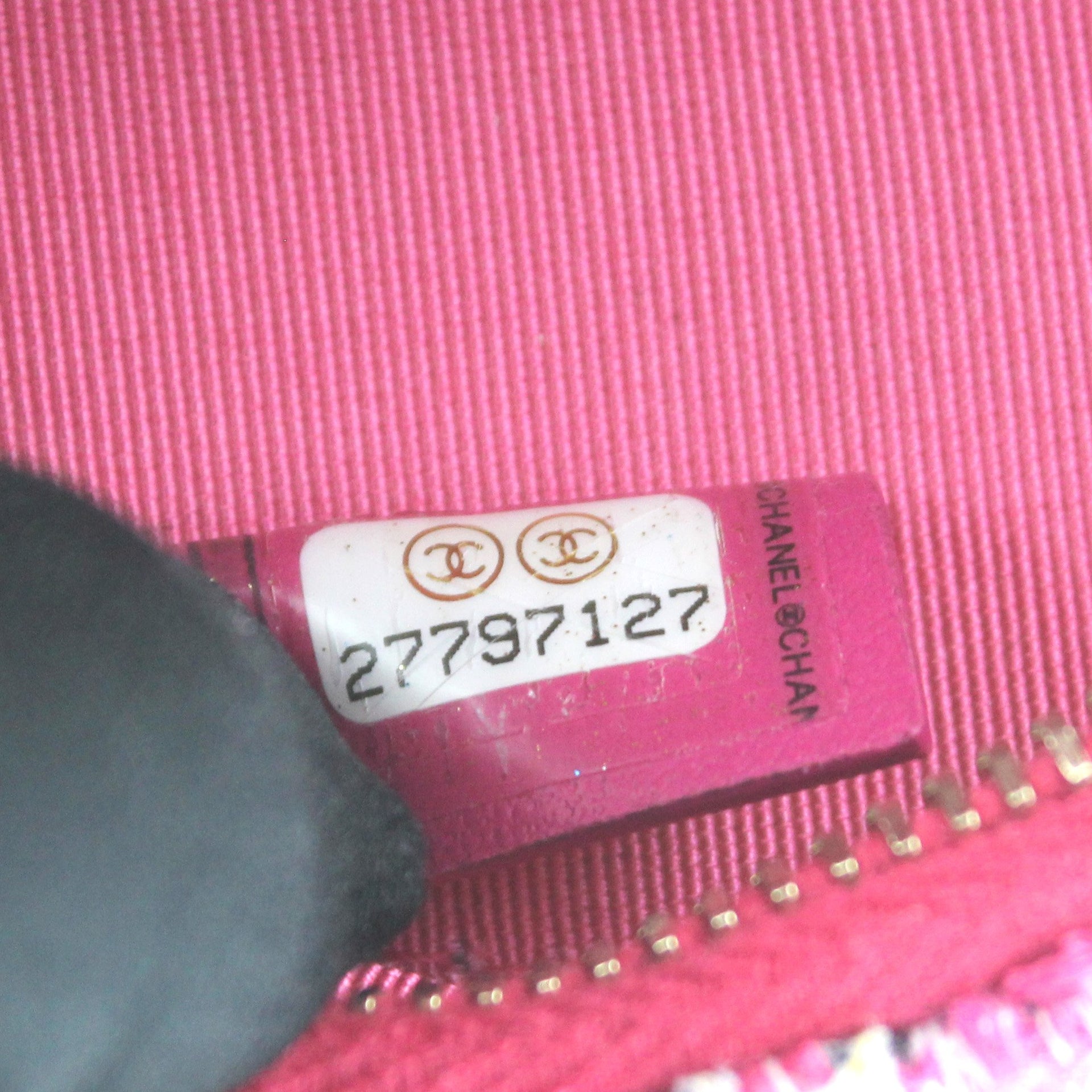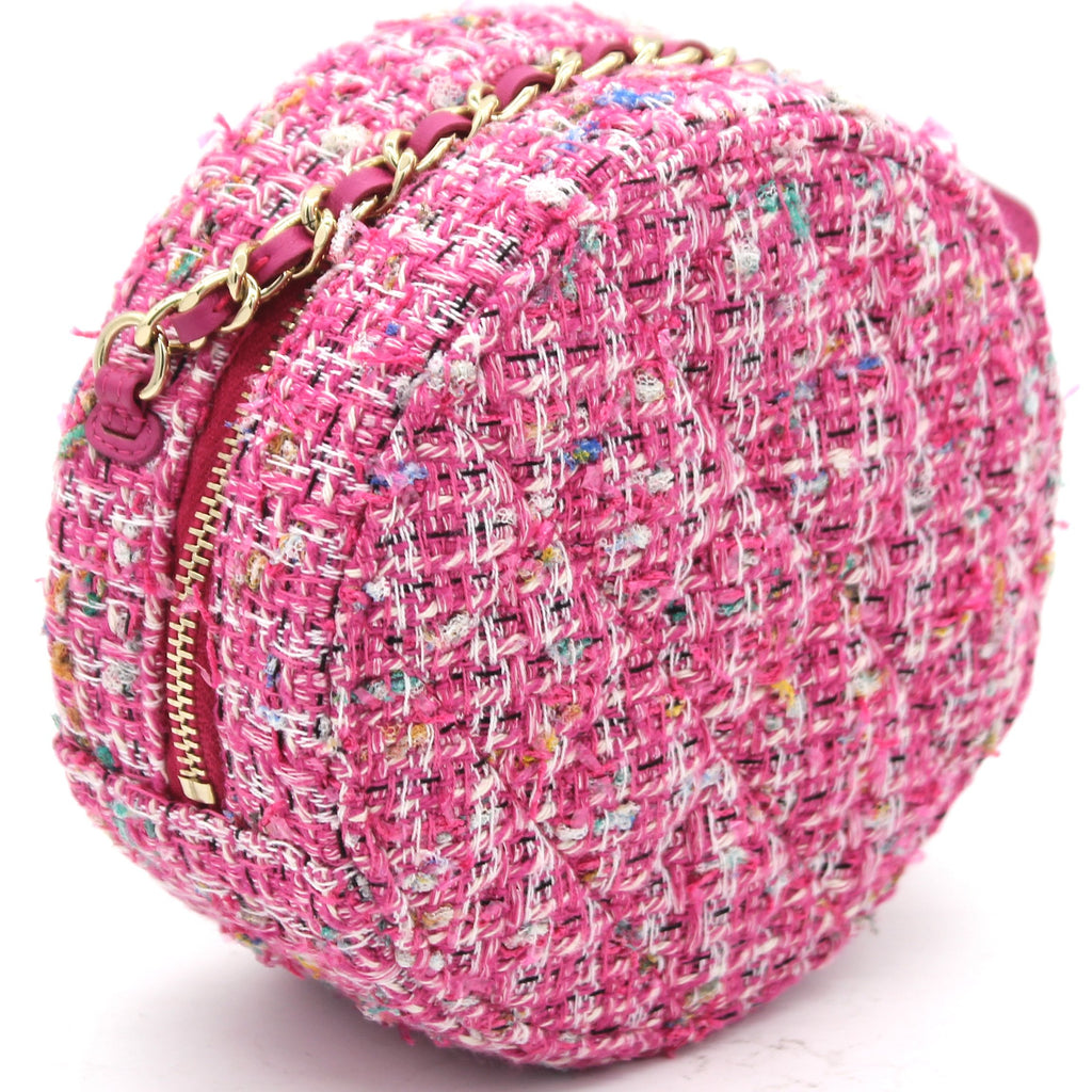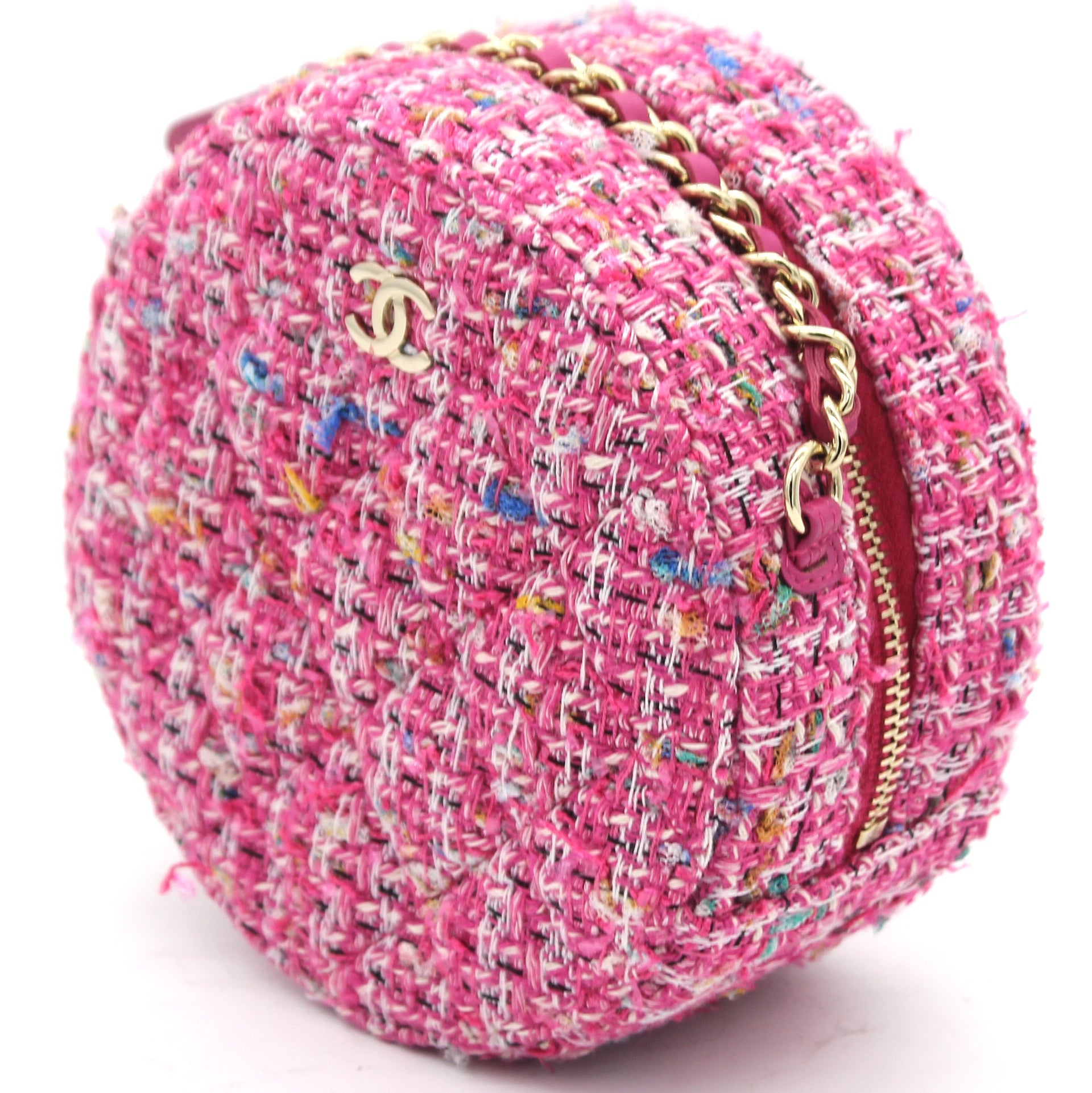 | This stylish crossbody bag is crafted of luxurious tweed in multicolors. The bag features a polished light gold chain link leather threaded shoulder strap, a hanging ball embellishment and a gold-tone CC logo on the front. This shoulder bag opens with a top zipper to a pink fabric interior with a patch pocket. |