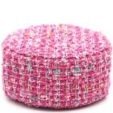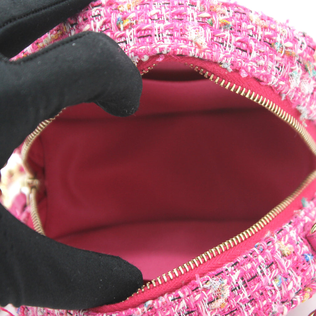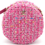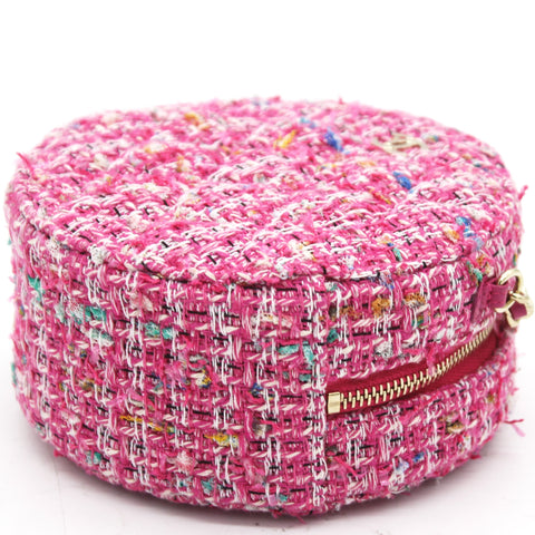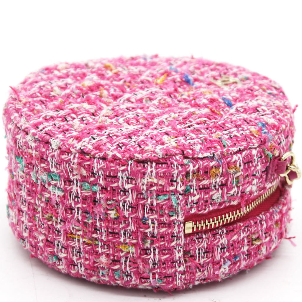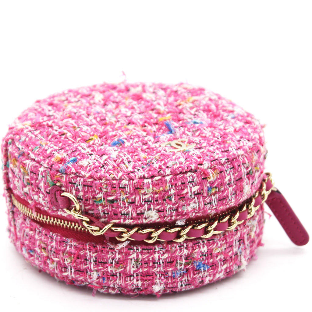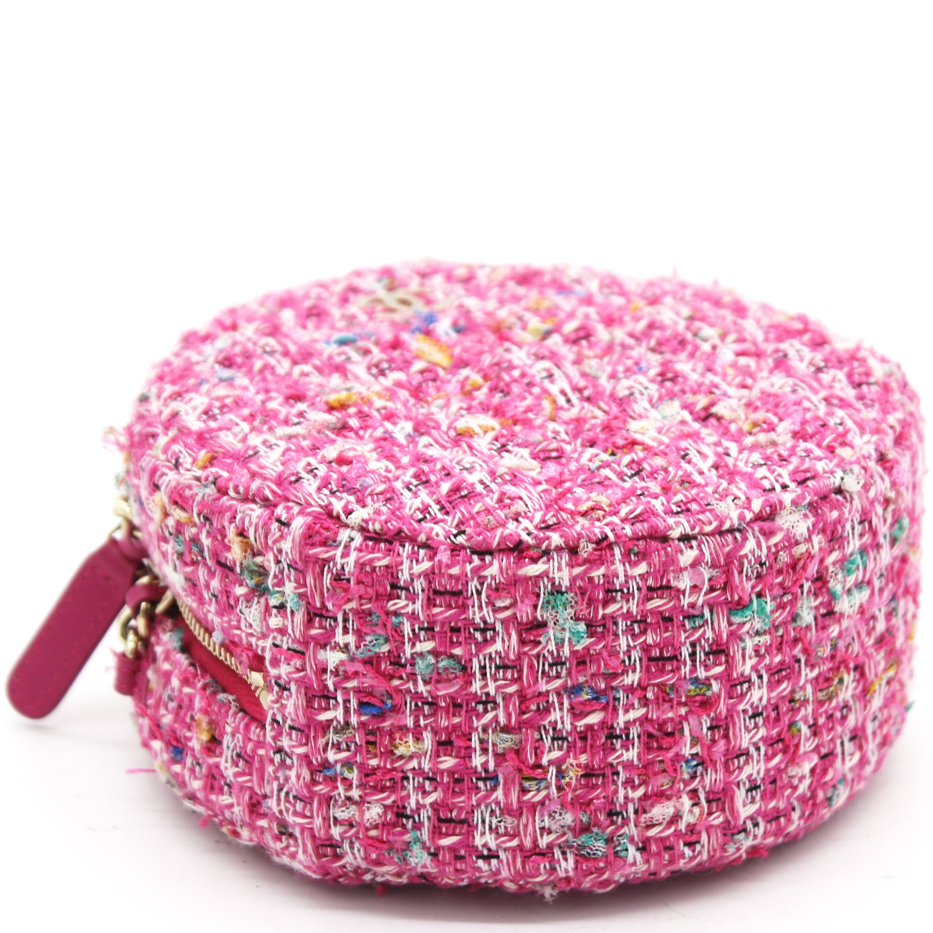 | This stylish crossbody bag is crafted of luxurious tweed in multicolors. The bag features a polished light gold chain link leather threaded shoulder strap, a hanging ball embellishment and a gold-tone CC logo on the front. This shoulder bag opens with a top zipper to a pink fabric interior with a patch pocket. |