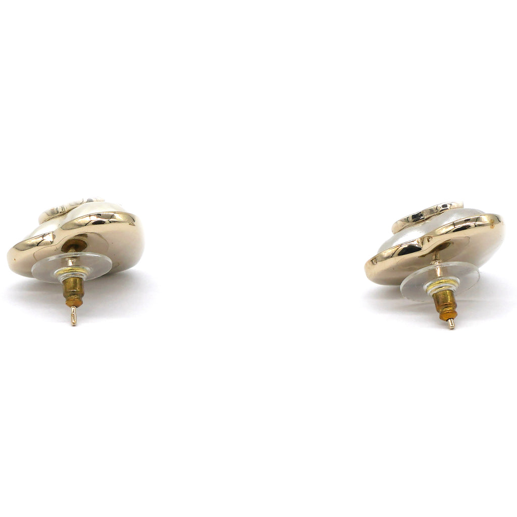 | This is an authentic pair of CHANEL Pearl CC Heart Earrings in Gold. These elegant earrings feature a white resin pearl heart-shaped stud with a crystal-encrusted CC logo in the middle. |