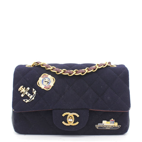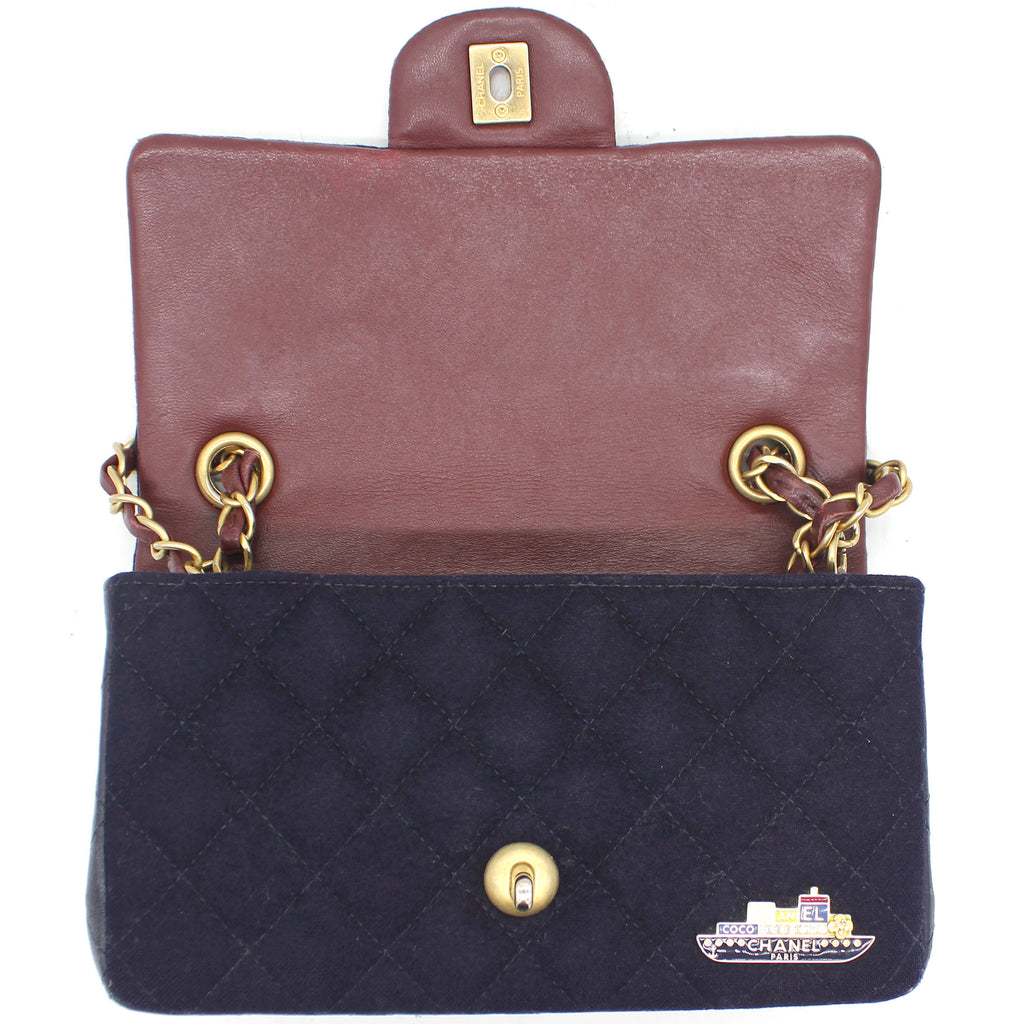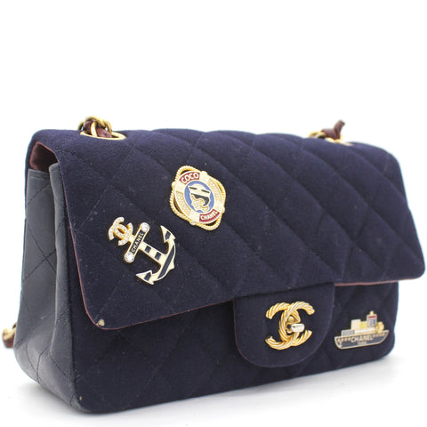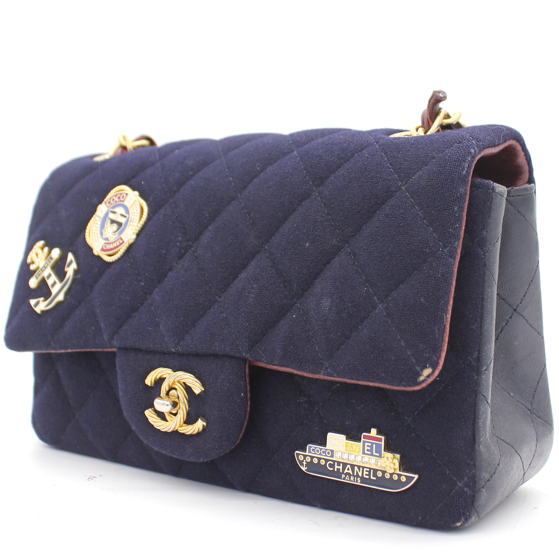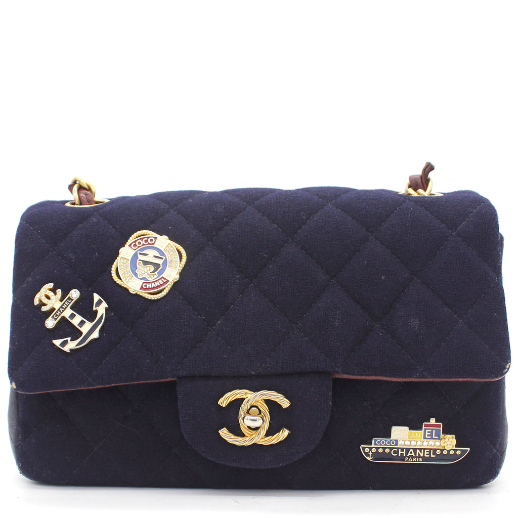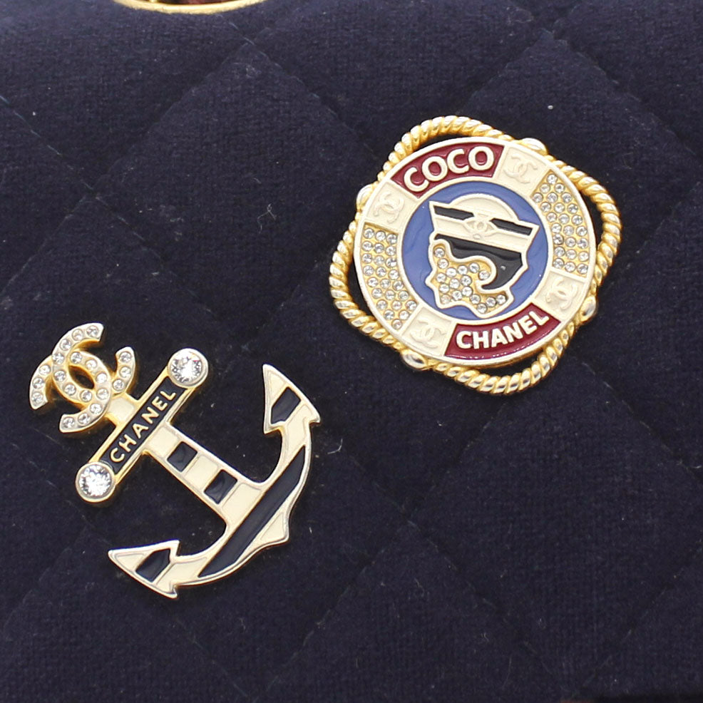 | This chic bag features quilted felt fabric in navy blue. The unique feature of this bag are the nautical charm embellishments. The bag features a long chain red leather and aged gold shoulder strap that can be worn cross body. The flap opens with a detailed aged gold CC Chanel turn lock to a red leather interior with a zipper and patch pocket. |