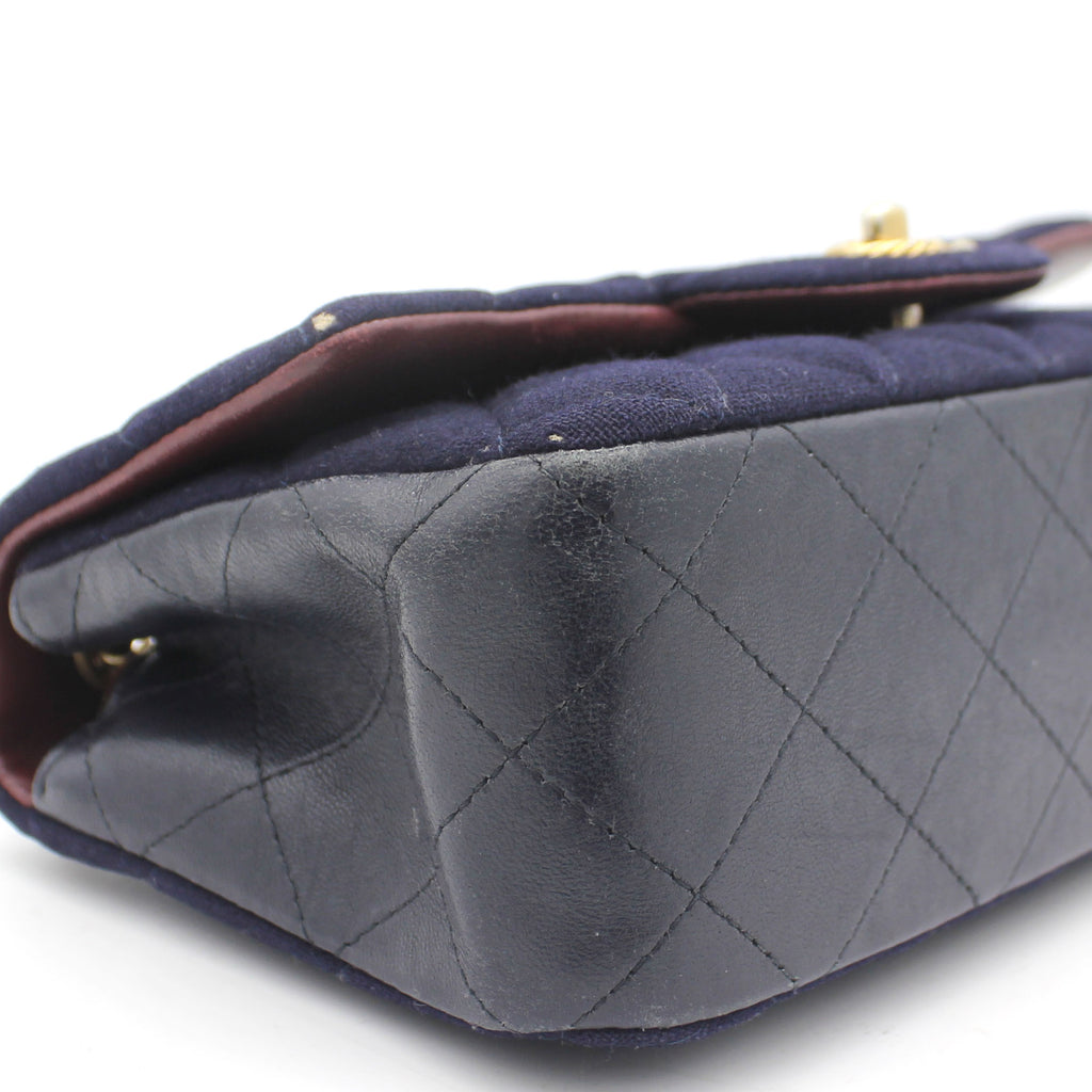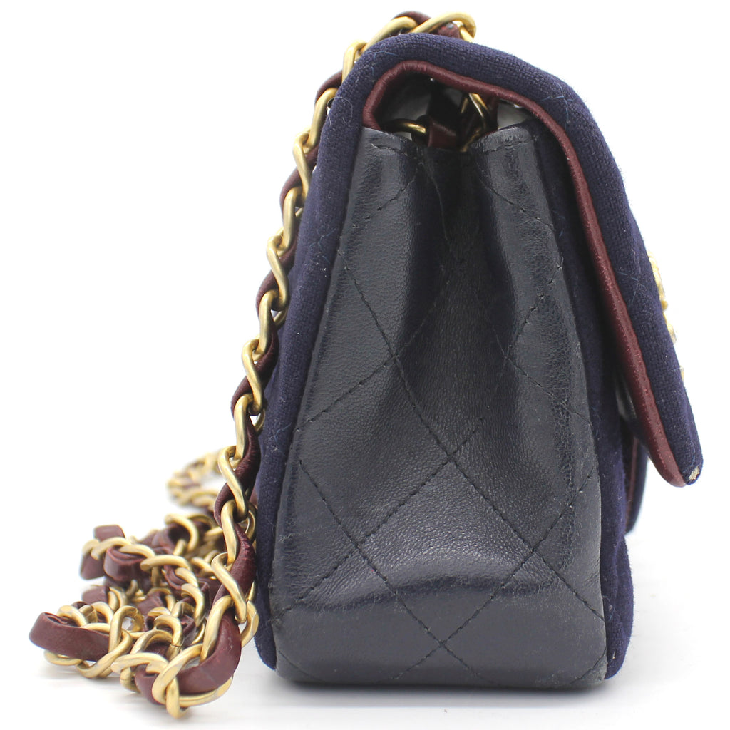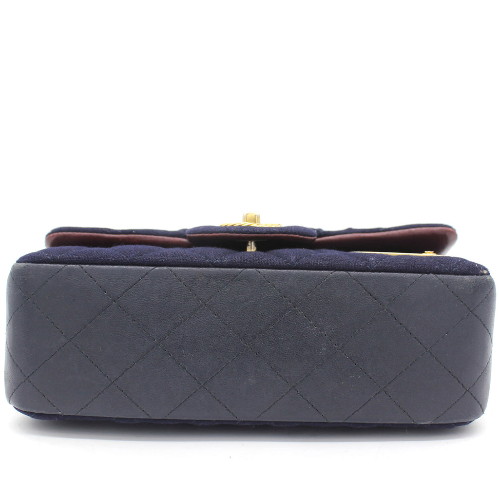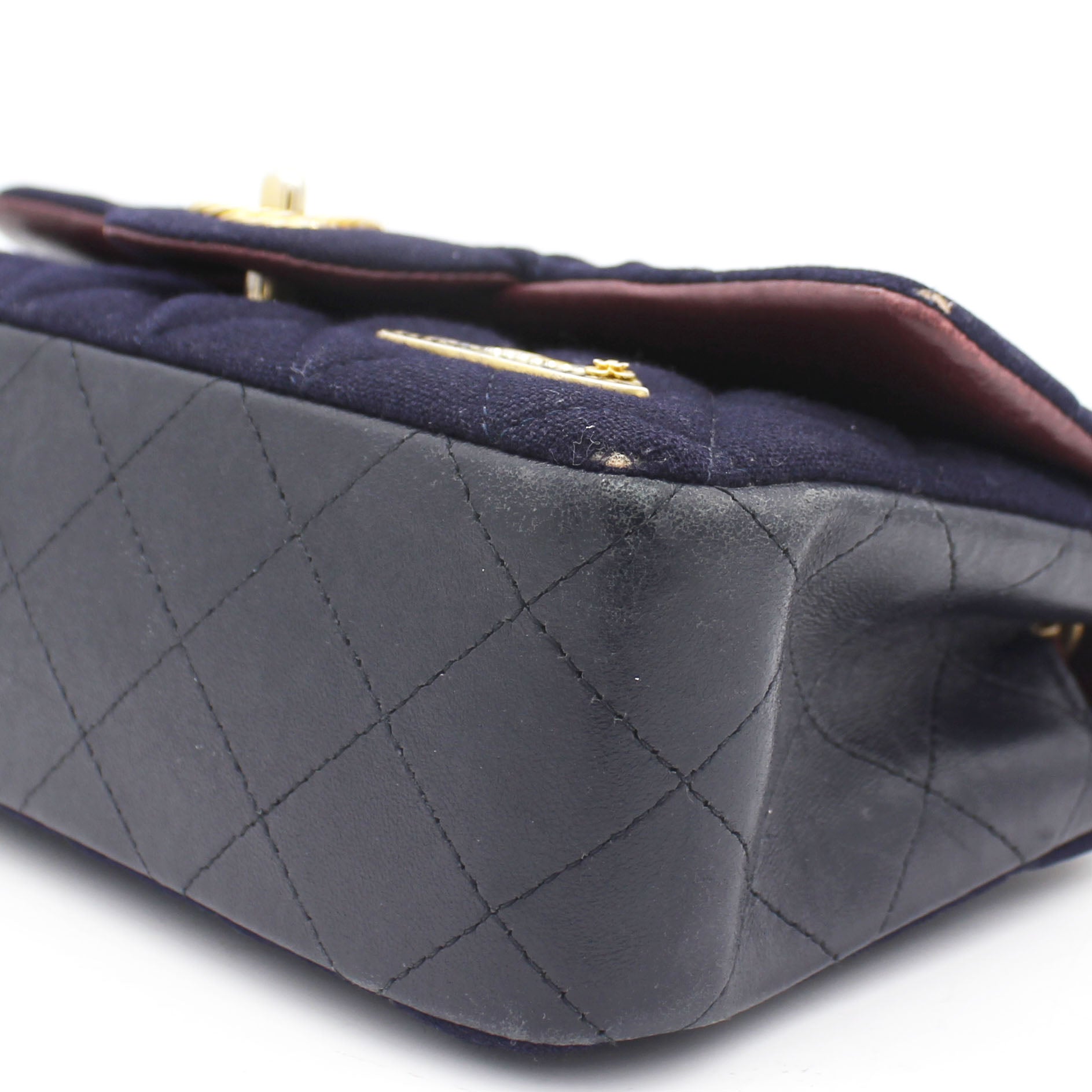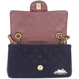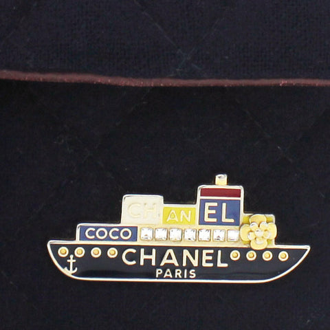| This chic bag features quilted felt fabric in navy blue. The unique feature of this bag are the nautical charm embellishments. The bag features a long chain red leather and aged gold shoulder strap that can be worn cross body. The flap opens with a detailed aged gold CC Chanel turn lock to a red leather interior with a zipper and patch pocket. |