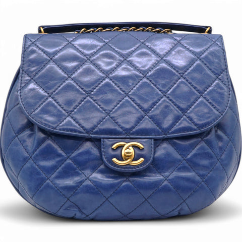 This stylish cross body bag is crafted of fine diamond quilted polished calfskin leather in blue. The shoulder bag features leather threaded aged gold chain shoulder strap with a leather shoulder pad, a flat exterior pocket on the rear, a front flap with a gold Chanel CC turn lock. The top flap opens to a bordeaux fabric interior a front pocket and a zipper pocket. This is an excellent bag for everyday use, only from Chanel!
