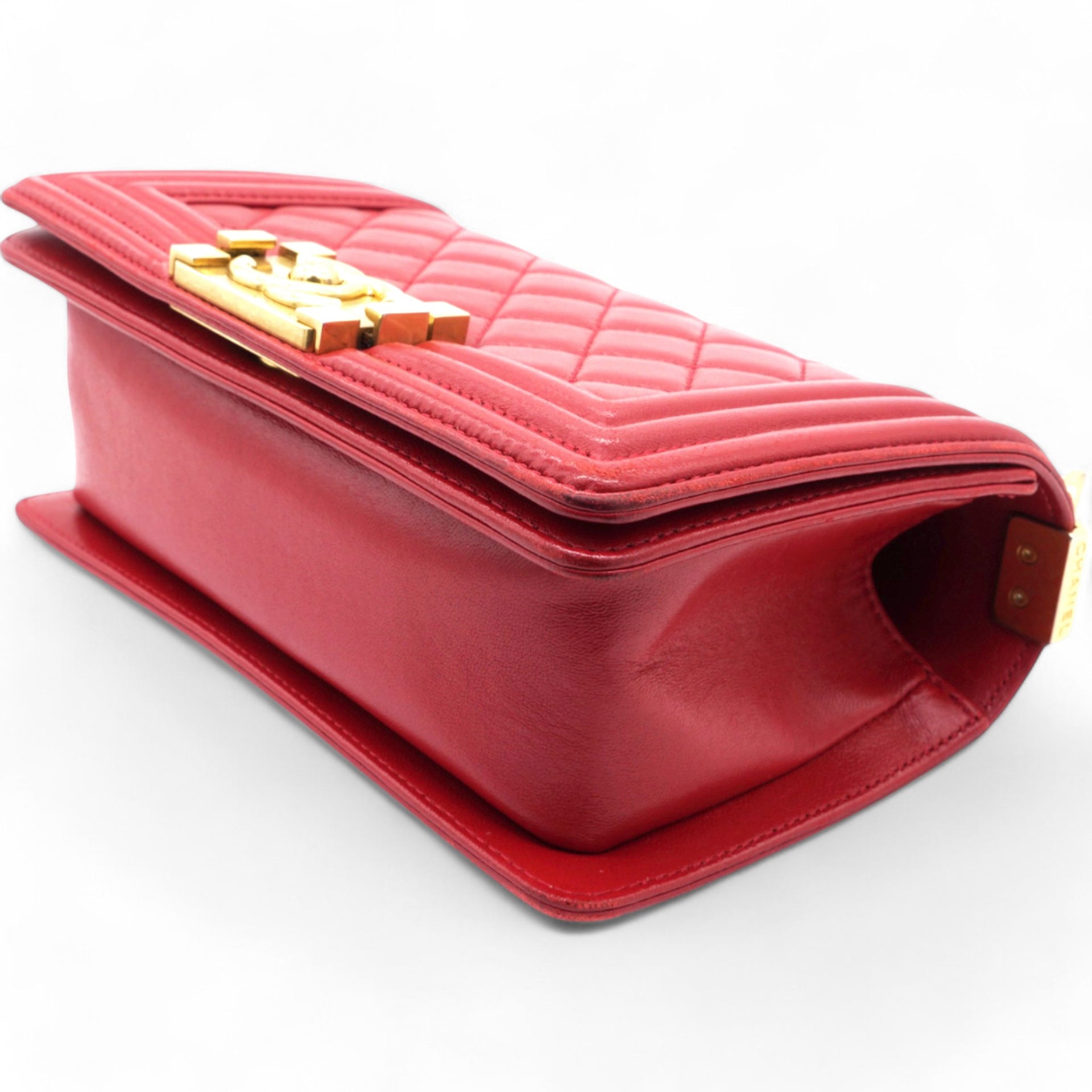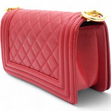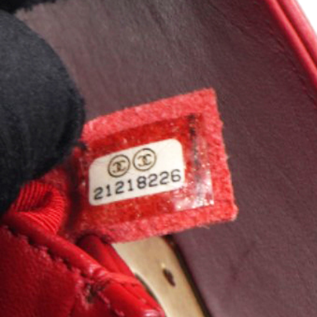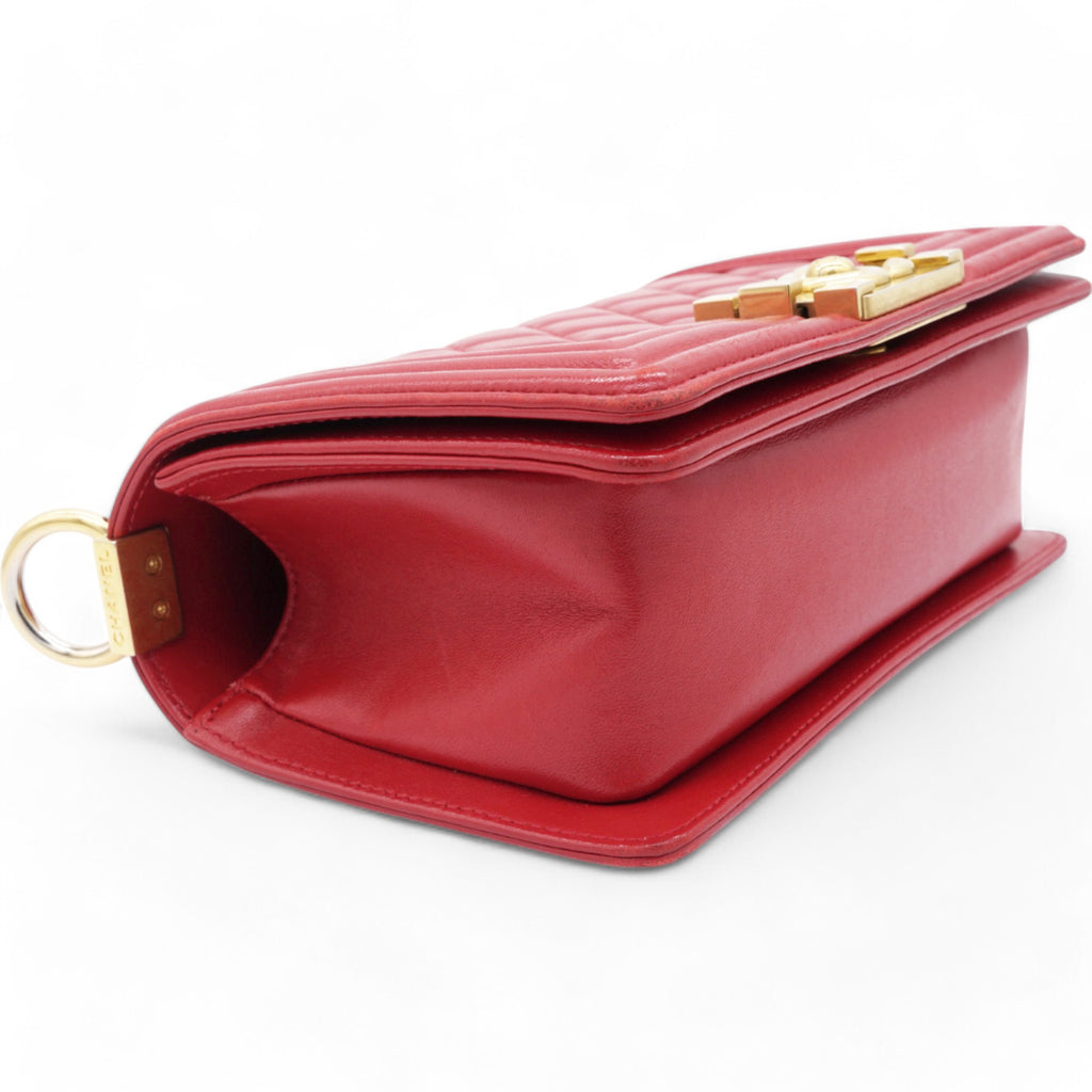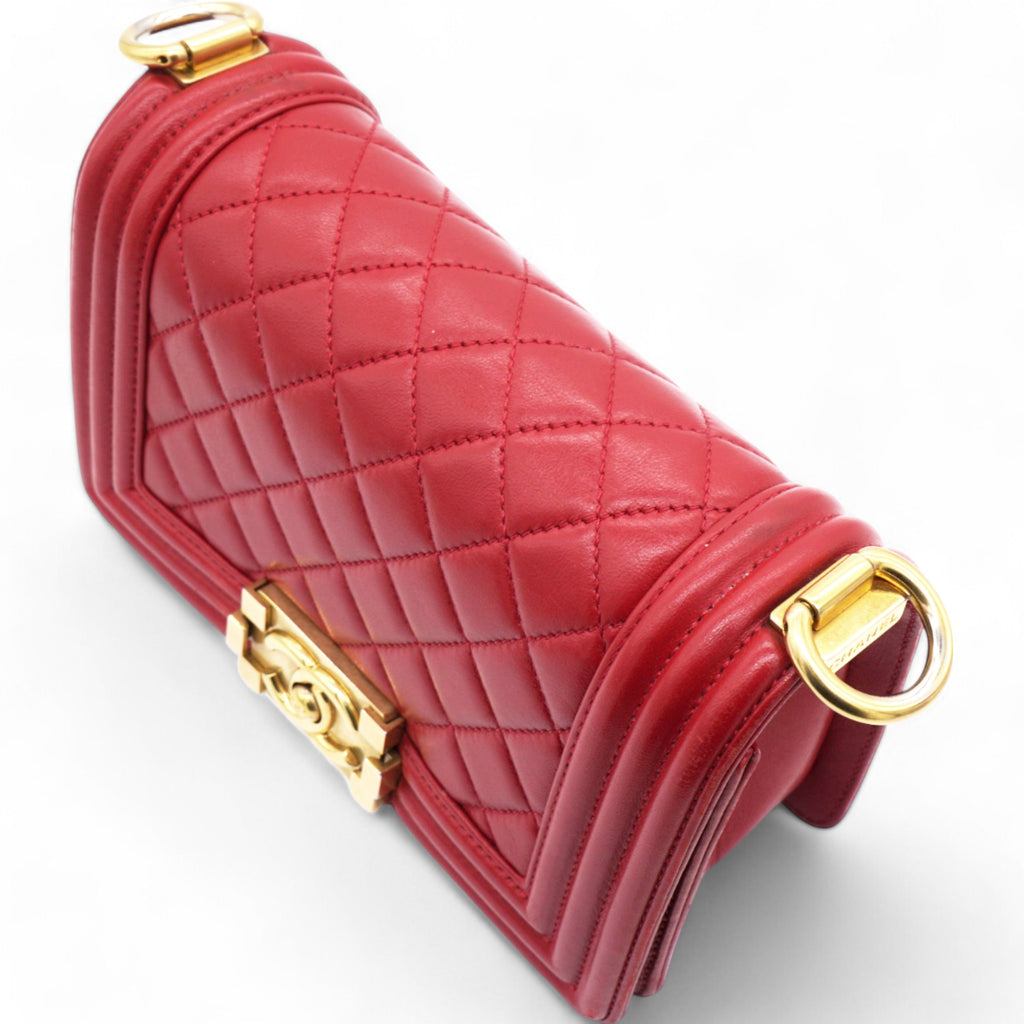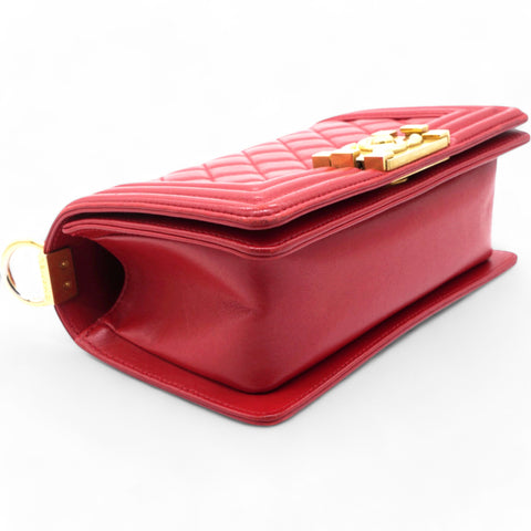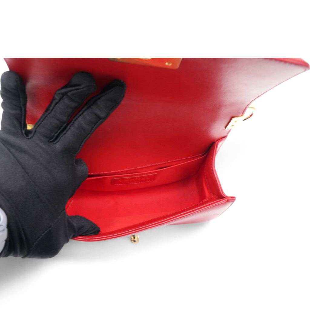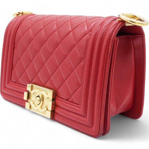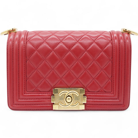 | This chic shoulder bag is crafted of leather in red, with a linear quilted peripheral border. The bag features an aged gold chain-link shoulder strap with a shoulder pad, and a matching aged gold boy CC push lock on the crossover flap. This opens the bag to a red fabric interior with a patch pocket. |