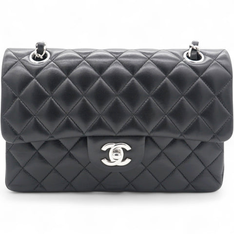 | This stylish shoulder bag is crafted of diamond quilted lambskin leather in black. The bag features a rear patch pocket, polished silver chain link leather threaded shoulder straps and a facing flap with a silver Chanel CC turn lock. This opens the flap to a second flap and a burgundy leather interior with patch pockets. Wear this classic flap bag for a timeless style to day or evening wear, only from Chanel! |