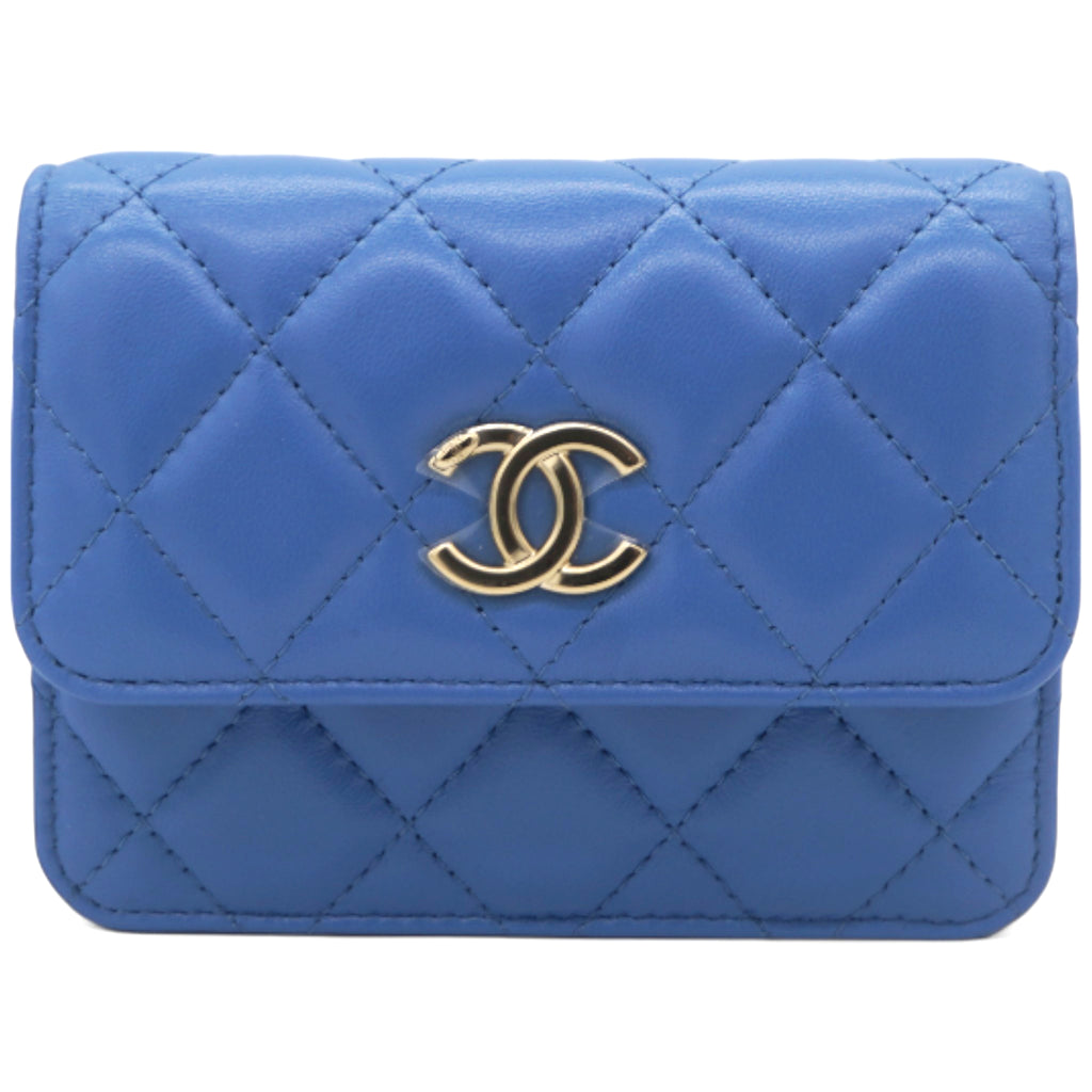 Lambskin Quilted Flap Card Holder On Chain Blue