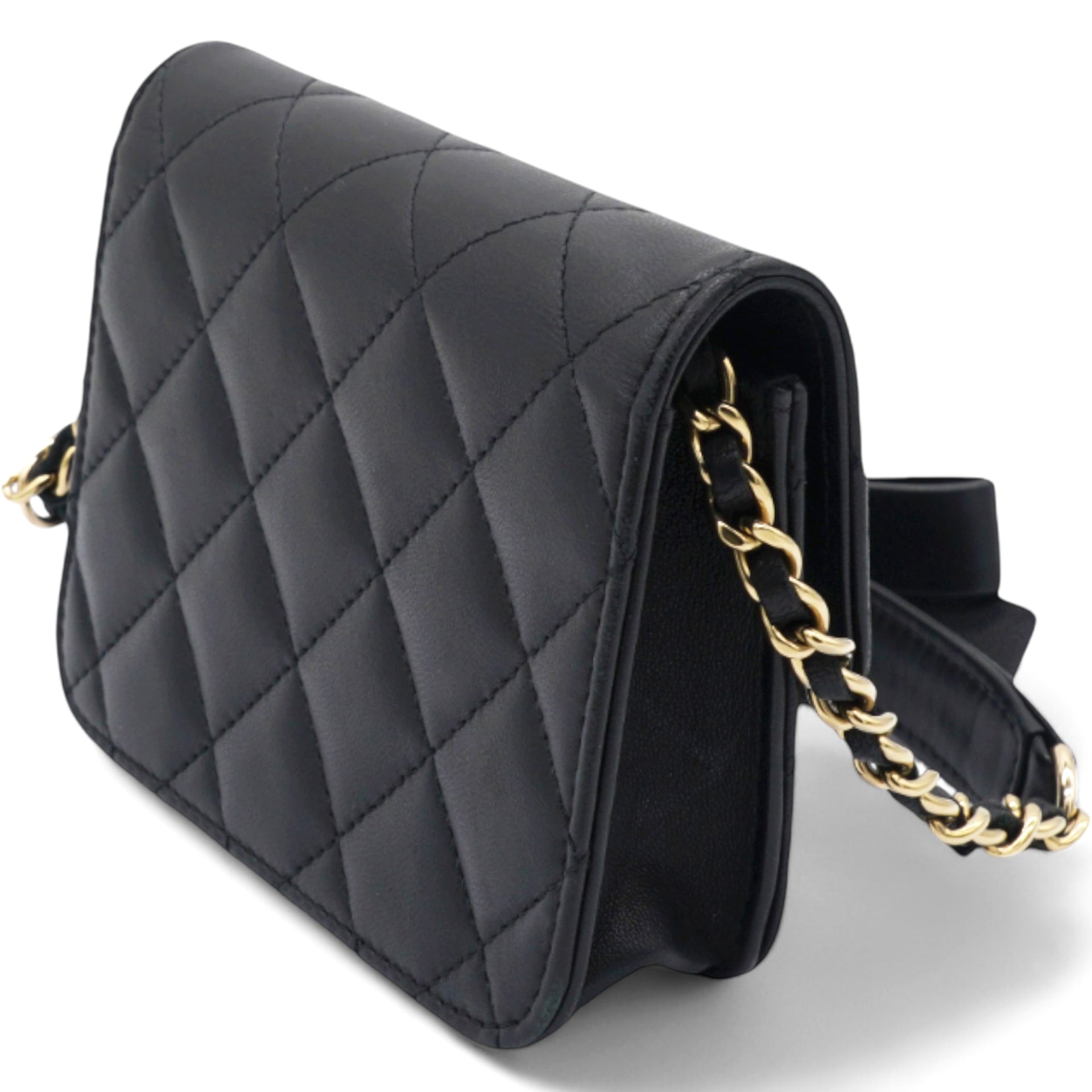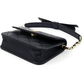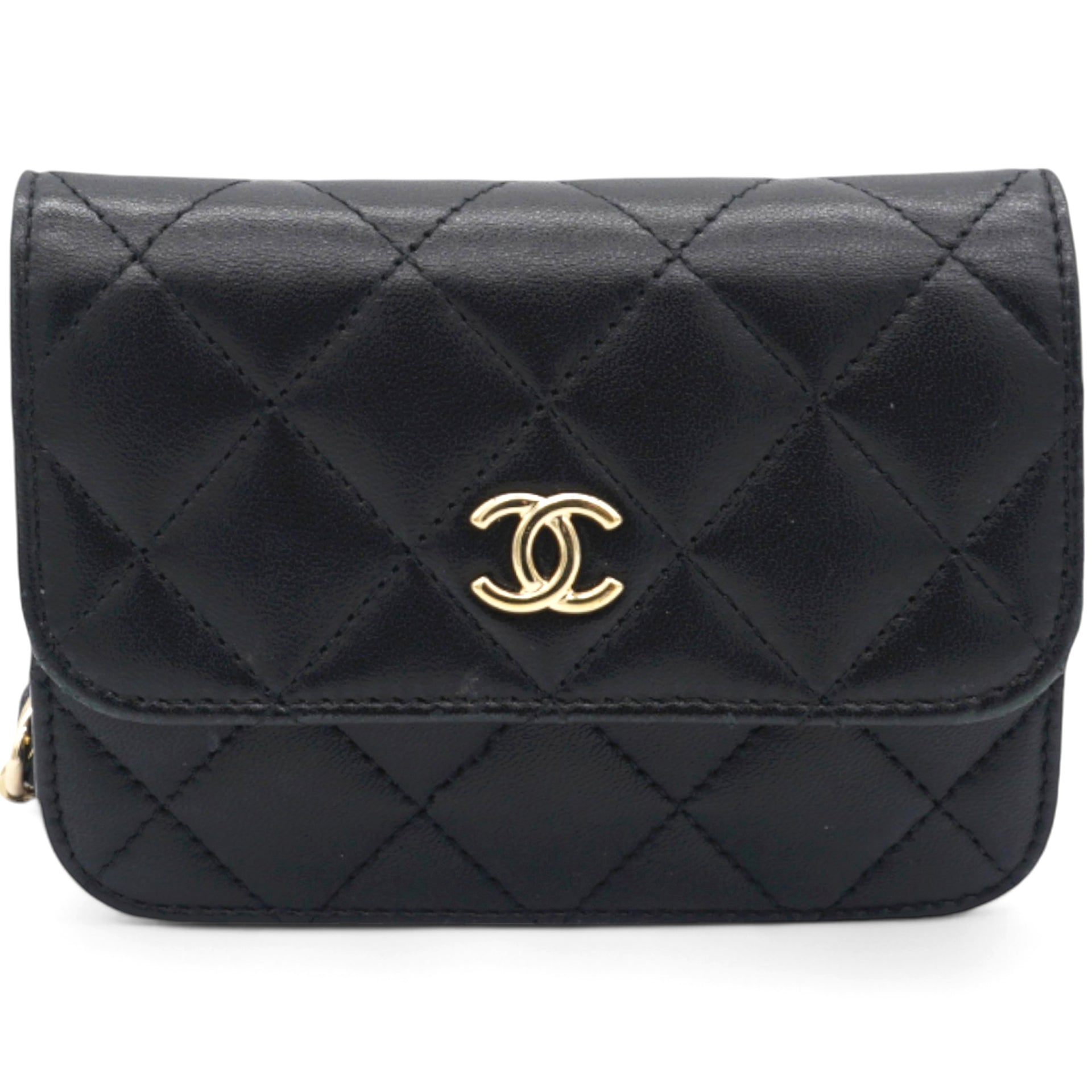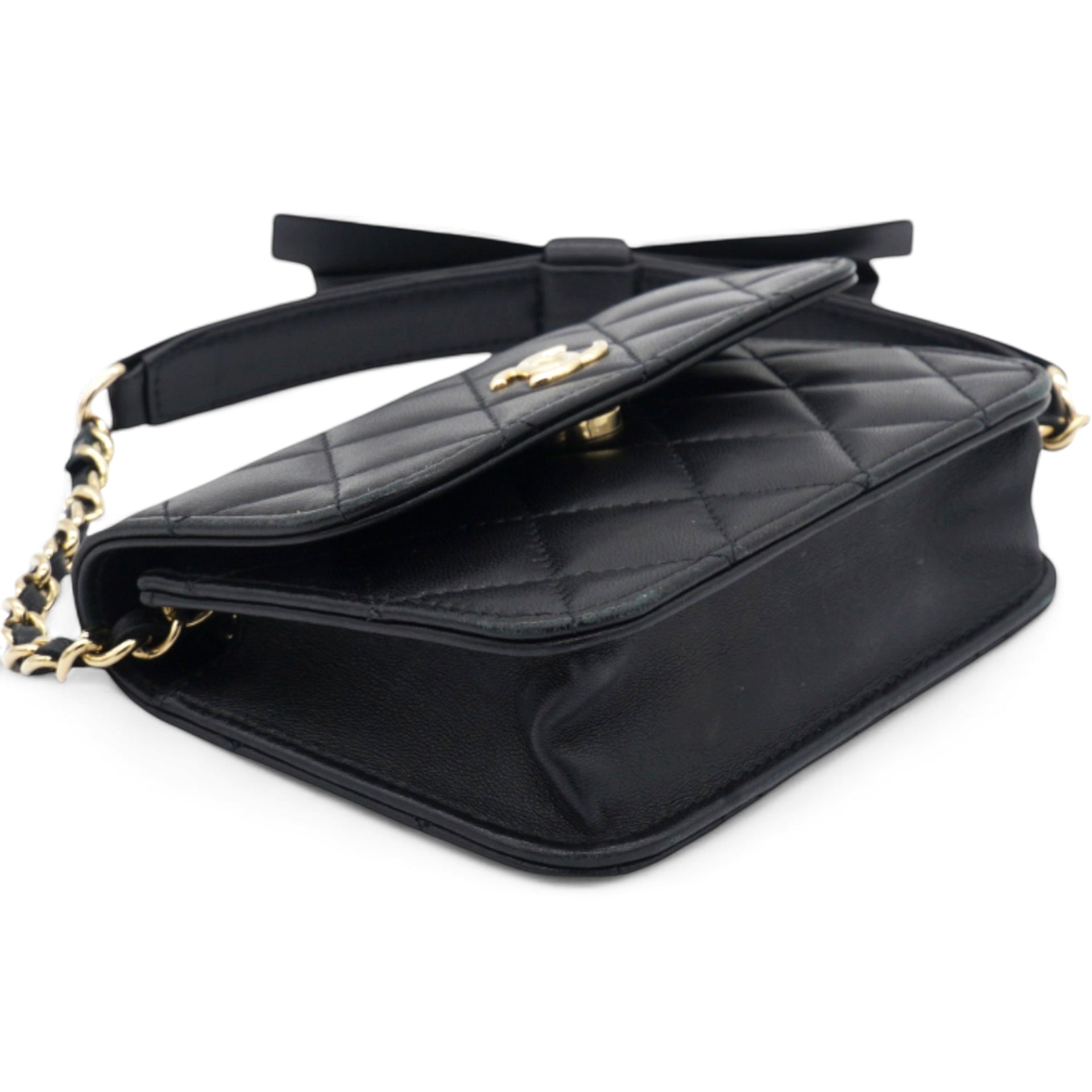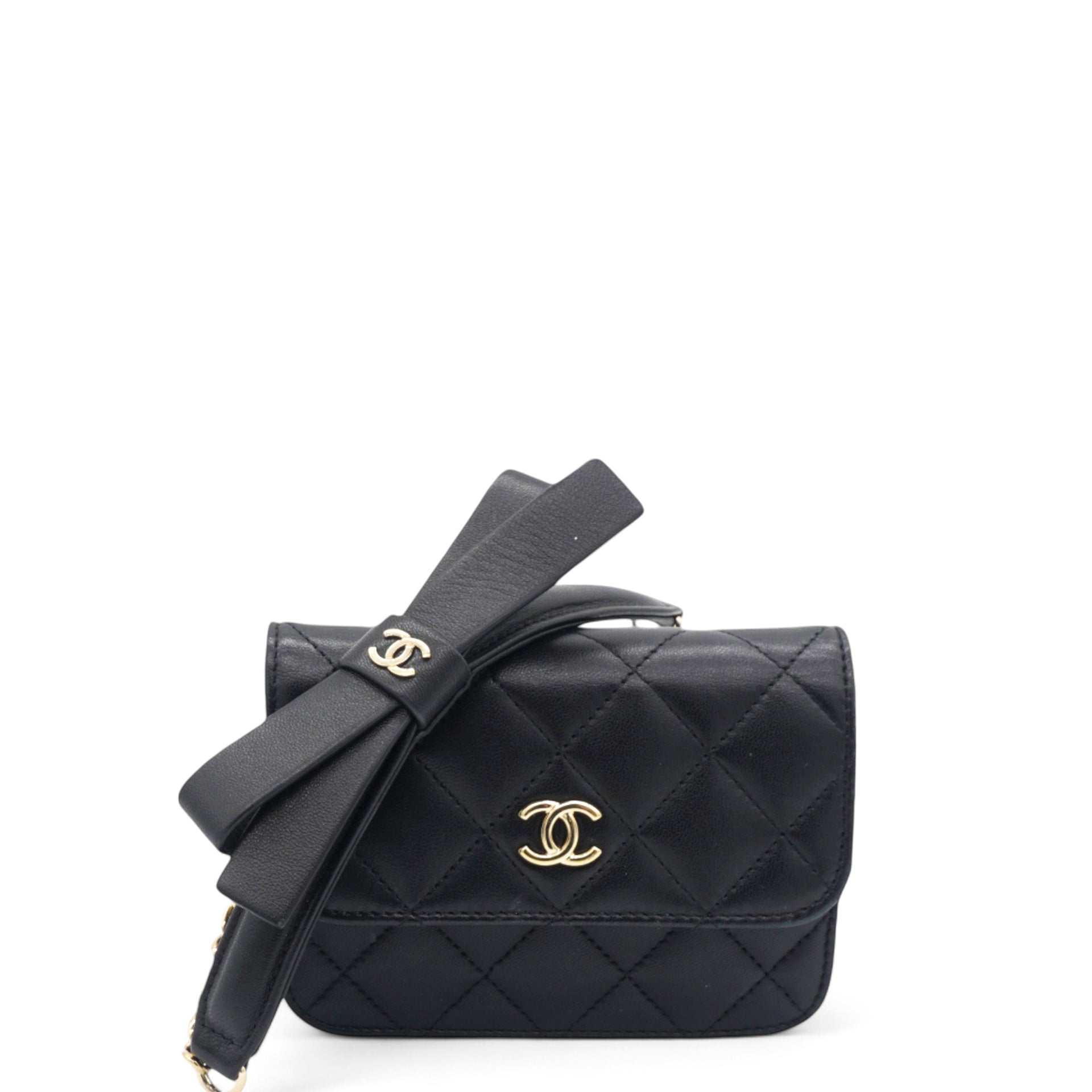 | This chic wallet on chain is crafted of diamond quilted lambskin leather in black. This features a leather threaded polished gold chain link shoulder strap with a bow and a gold toned Chanel CC on the flap. The magnetic closure opens to a black fabric interior. |