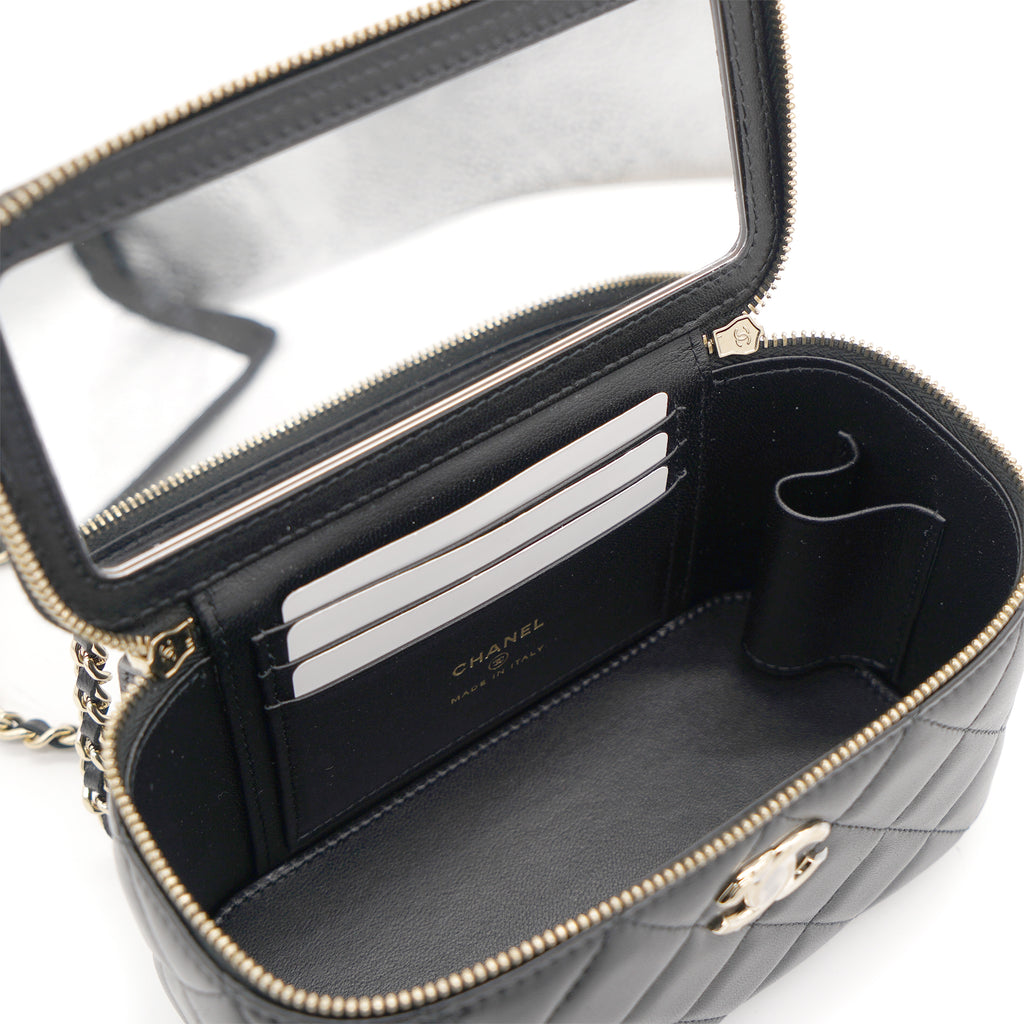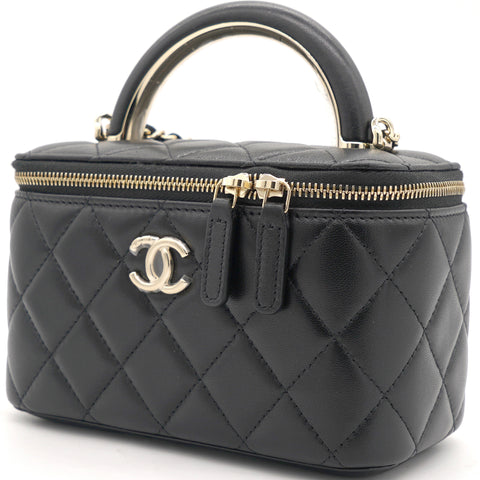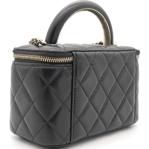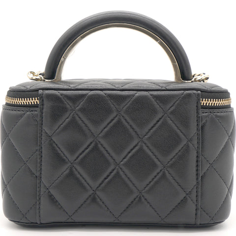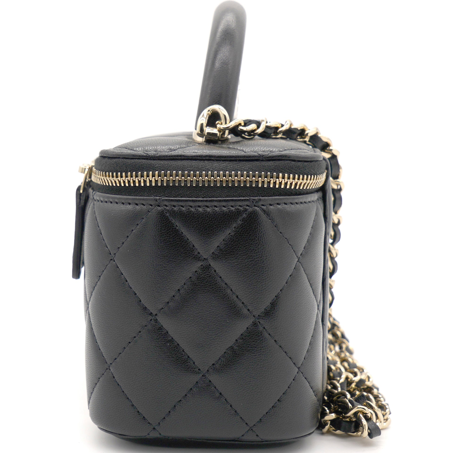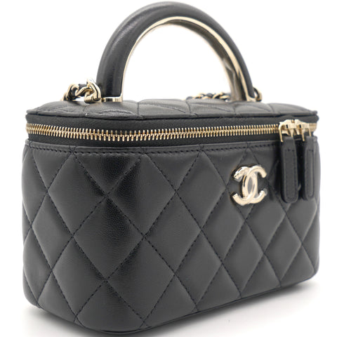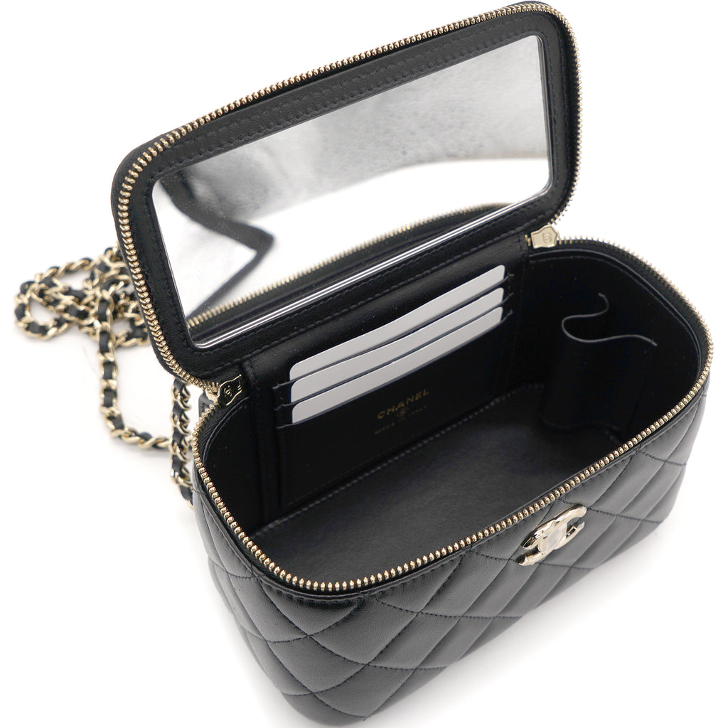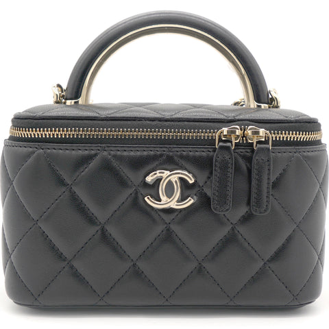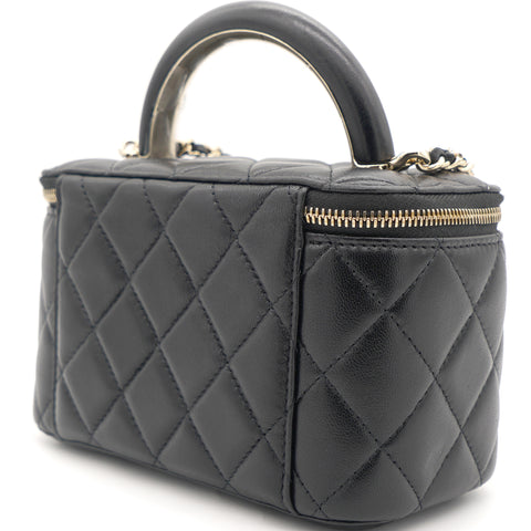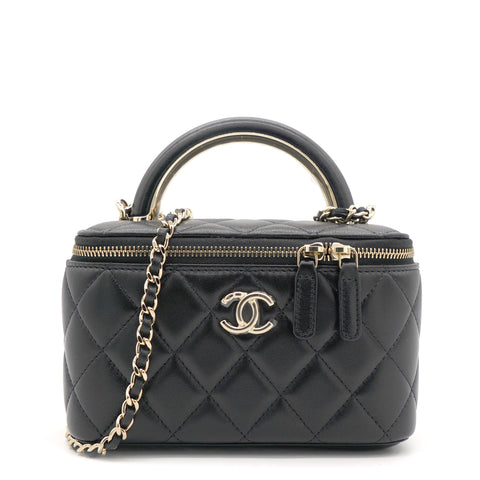 | This stylish crossbody is crafted of luxurious lambskin leather in black. The bag features a leather top handle, leather threaded gold chain-link shoulder strap, and gold hardware. The handbag features a 3/4 wrap-around zipper that opens to a black fabric interior. |
