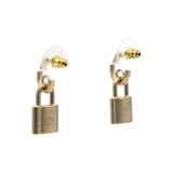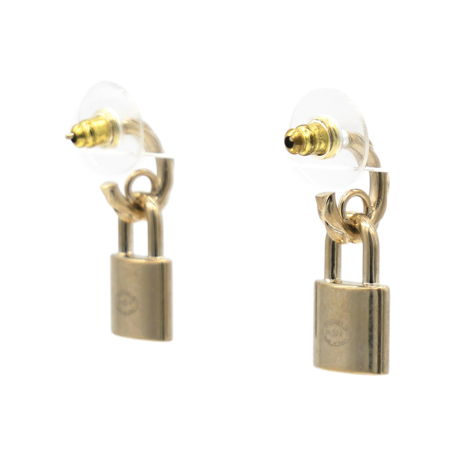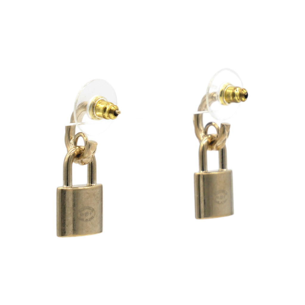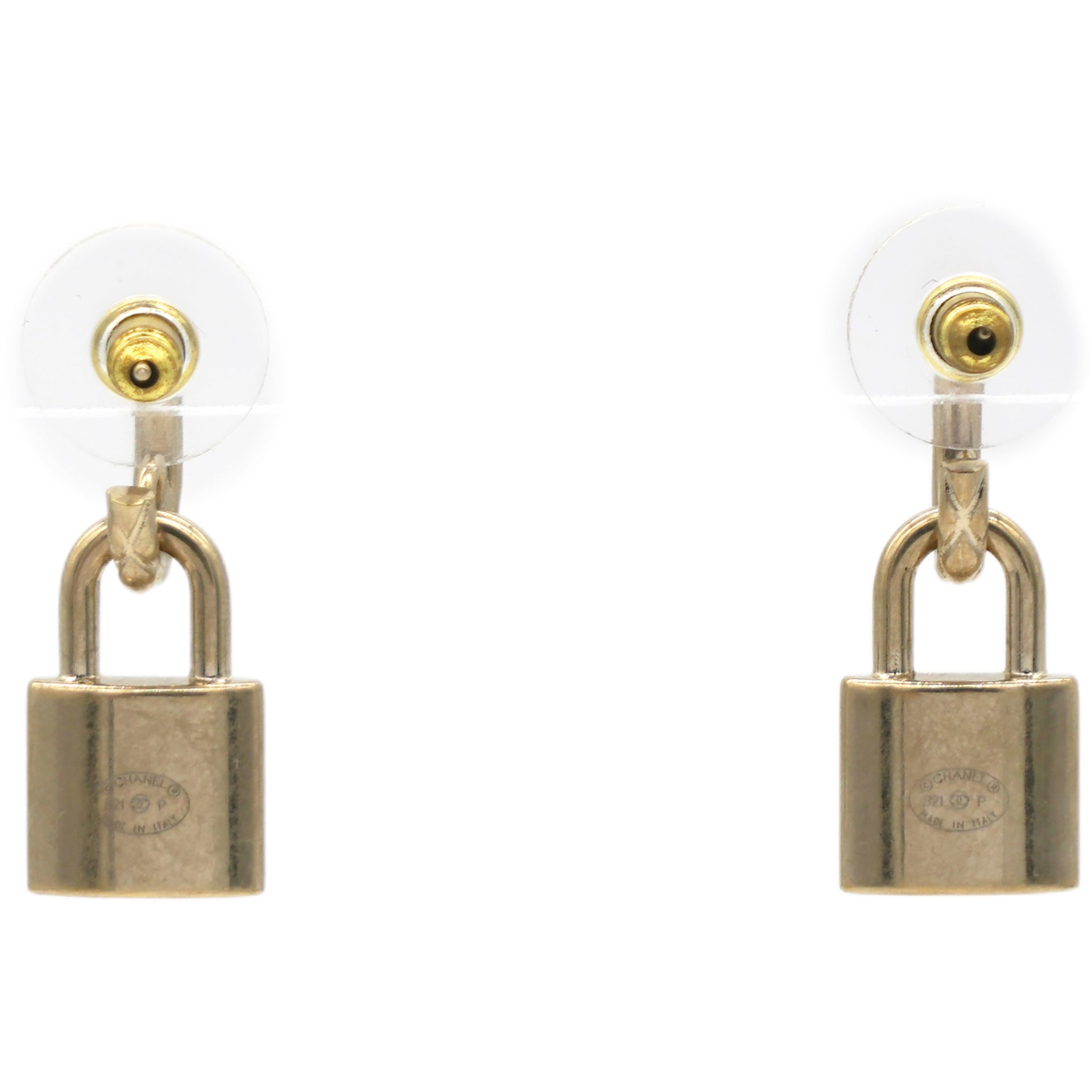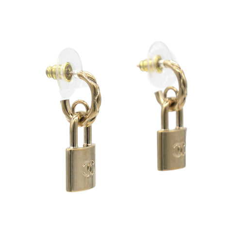 This is an authentic CHANEL Lock Drop Earrings in Light Gold. These stylish earrings feature a small hoop with a dangling lock with the CC logo.