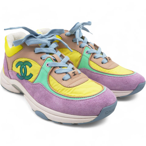 | These stylish sneakers are crafted of yellow nylon, with beige calfskin and purple suede leather accents. These are excellent sneakers for athletic wear, with the timeless quality and style of Chanel! |