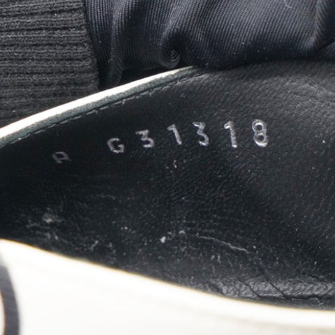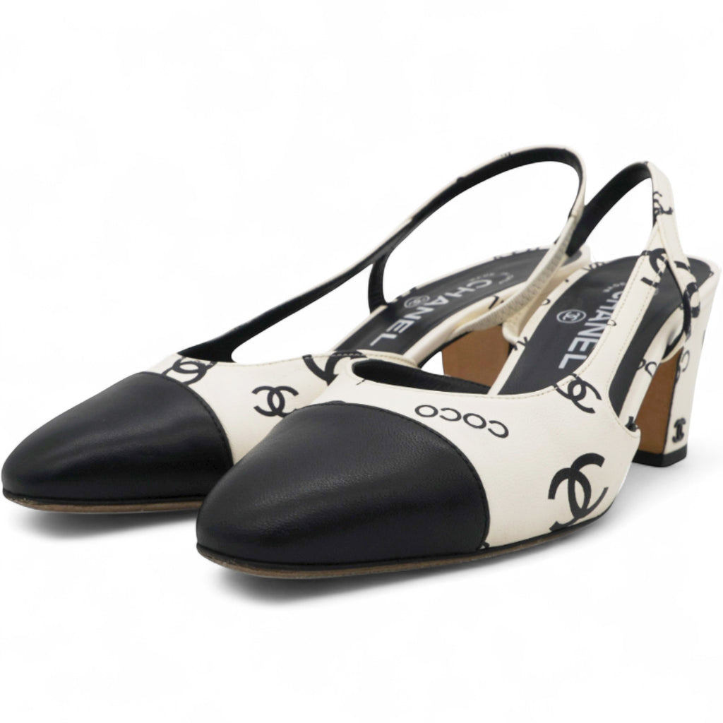 | These chic slingback sandals are crafted of smooth lambskin leather in white with black logos. They feature a pointed black grosgrain cap toe and a small gold Chanel logo on the heel. |