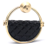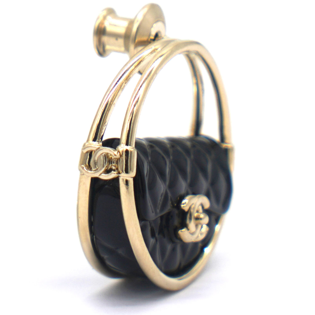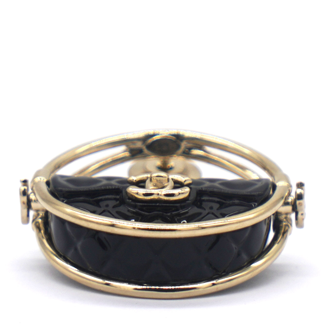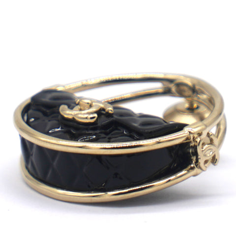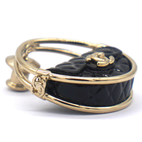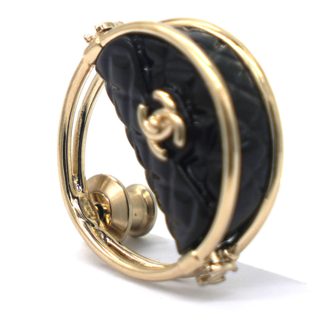 This is a genuine pair of CHANEL Metal Resin Flap Bag Hoop Brooches in Black and Gold. This is a stylish brooch featuring a quilted black flap bag hoop.