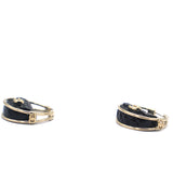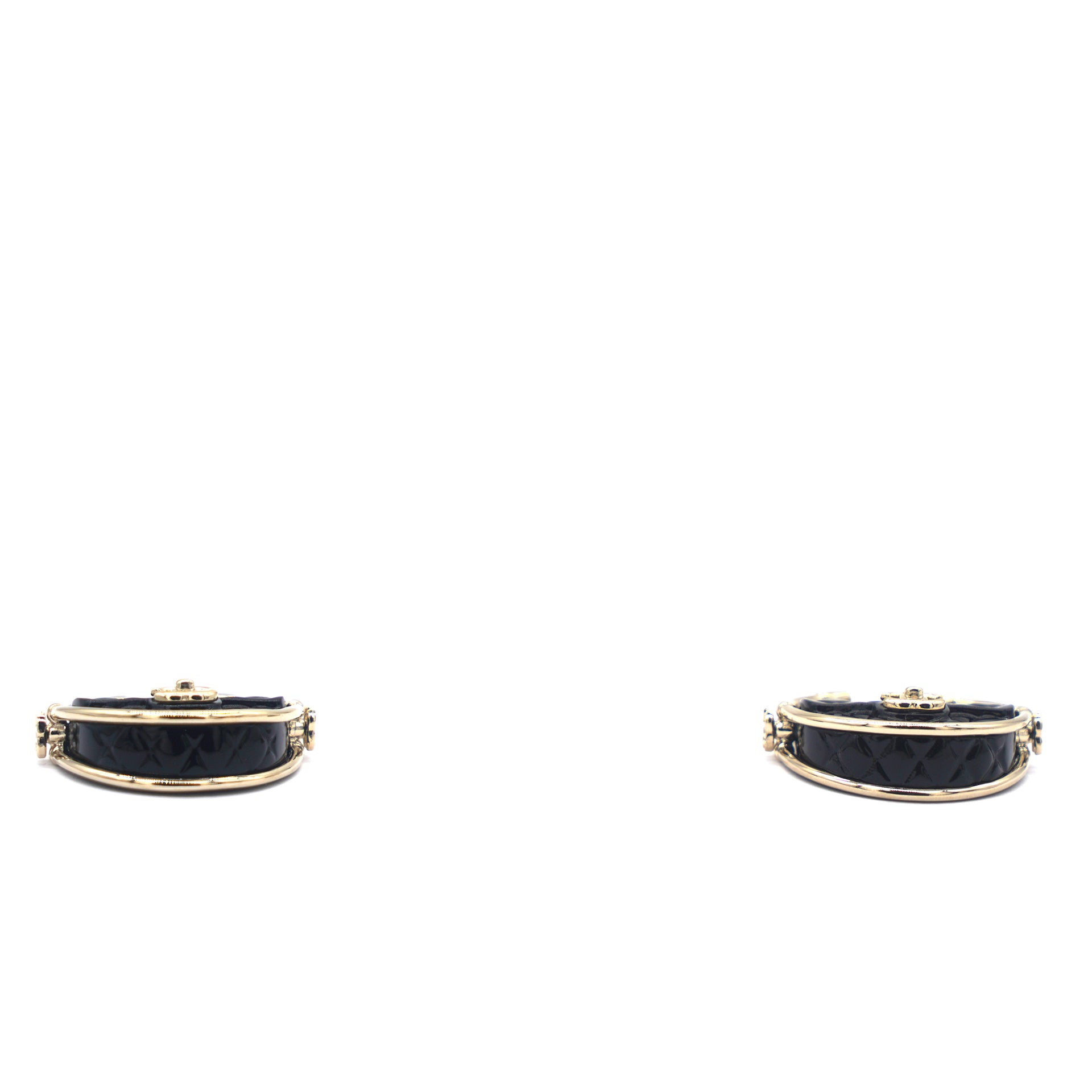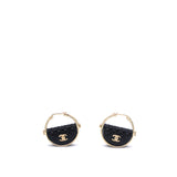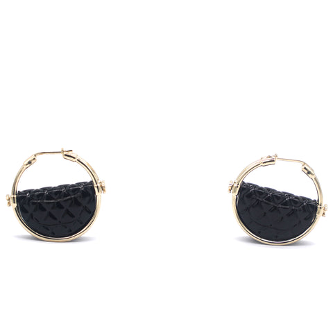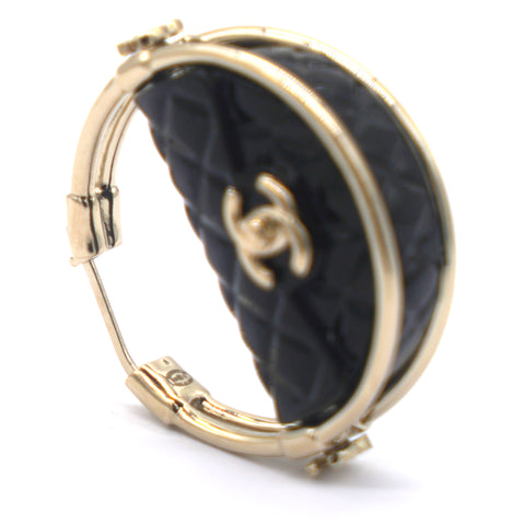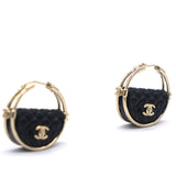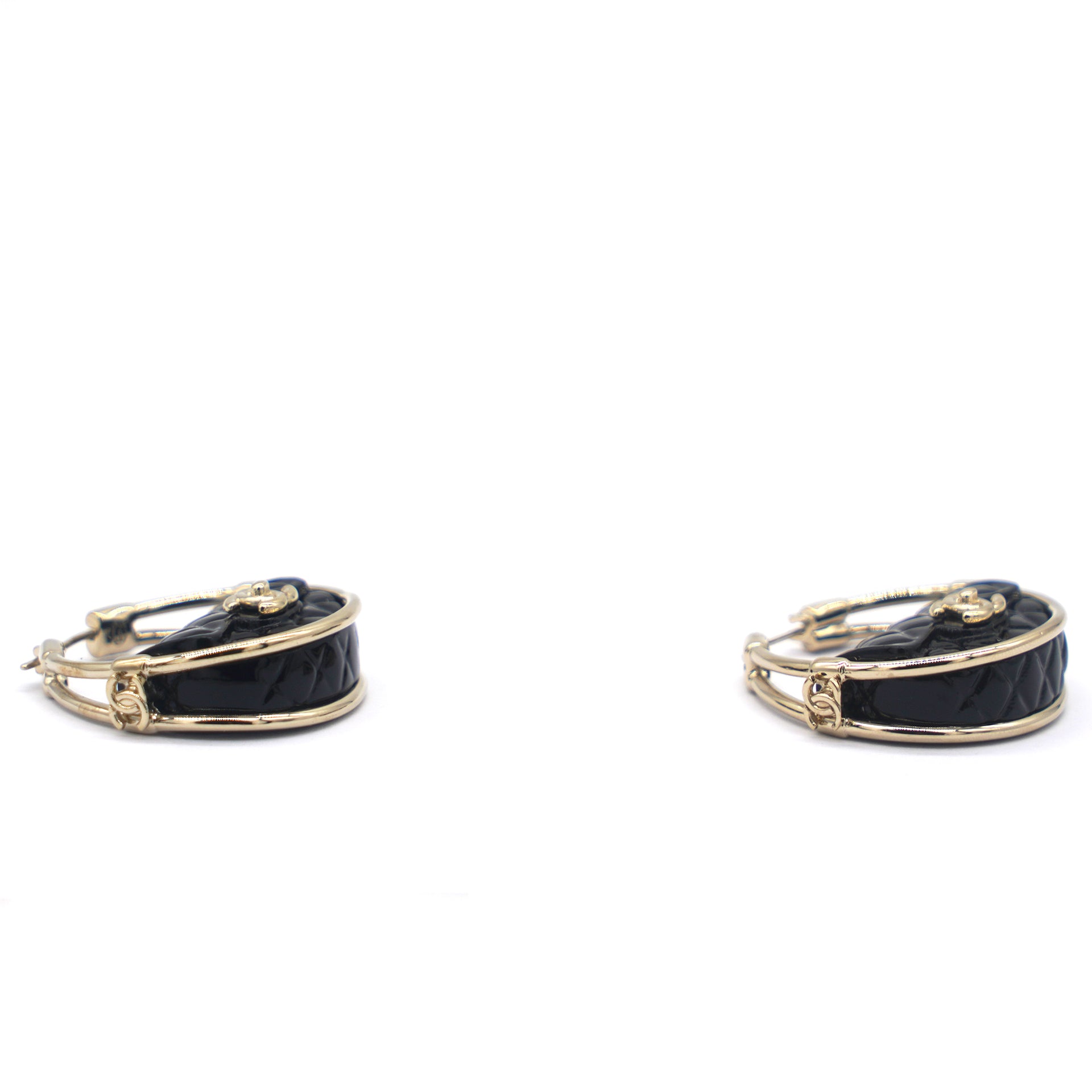 This is an authentic pair of CHANEL Metal Resin Flap Bag Hoop Earrings in Black and Gold. These are chic earrings that feature a quilted black flap bag hoop earrings.