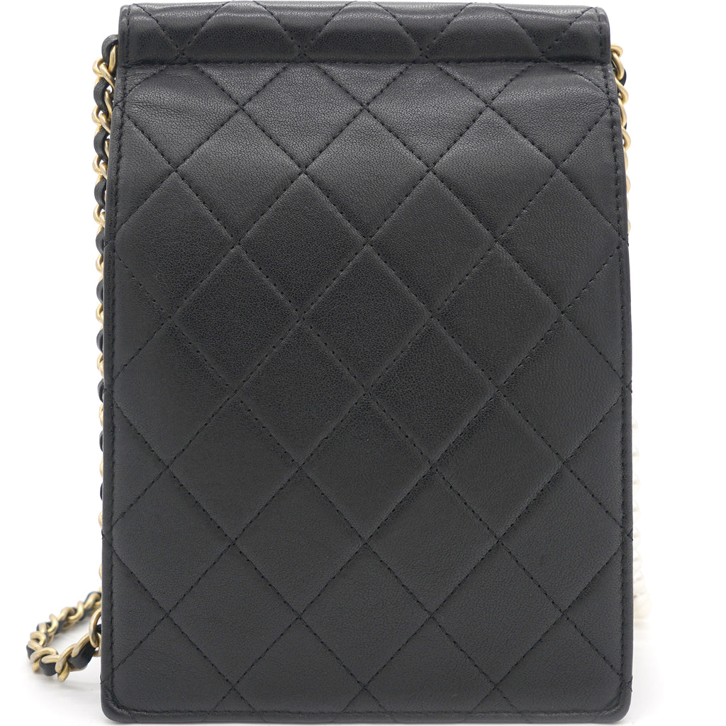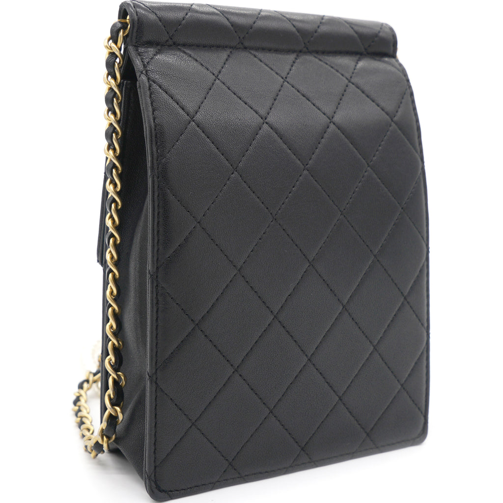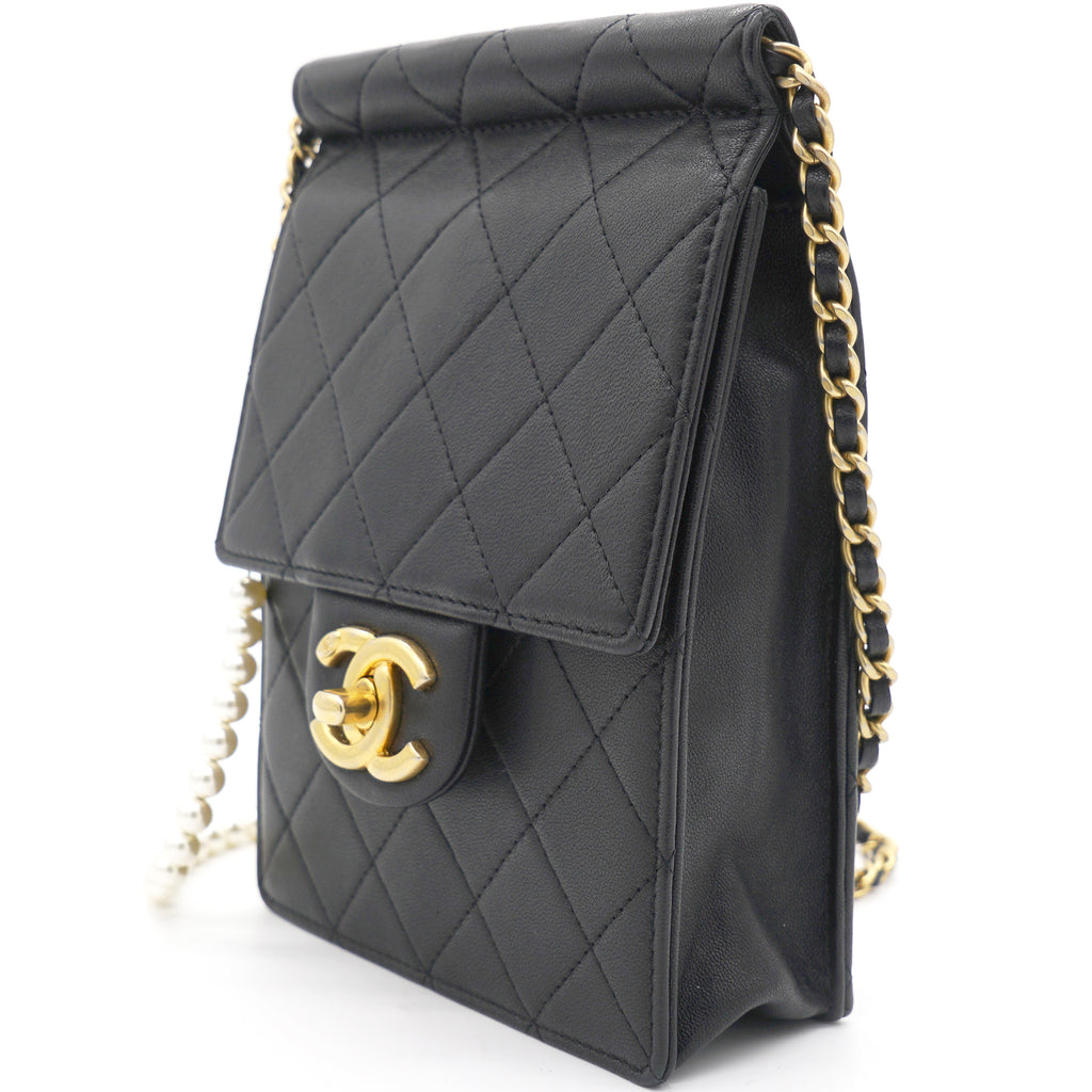 From Chanel's Spring Summer 2019 Seasonal Bag Collection Act 2, which featured handbag styles seen on the runway of the Chanel Spring Summer 2019 catwalk show. This handbag collection featured playful twists on classic Chanel bag styles and new, elevated silhouettes with avant-garde embellishments. This Small Pearl Chain Vertical Flap Bag, constructed from buttery soft black lambskin leather, is notable for its unusual vertical shape, featuring signature Chanel diamond quilting, CC monogram twist-lock closure. Thanks to its gold-toned chain cross-body strap, which is strung with classic Chanel white pearls.