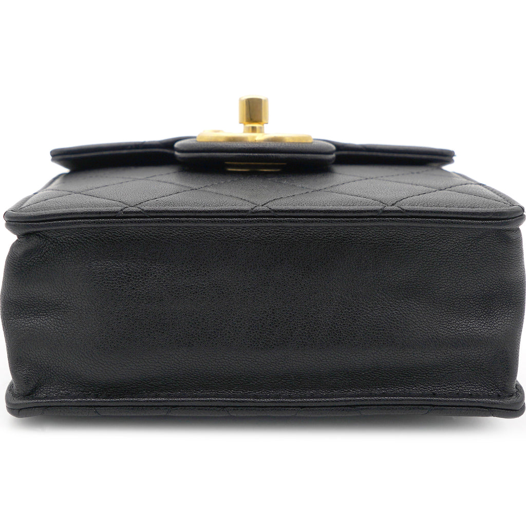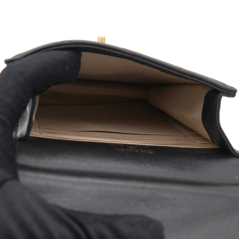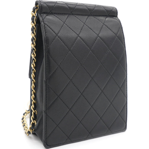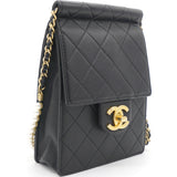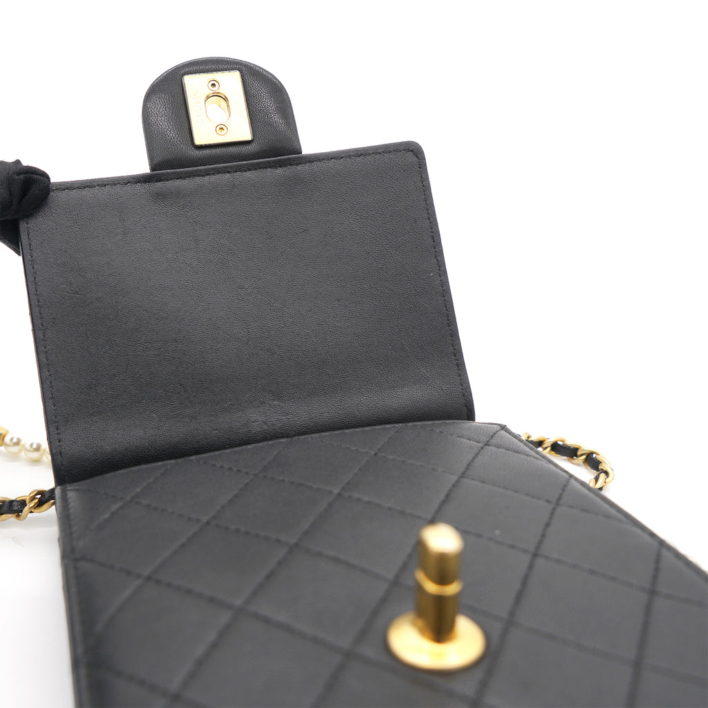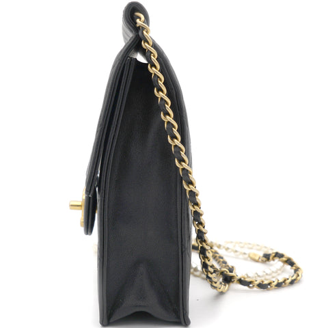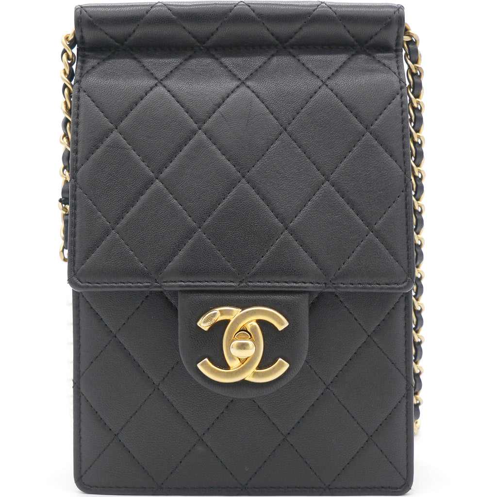 From Chanel's Spring Summer 2019 Seasonal Bag Collection Act 2, which featured handbag styles seen on the runway of the Chanel Spring Summer 2019 catwalk show. This handbag collection featured playful twists on classic Chanel bag styles and new, elevated silhouettes with avant-garde embellishments. This Small Pearl Chain Vertical Flap Bag, constructed from buttery soft black lambskin leather, is notable for its unusual vertical shape, featuring signature Chanel diamond quilting, CC monogram twist-lock closure. Thanks to its gold-toned chain cross-body strap, which is strung with classic Chanel white pearls.