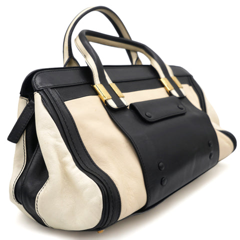 | This beautiful satchel is crafted from white and black leather with two handles, pocket and finished with gold hardware. The zip opening to black fabric interior. Perfect for everyday bag. |
