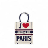 | This petite tote features an embroidered J'Adior Paris theme with a large red heart and iconic Christian Dior logo letters. The bag features navy blue rolled handles and a CHRISTIAN DIOR logo letters. The top is open to a matching fabric interior. |