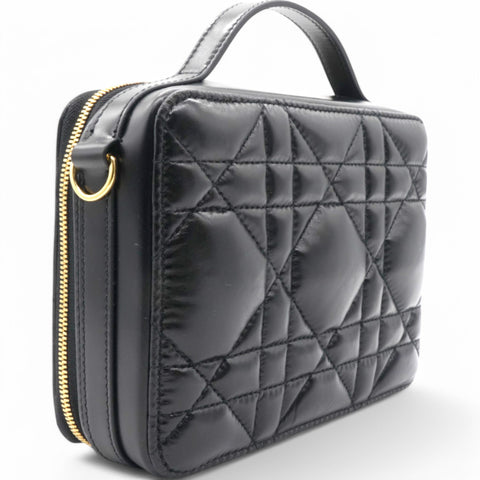 | Maria Grazia Chiuri's Dior Caro box bag is a modern creation. Crafted in black calfskin, it stands out with a unique Macrocannage quilted effect and a spacious compartment, including three card slots, to accommodate all the daily essentials. The removable chain strap features a leather insert for comfortable and adjustable wear, either over the shoulder or crossbody, while the handle allows it to be carried by hand. |