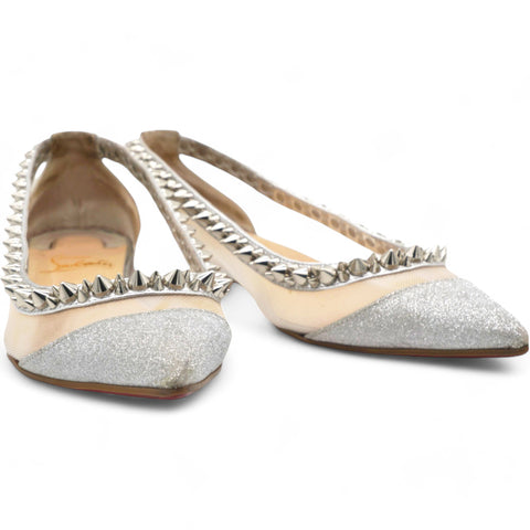 | A daring twist on the classic pump, the Galativi Spikes Flat is available this season in an array of audacious colors and materials. This slip-on flat displays Christian's love of transparency with silver fishnet revealing glimpses of the foot. This model features a toe and heel in sparkling silver Glitter Mini Nappa leather. A row of signature glossy silver spikes in two different sizes outlines the vamp. |