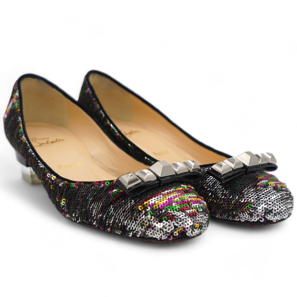 | These stunning limited edition pumps are crafted from silver/multicoloured two way sequins and feature a signature studded flat bow to front, a 3.5cm patent leather & PVC hybrid block heel and round toe front. |