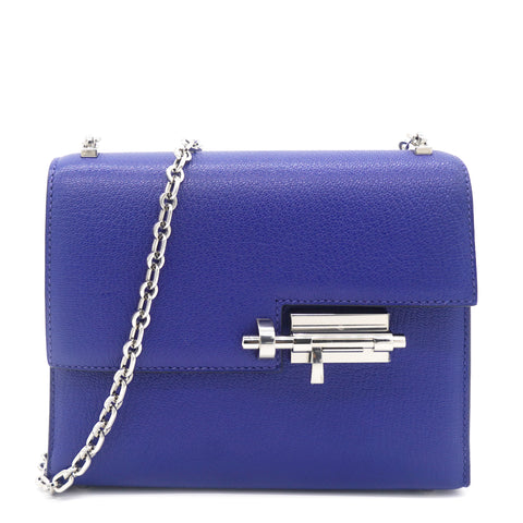 | This stunning shoulder bag is beautifully crafted of goatskin leather in blue. The bag features a palladium silver link strap and a facing full flap that seals with a silver stylized latch closure. The flap opens to a leather interior with patch pockets. |