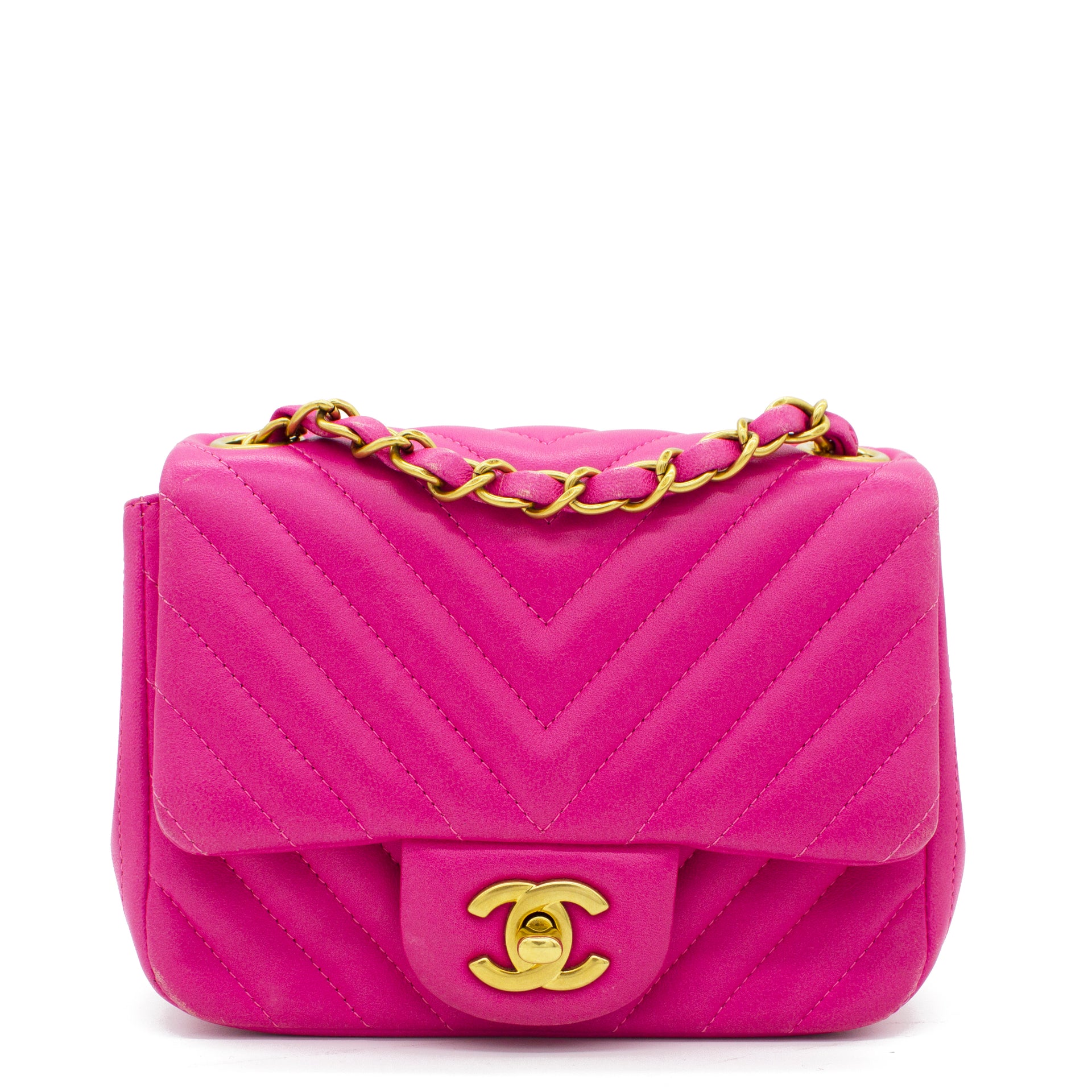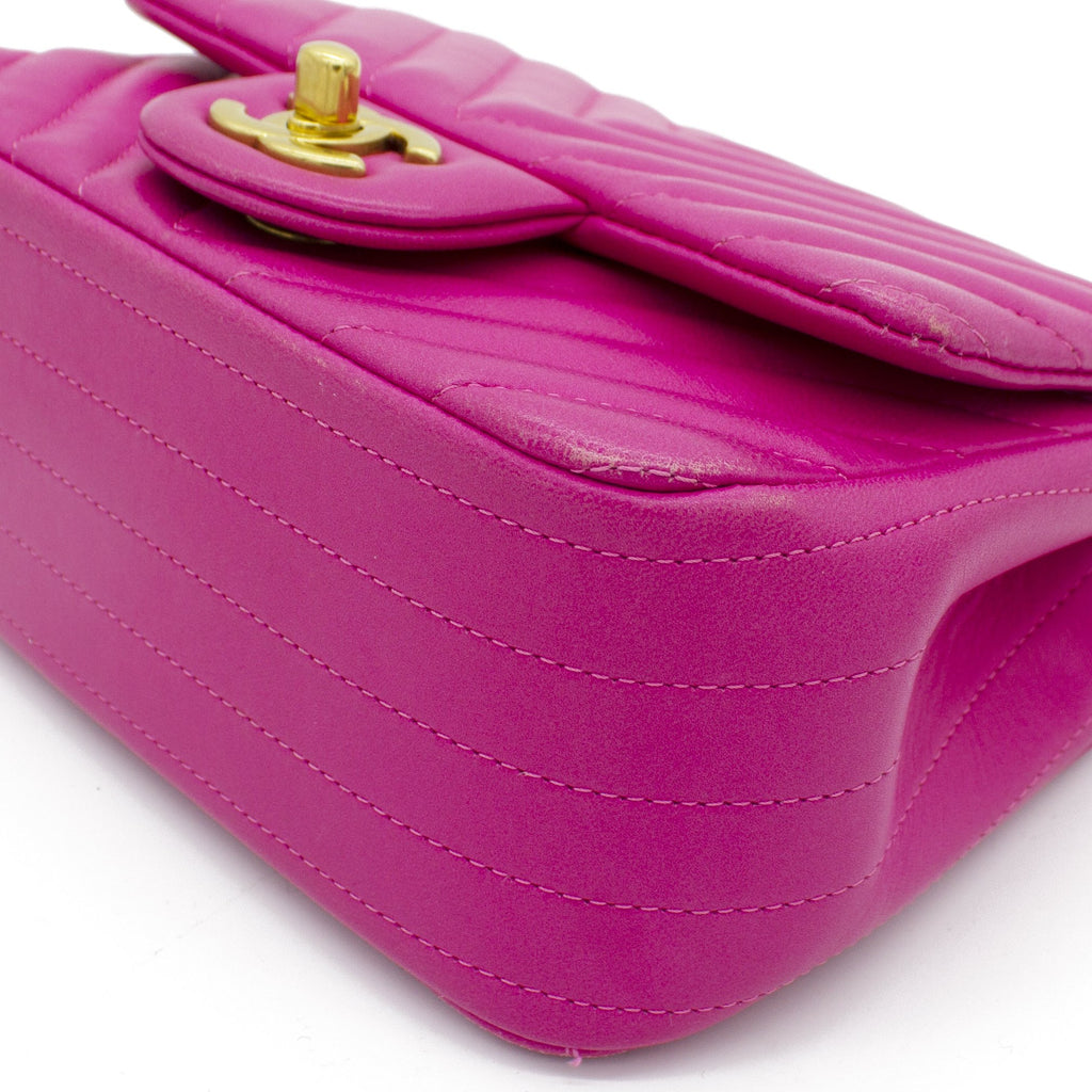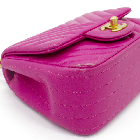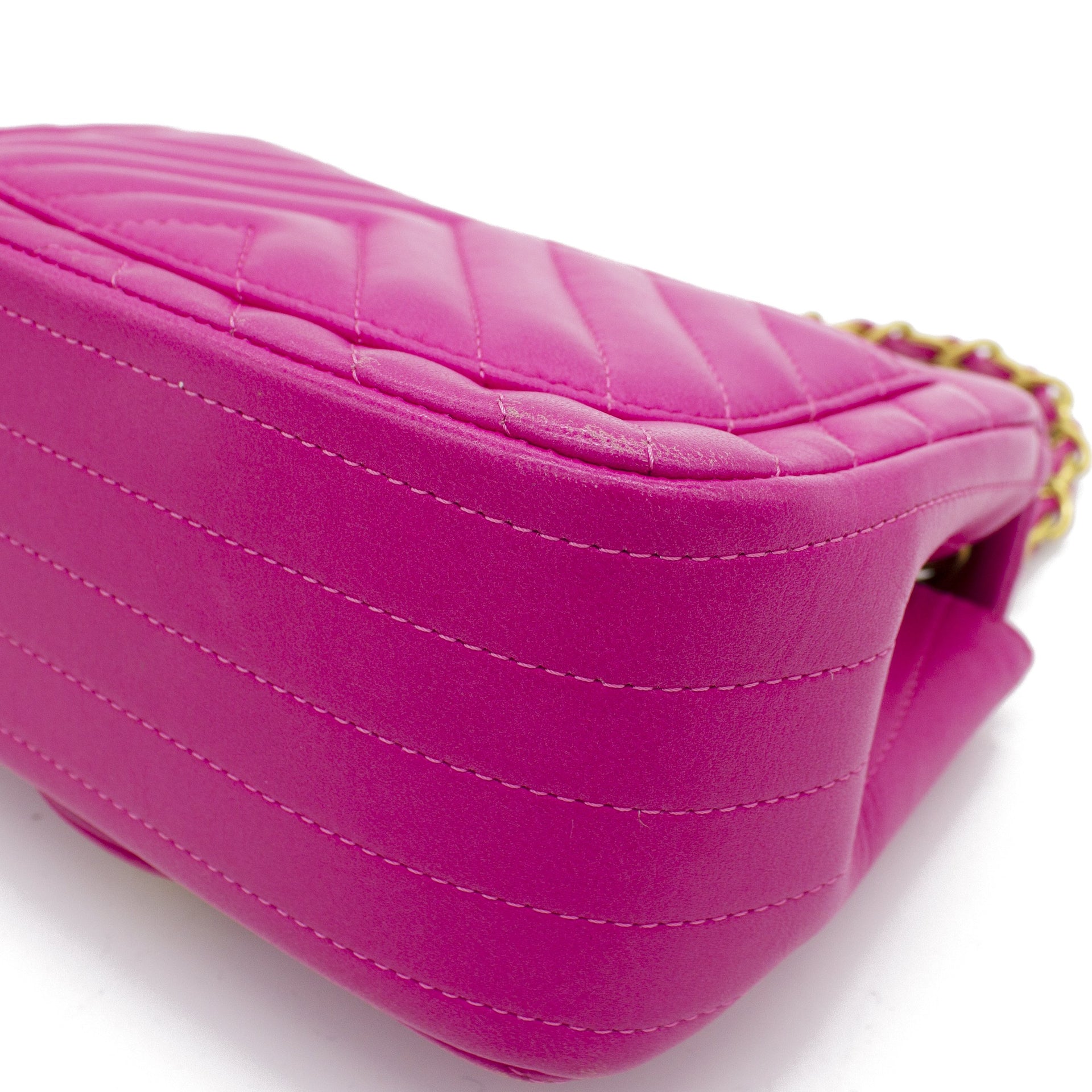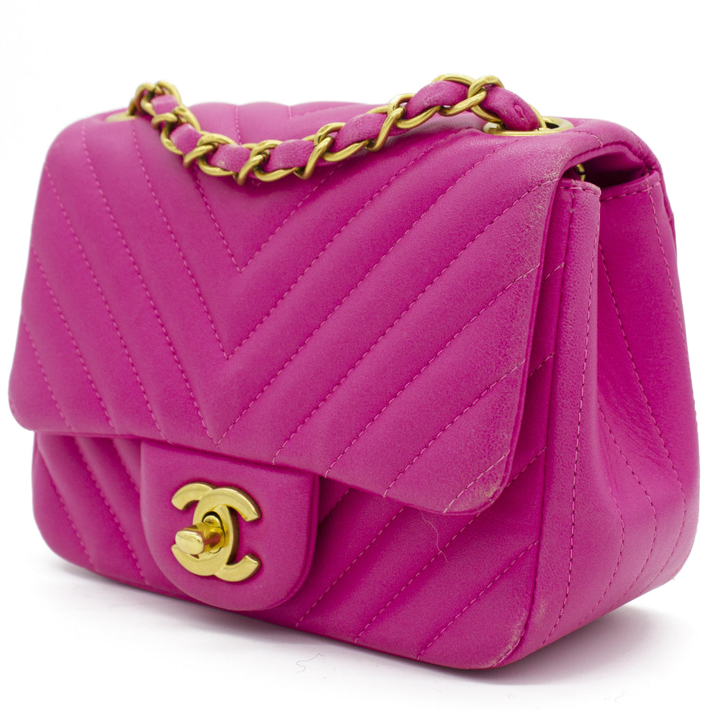| This gorgeous rose pink Chevron Quilted Lambskin Chanel Mini Flap Bag is the perfect everyday bag. Featuring a gorgeous chevron stitched leather with gold-tone hardware and a leather chain strap. This bag will get maximum use! The size is perfect for an everyday bag. |