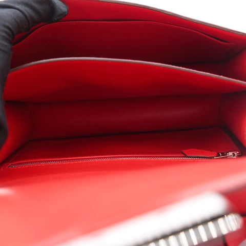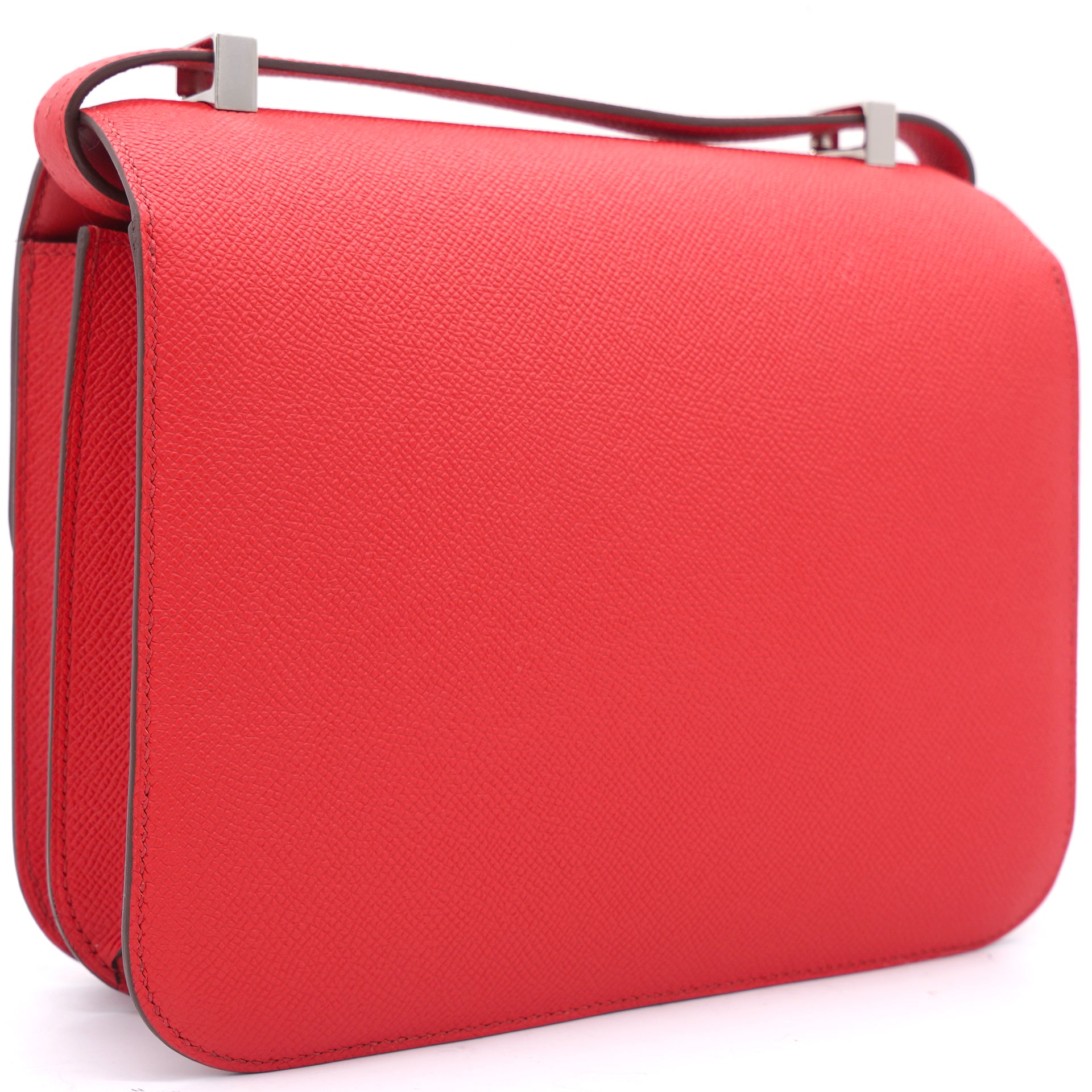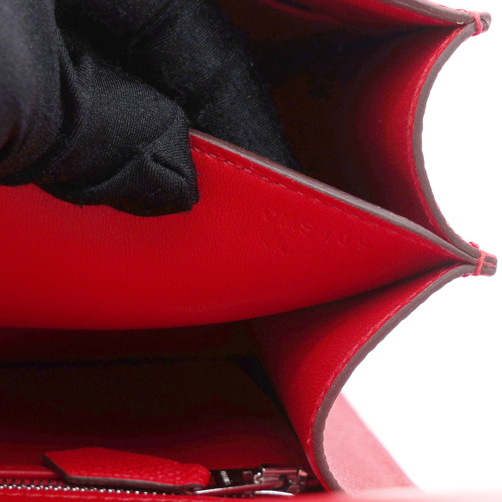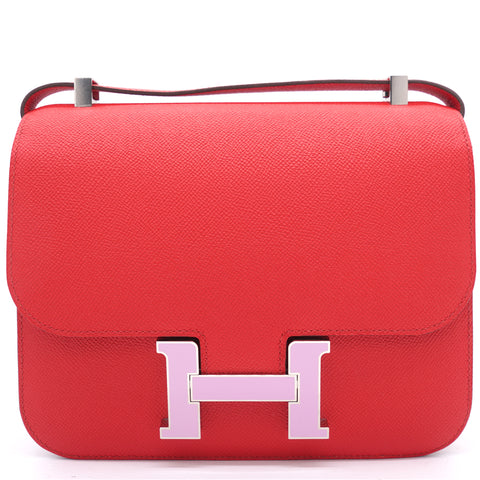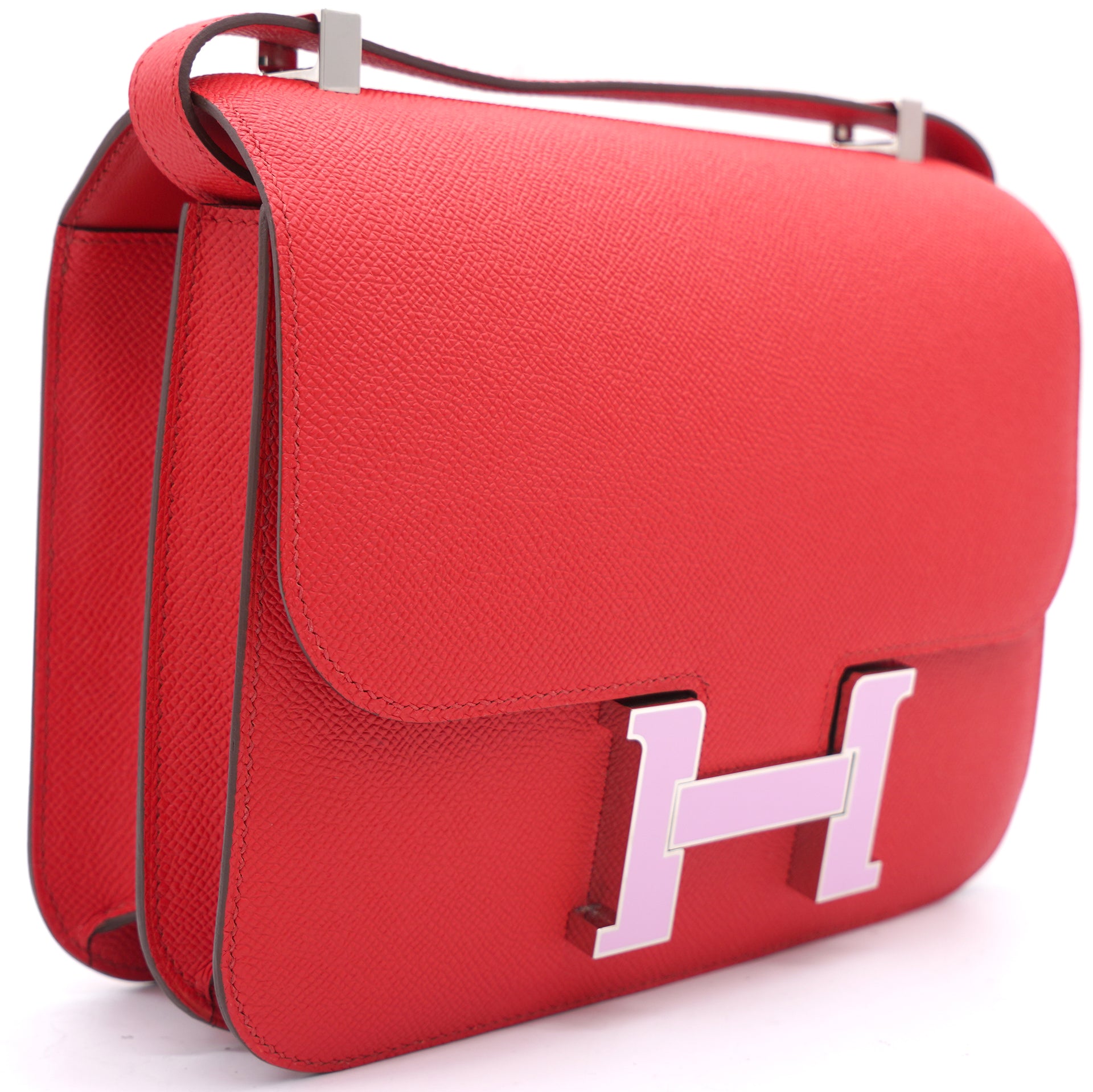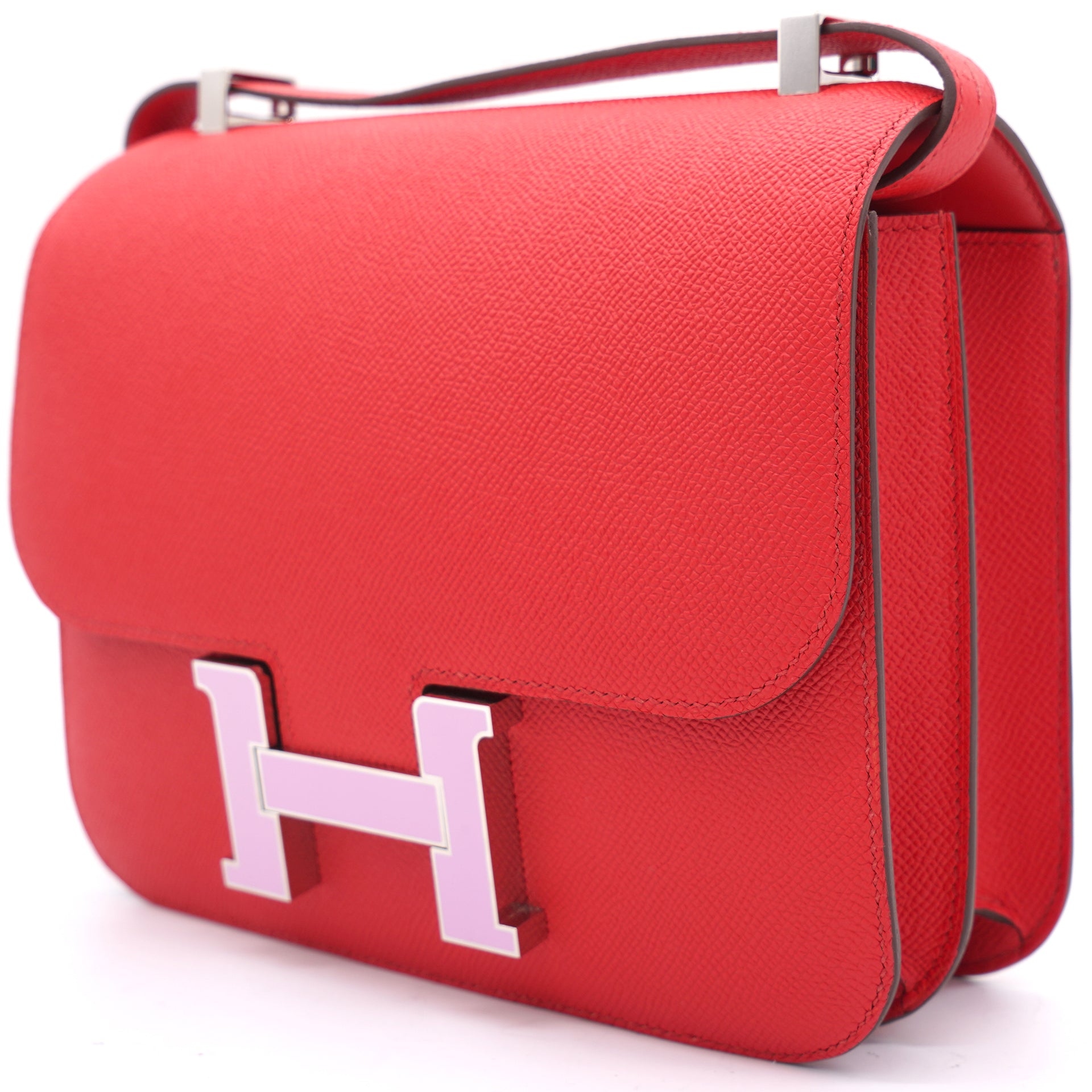 | This stylish shoulder bag is crafted of fine textured epsom calfskin leather in red. This chic bag features a uniquely constructed looping shoulder strap with polished palladium links and a top flap that tucks into a prominent H in palladium hardware and pink. This opens to a partitioned lambskin leather interior with a zipper and patch pocket. This is an excellent shoulder bag, ideal for everyday wear |