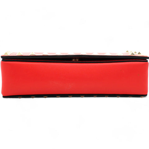 | This chic cross-body bag is beautifully crafted of finely textured leather in red. The bag features studded borders, a thin chain link shoulder strap and a full length front flap. This opens to a flap pocket and a matching red leather and fabric interior with a bill compartment, zipper pocket, and card slots. |