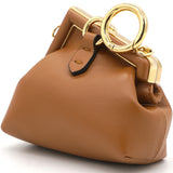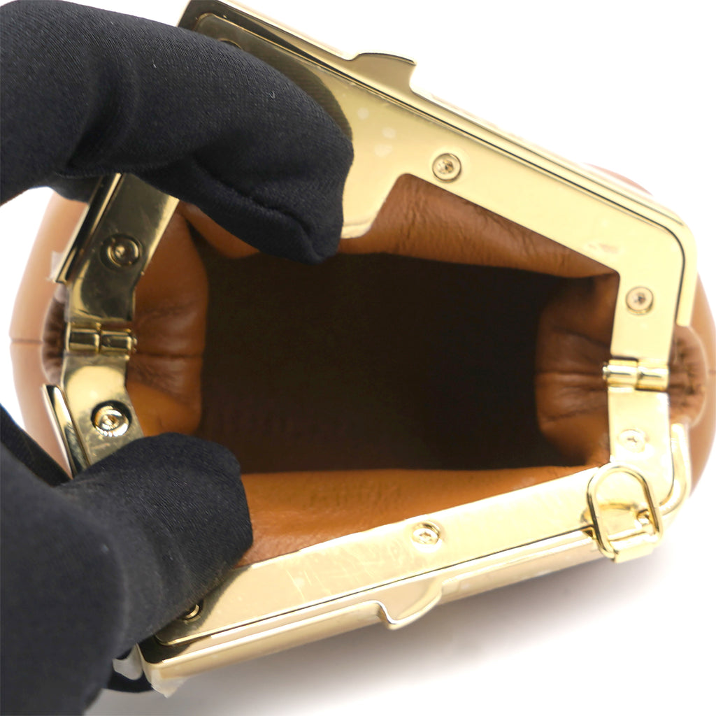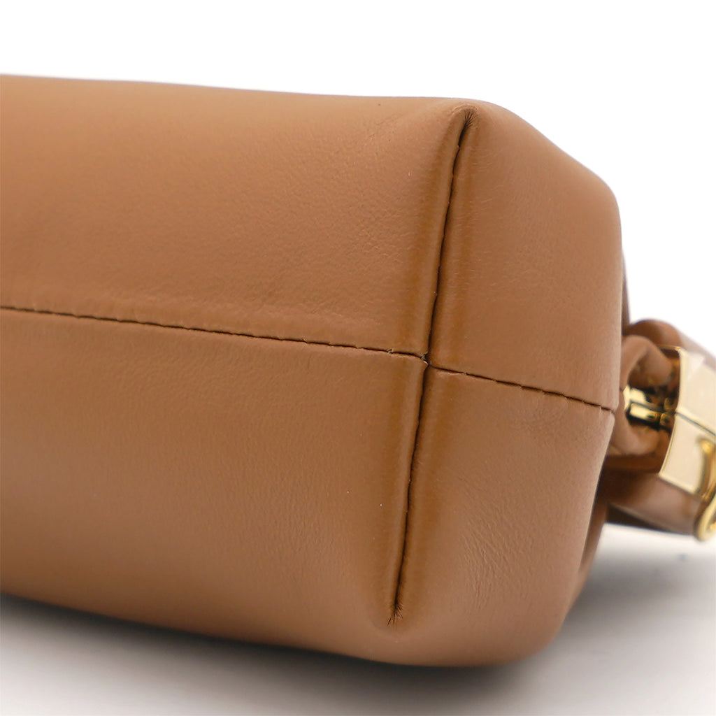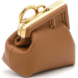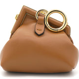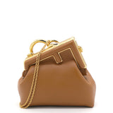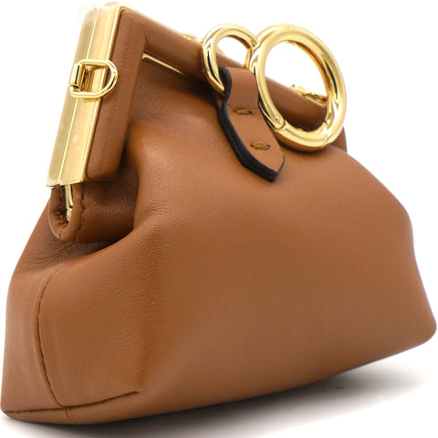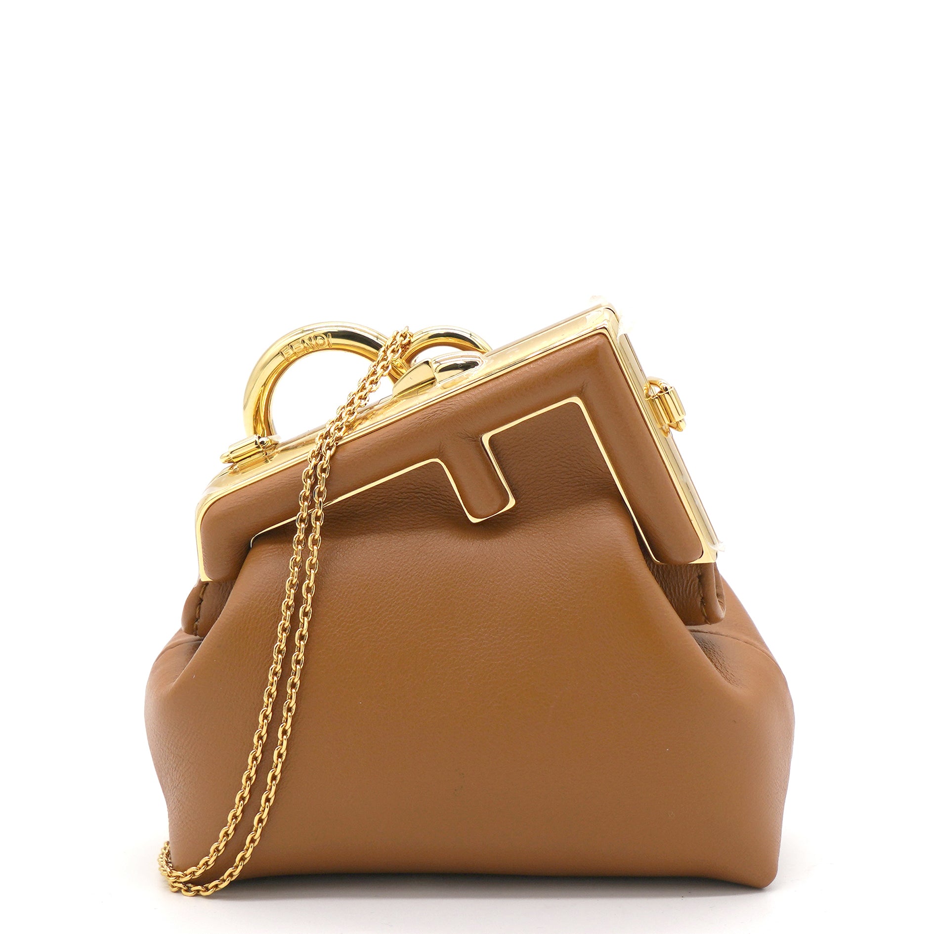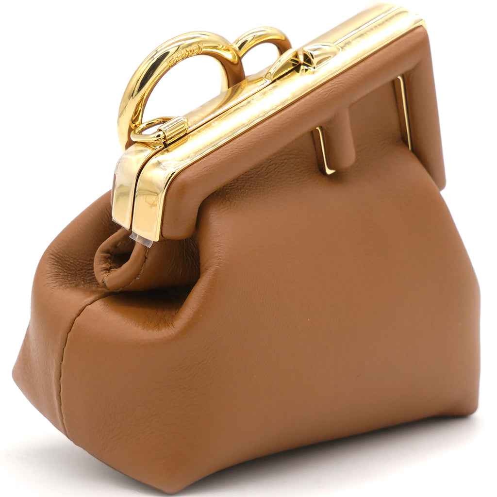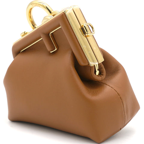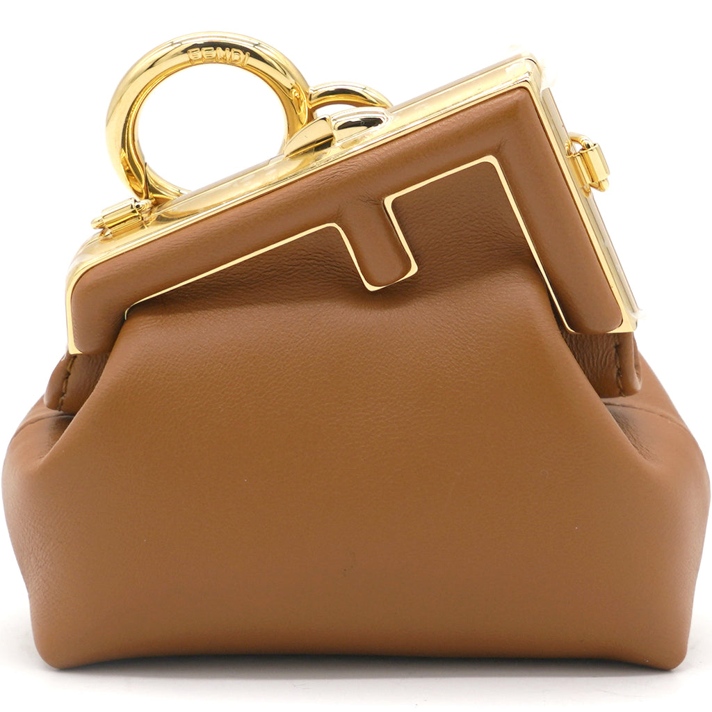 | Fendi First Nano bag, with diagonal FF clasp and clip at the back that allows it to be attached to larger bags or belts like a charm. It can also be worn cross-body thanks to the fine chain adjustable shoulder strap. It is the perfect shape to hold AirPods or AirPods Pro wireless earbuds. Made of brown nappa leather. Gold-finish metalware. |