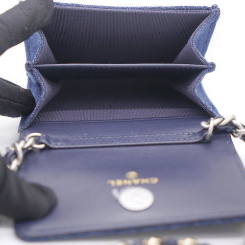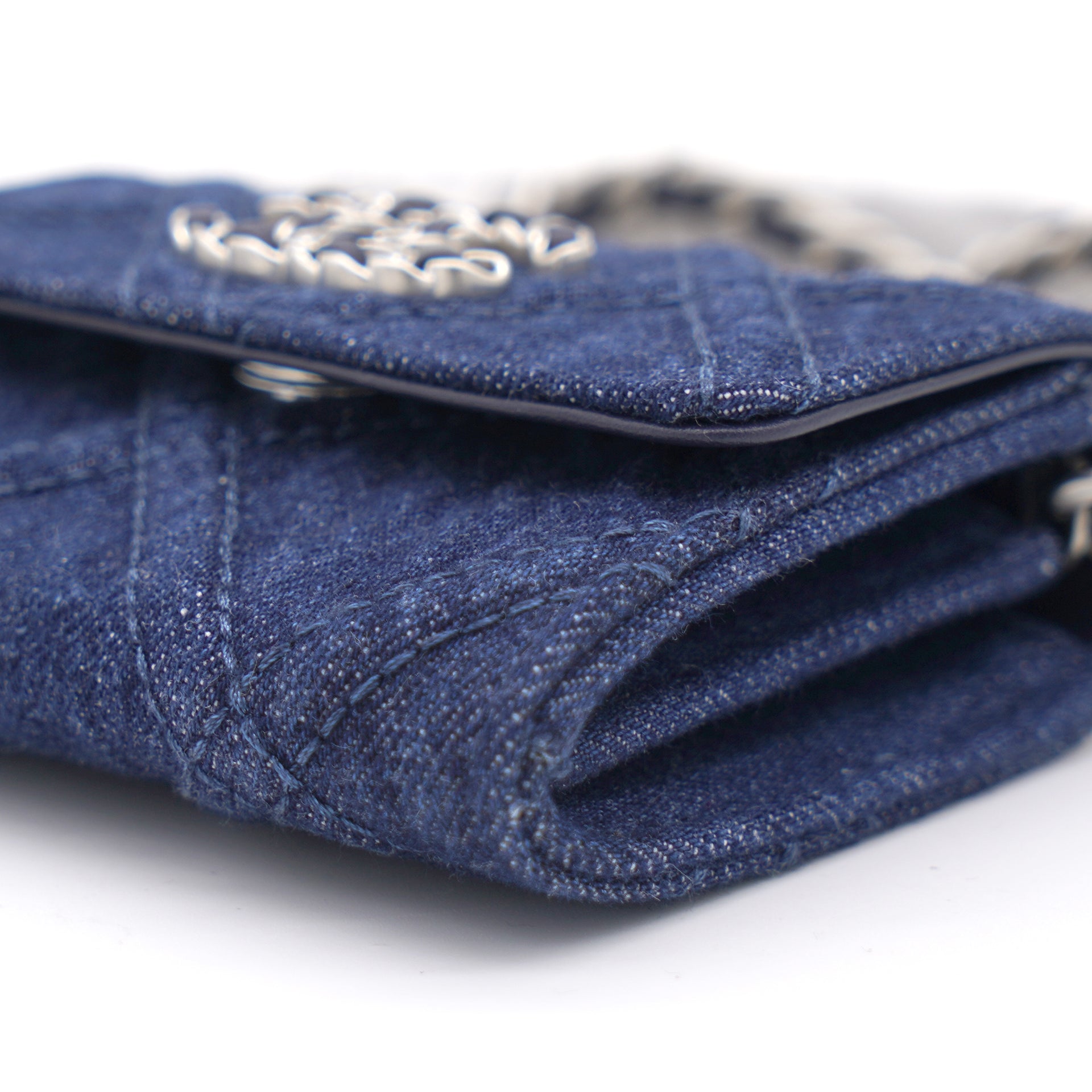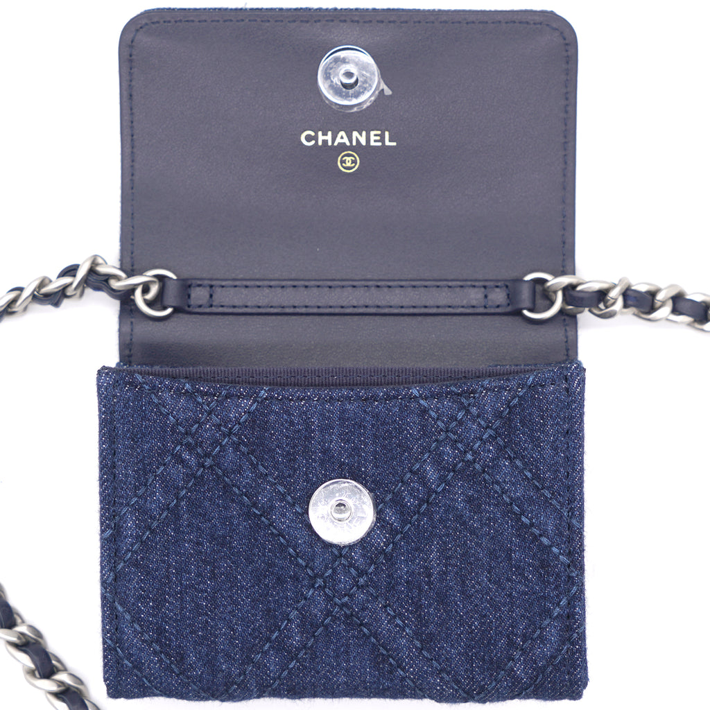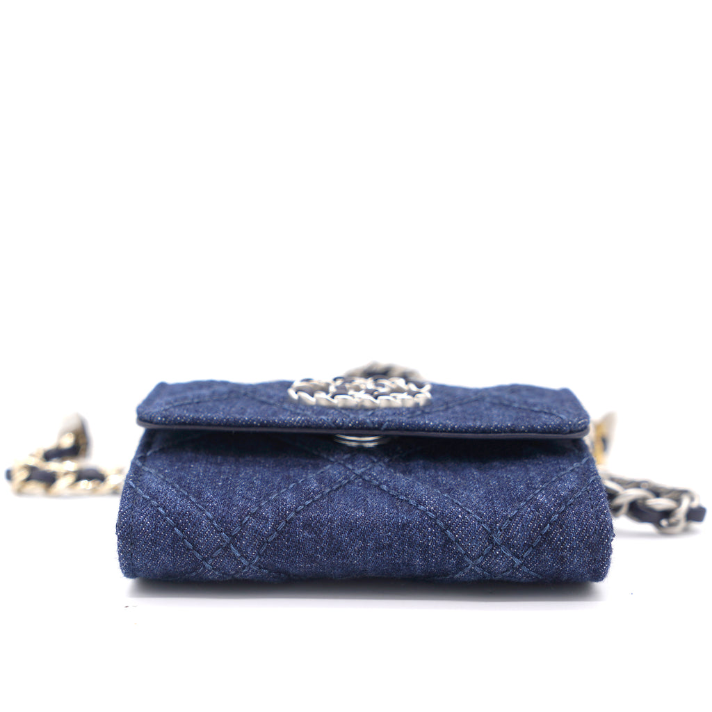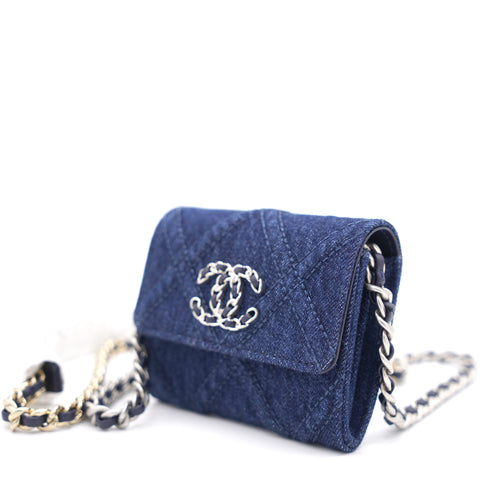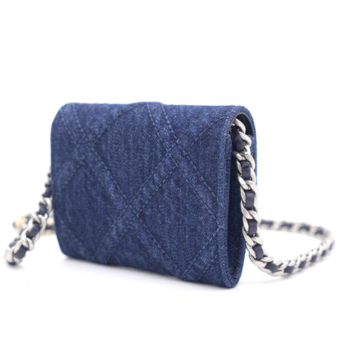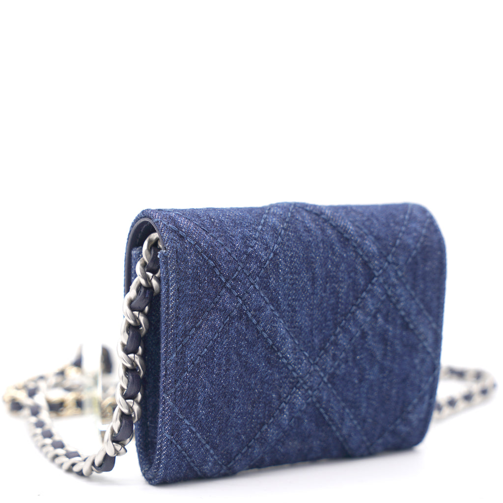 | Delivering on Chanel's heritage of excellence, this Chanel 19 Card Holder with Chain arrives in a classic design. Crafted from quilted denim, the bag features a shoulder chain in mixed metal and the brand's iconic CC detail in silver on the flap. The leather-fabric interior has card slots and open compartments for all your little essentials. |