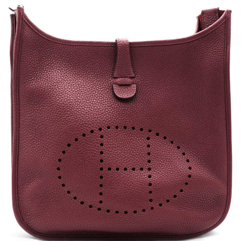 | This stylish messenger bag is crafted of a beautiful shade of pinkish red Taurillon Clemence calfskin leather and features an adjustable matching nylon shoulder strap. This bag is detailed with palladium silver hardware, a rear pocket, and a perforated Hermes H oval on the face of the bag. The top of the bag opens with a cross over strap to a suede interior. |