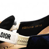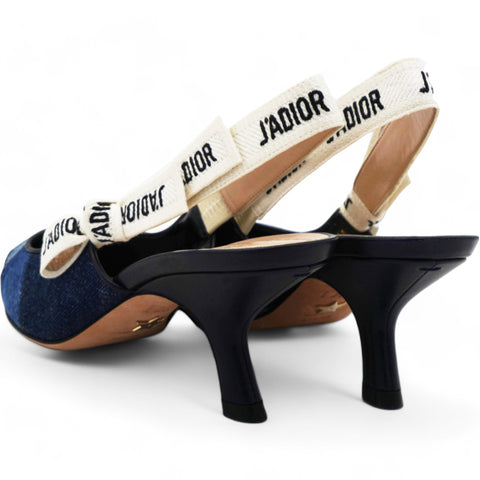 | These shoes are crafted of blue denim and feature a white embroidered J'ADIOR logo ribbon and pointed toes with a three inch leather heel. These are elegant pumps for a one of a kind look from CHRISTIAN DIOR! |