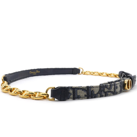 | This lovely belt is crafted of blue Dior monogram fabric and smooth calfskin leather on the reverse and features an aged gold Dior buckle. |