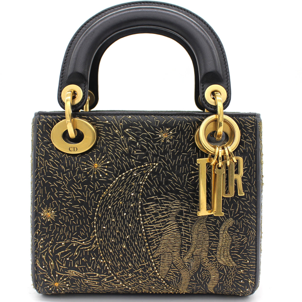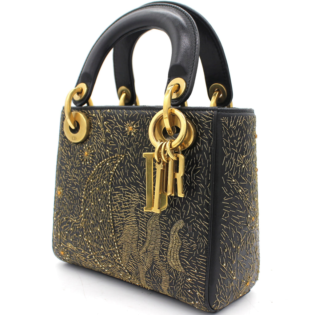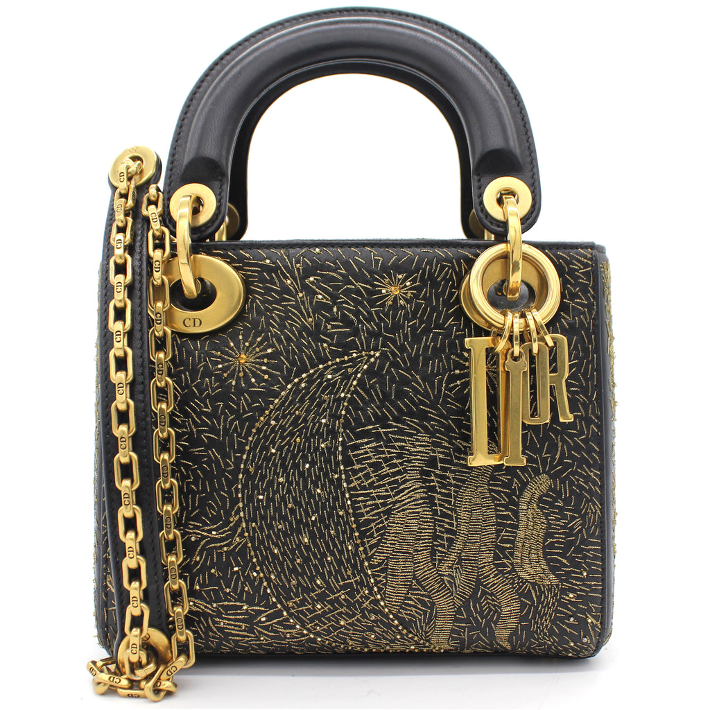 | From the Fall/Winter 2017 Collection by Maria Grazia Chiuri, the The moon in my eyes Lady Dior Bag is designed with gold but notable yellow threads. It’s also crafted with the new modern DIOR charm and vintage golden hardware, featuring rolled handles and adjustable shoulder strap. |