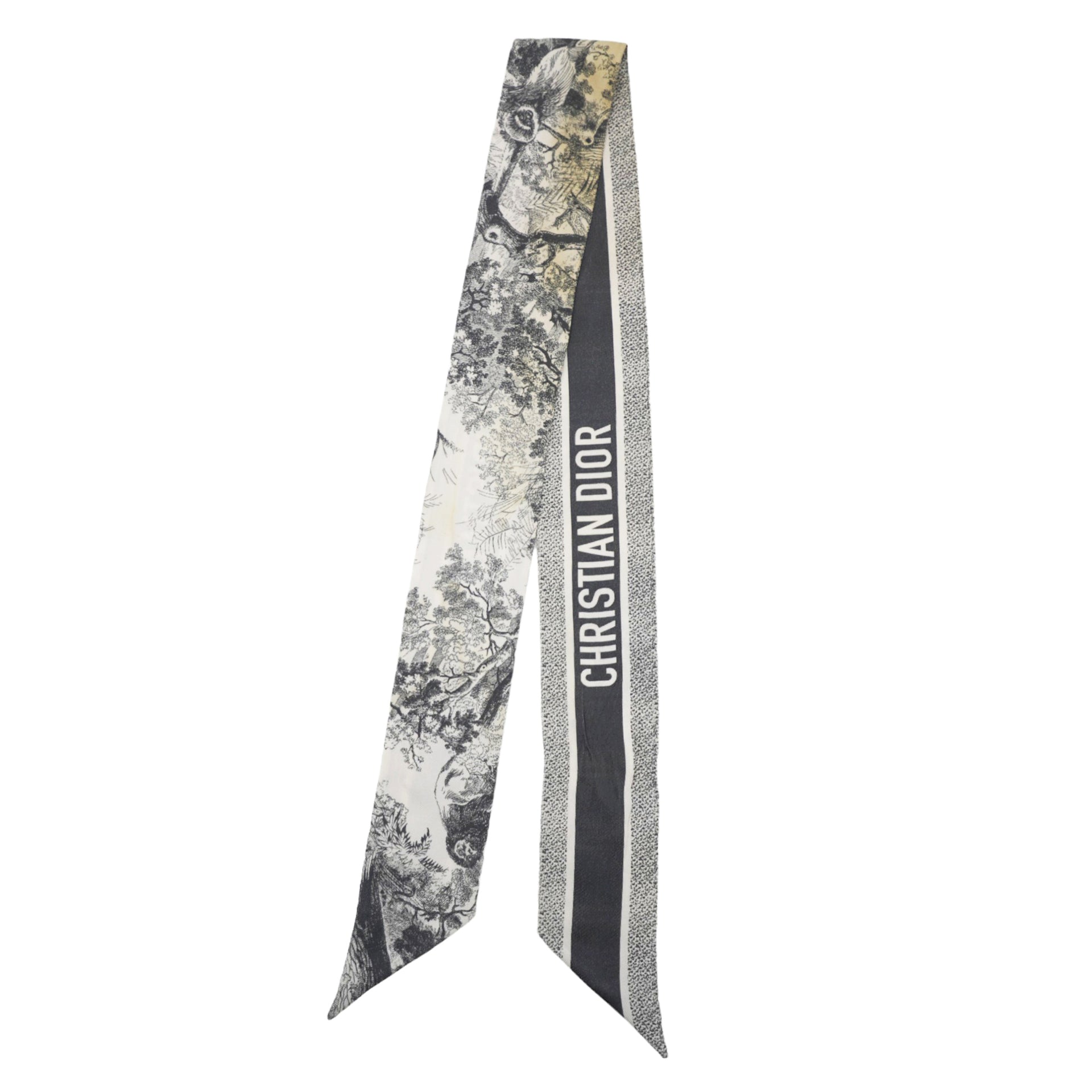 | This is an authentic CHRISTIAN DIOR Silk Toile De Jouy Reverse Capri Mitzah Scarf in Navy Blue. This 100% silk scarf features a moth and animal motif on a blue background. |