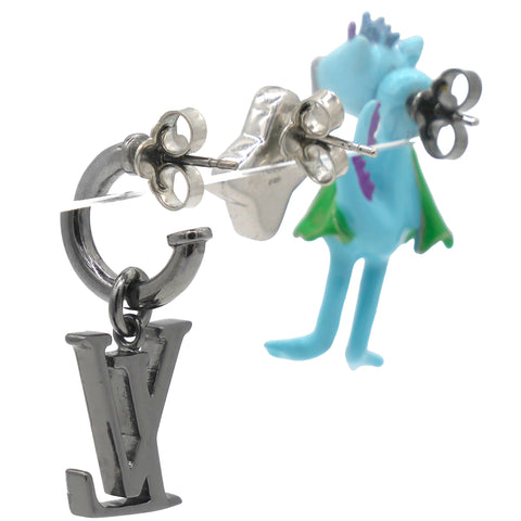 | These are authentic LOUIS VUITTON Enamel Palladium Earrings in Multicolor. This charming set of 3 earrings features a prominent signature Louis Vuitton LV logo in checkered black and white, a blue enamel dragon, and a monogram flower with lilac colored crystals. |
