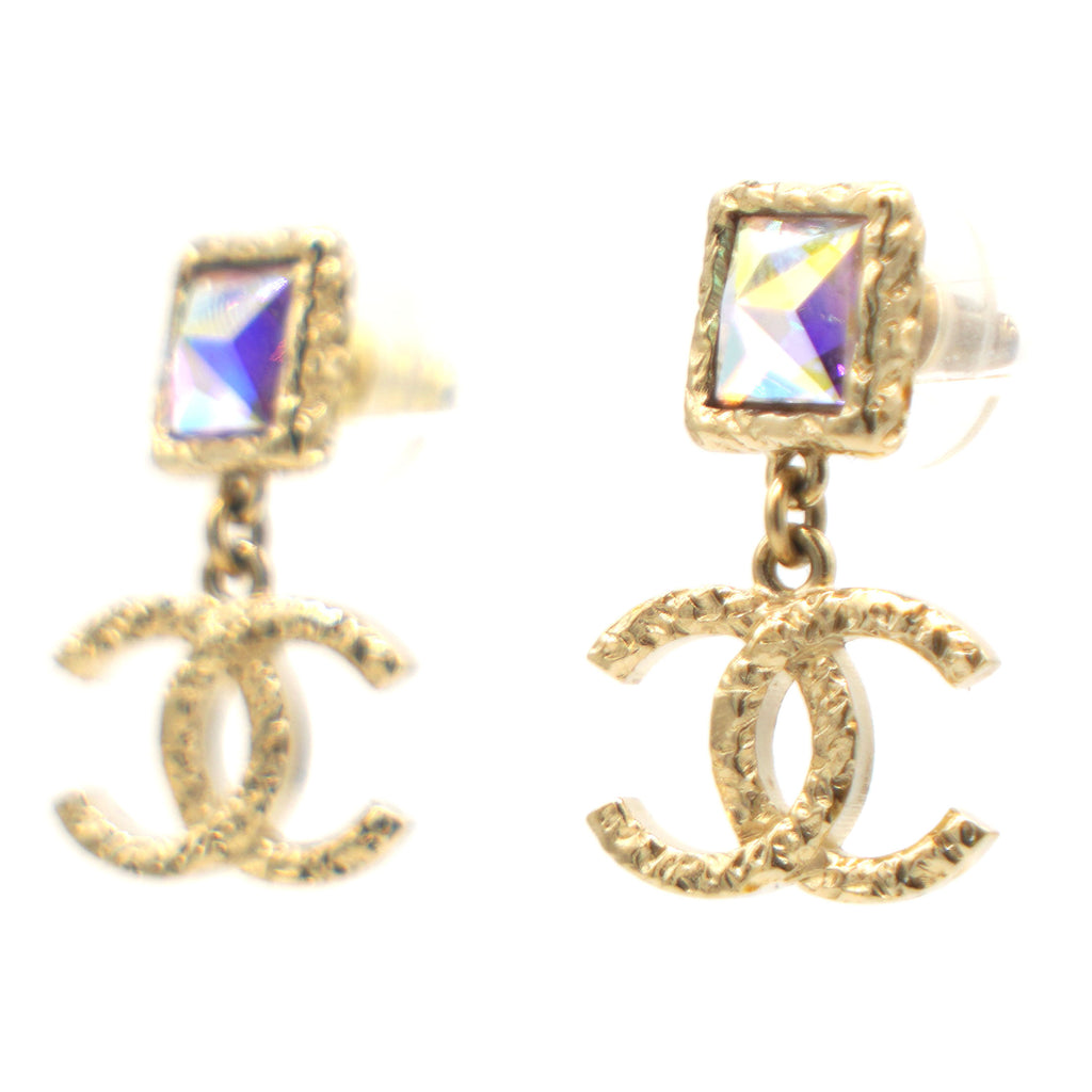| These classy earrings feature a crystal drop pendant set in polished gold metal with a crystal-lined CC logo suspended below. |