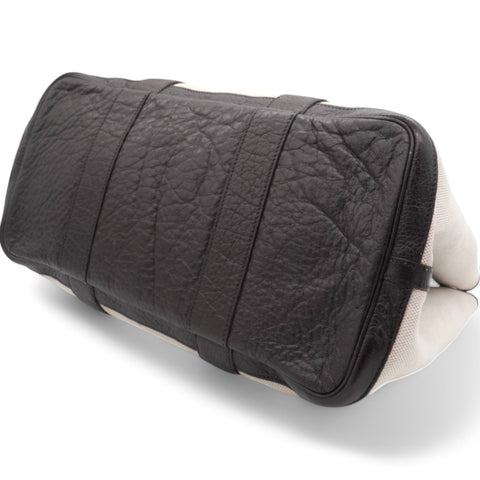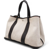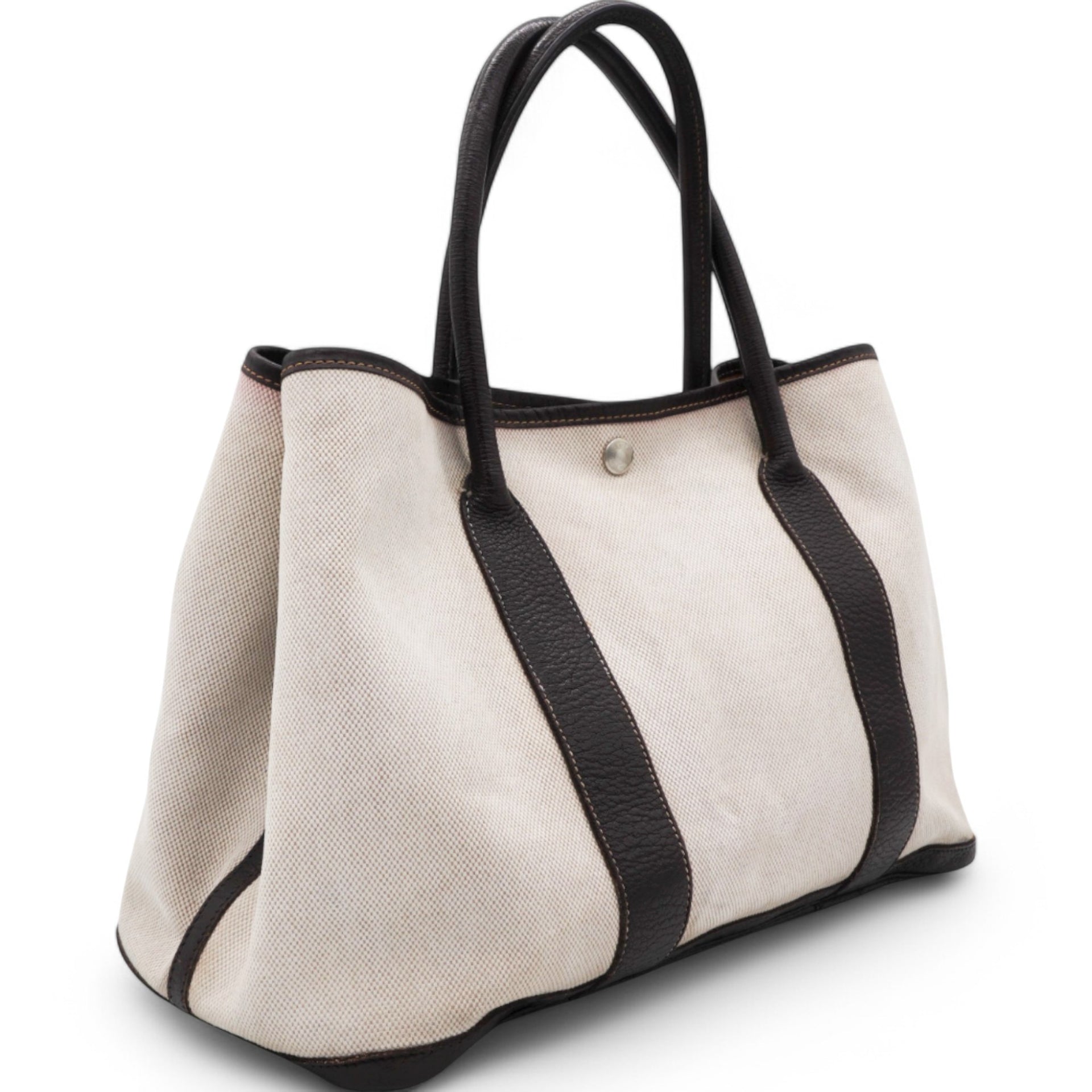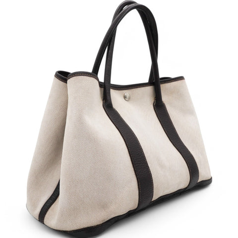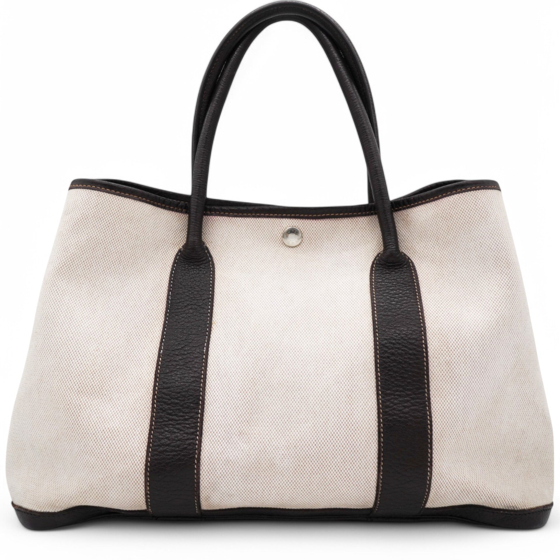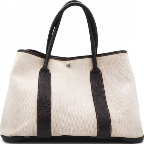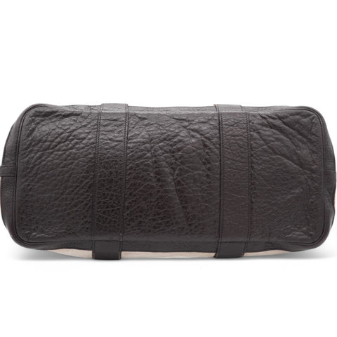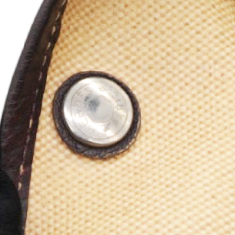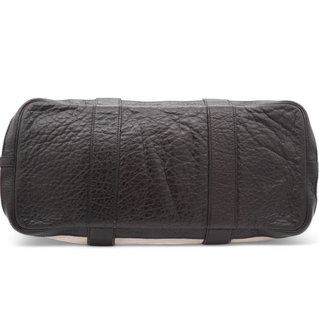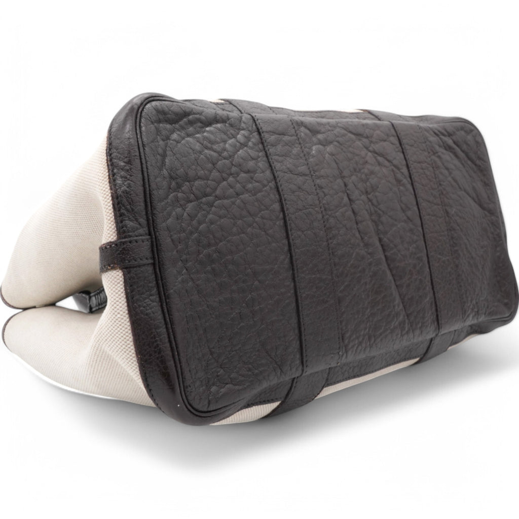 | This stylish and useful tote is crafted of light beige toile canvas and brown leather. The tote features rolled leather top handles, expandable sides, and polished palladium snap closures. |