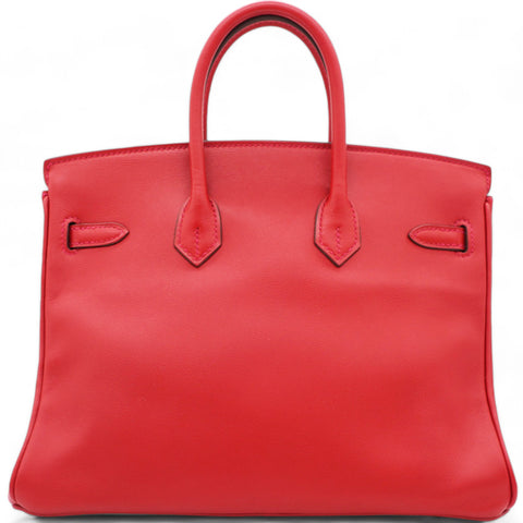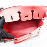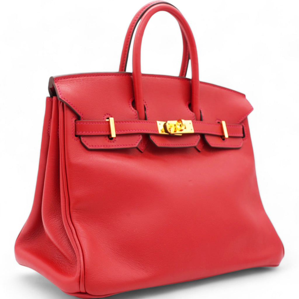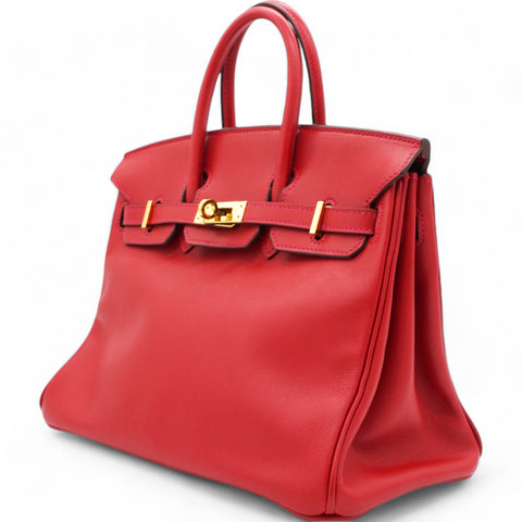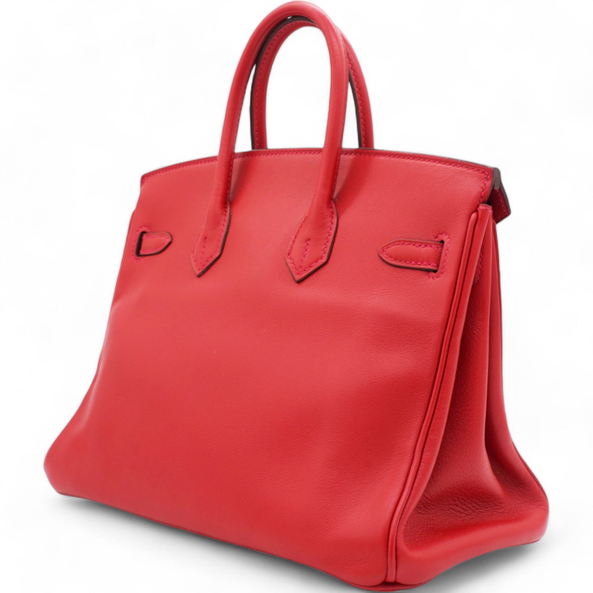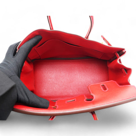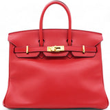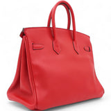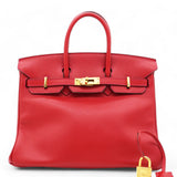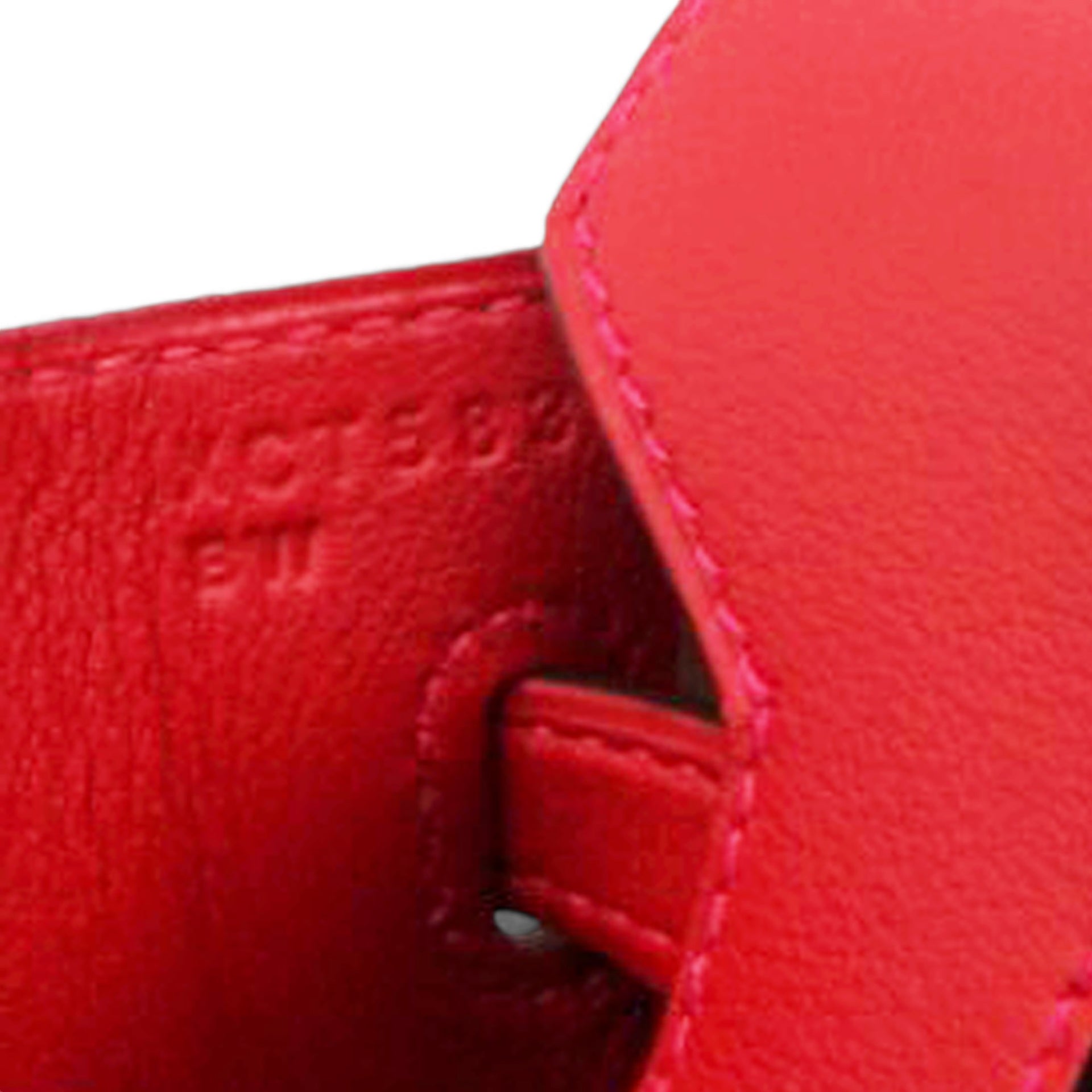 | This classic handbag is beautifully crafted of supple swift leather with a fine grain in red. The bag features rolled leather top handles, a front flap and strap closure with gold hardware. This opens to a matching matte red leather interior with zipper and patch pockets. |