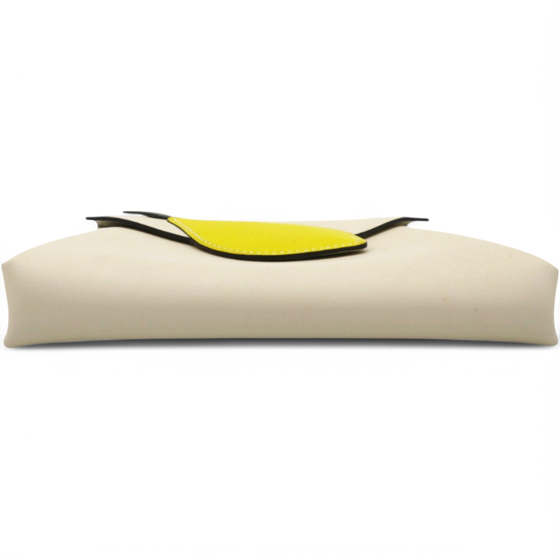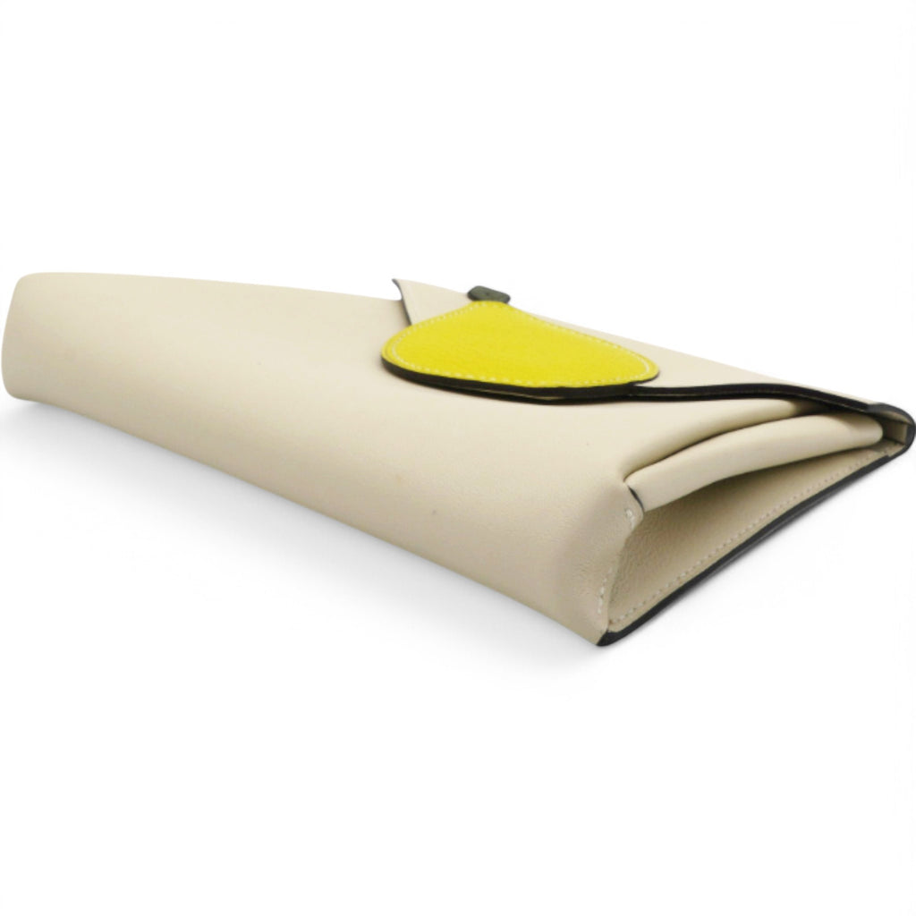 | This chic bag is crafted of smooth calfskin leather in ivory.A prominent yellow goatskin leather lemon on the front flap. The bag snaps open to a smooth ivory leather interior with a patch pocket. This is a stylish handbag, suitable for everyday use, only from Hermes! |